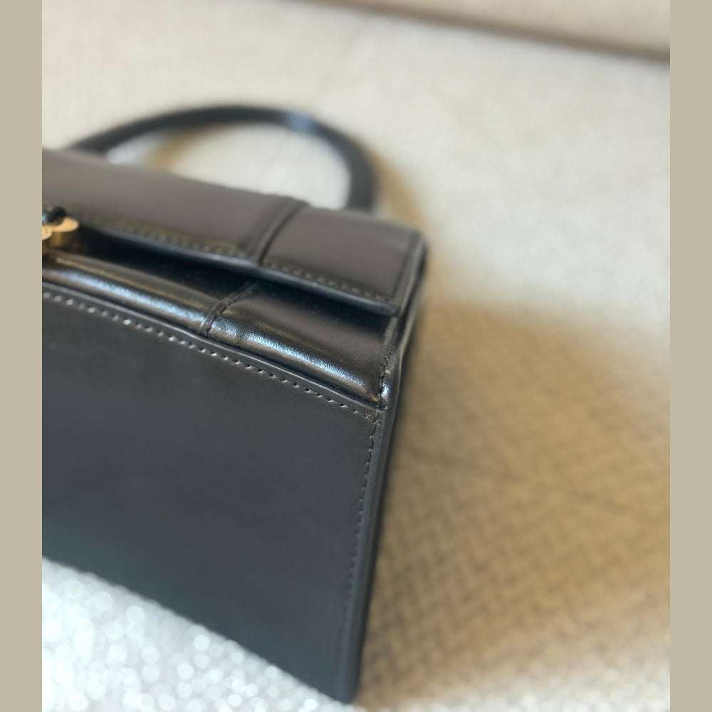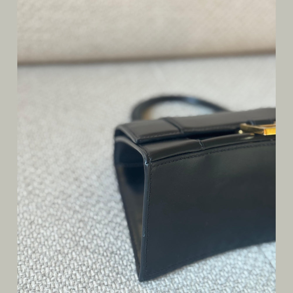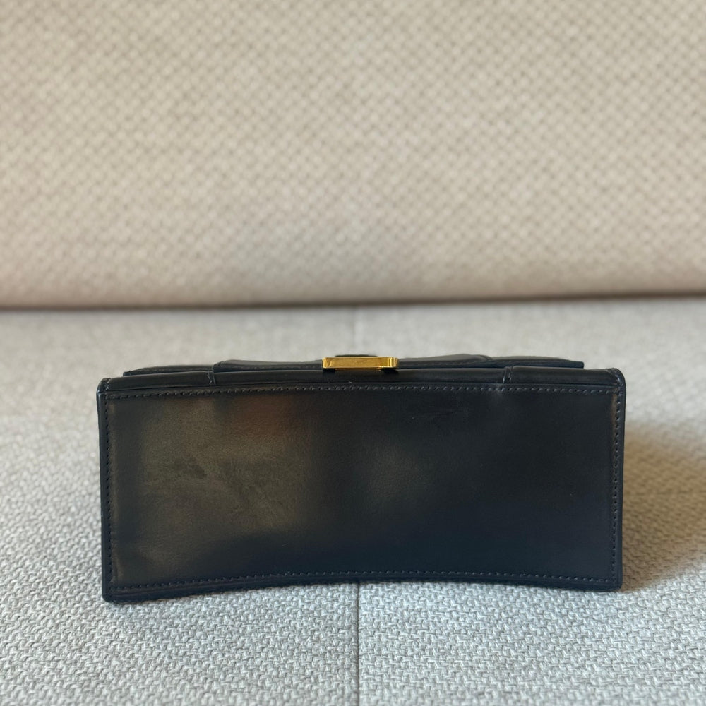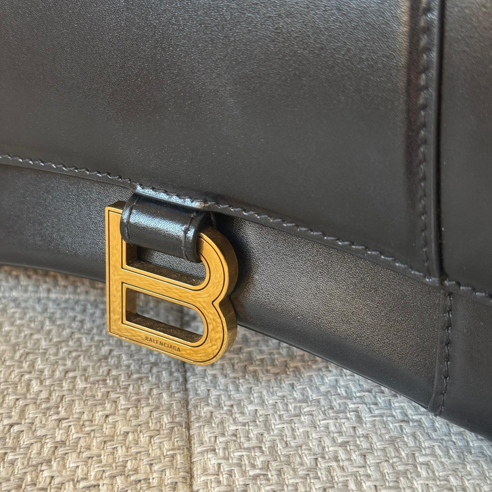 A true statement of modern structure and bold identity, the Balenciaga Hourglass bag is instantly recognizable for its sculptural curved silhouette and architectural lines. Crafted in smooth black leather and finished with the iconic gold “B” logo hardware, this piece embodies contemporary elegance with a distinctive edge. Designed to elevate both day and evening looks, it remains one of the house’s most coveted signatures.
