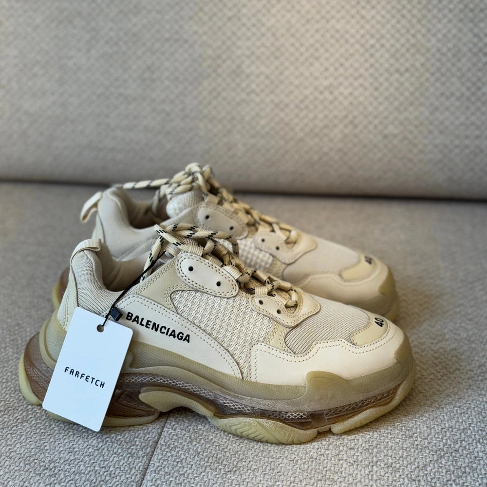 An iconic silhouette in the world of luxury streetwear, the Balenciaga Triple S sneakers feature a chunky layered sole, mesh and leather panels, and bold 40-size embroidery on the toe. This pair comes in a versatile white colorway, complete with original dust bag and extra laces.