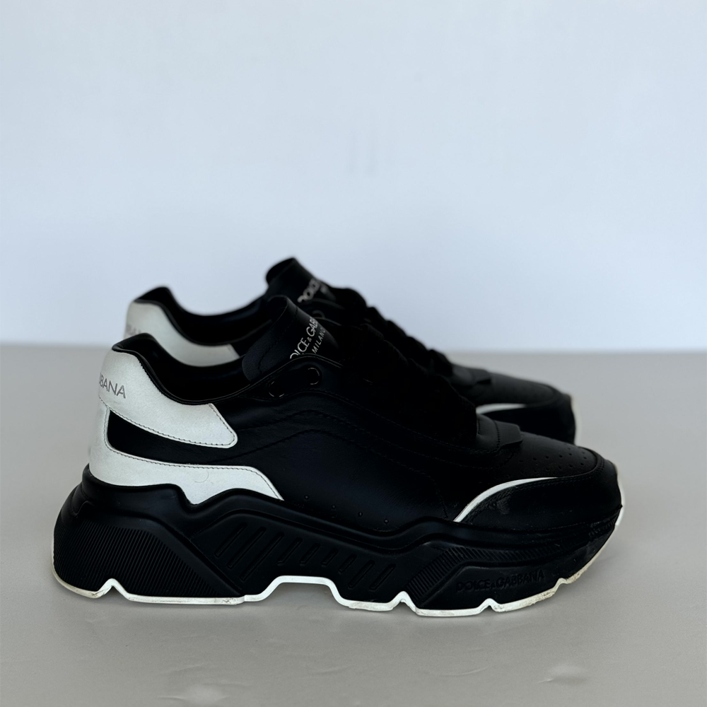 Black And White Leather Oversized Sneakers With Back Logo Detail, Black Oversized Sole. Comes in Excellent condition with no inclusion.