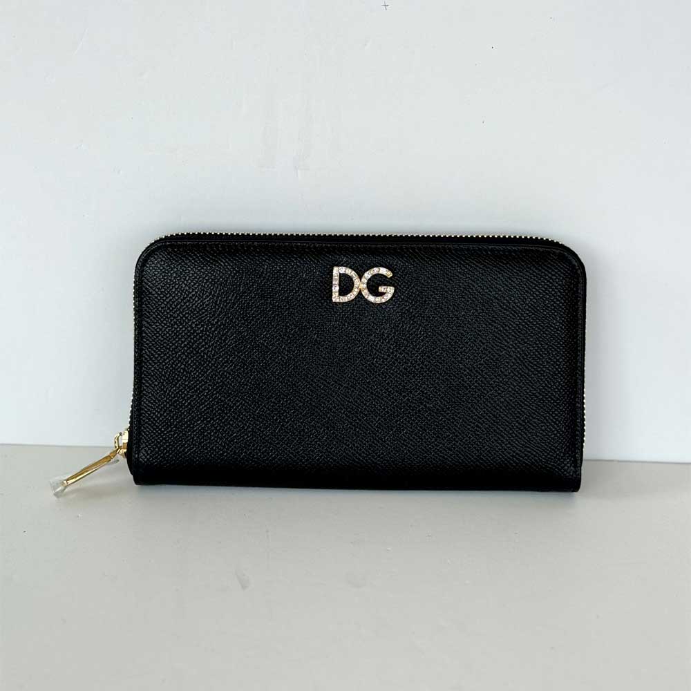 Black grained leather zip around wallet, front DG Swarovski embellished logo, 1 exterior open slip pocket, gold hardware, 3 interior compartments, 1 interior zipped pocket, 12 card slots, 2 interior open pockets. Comes in Brand New condition with dust bag, box & card included.