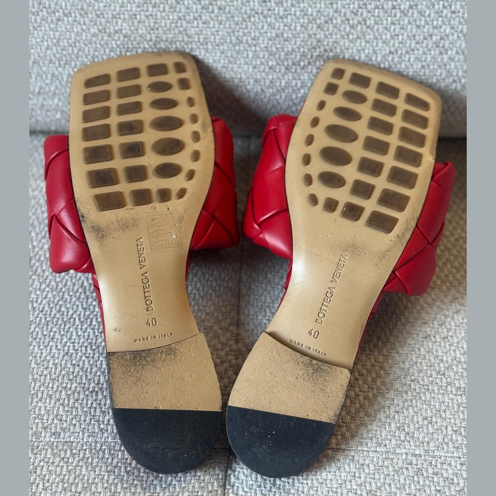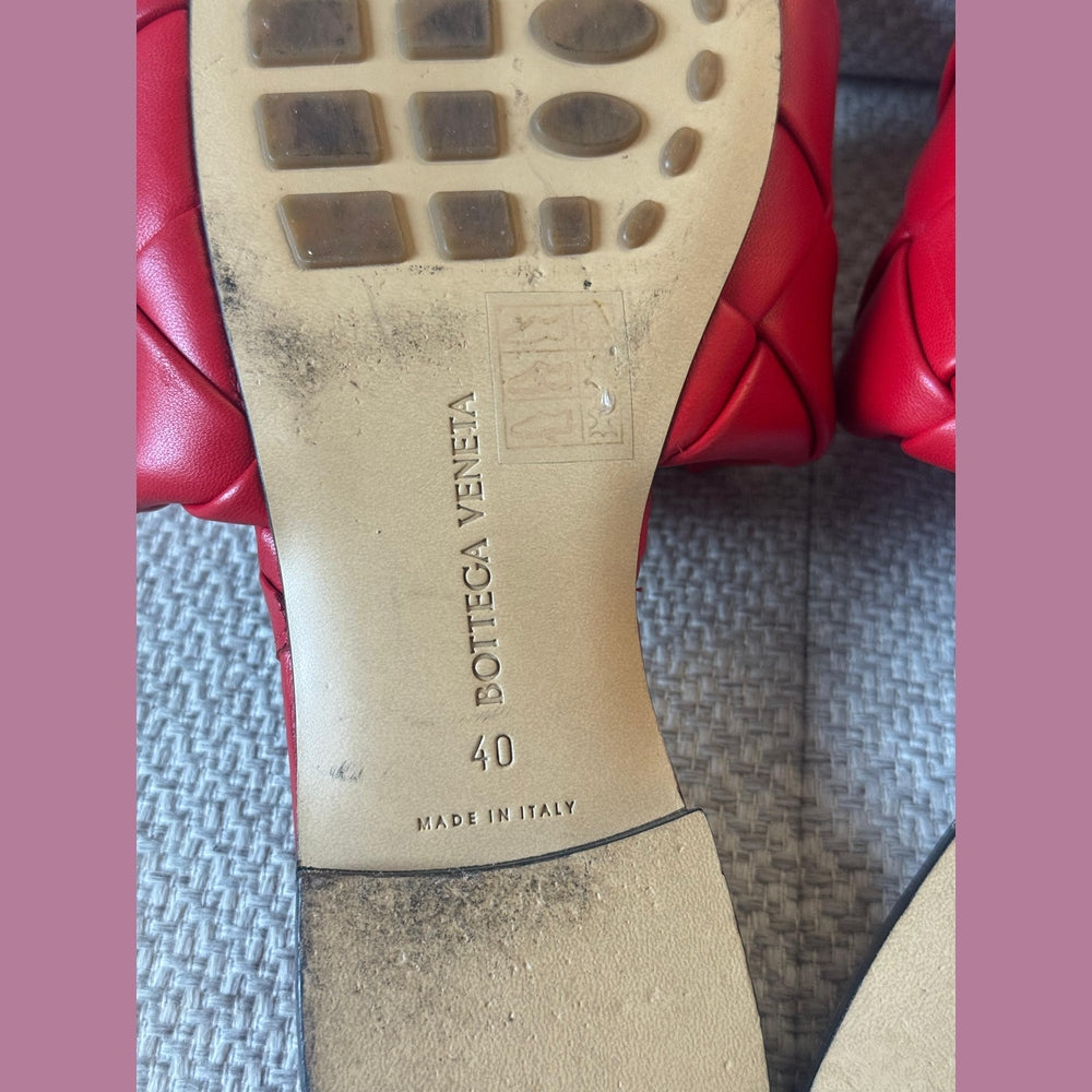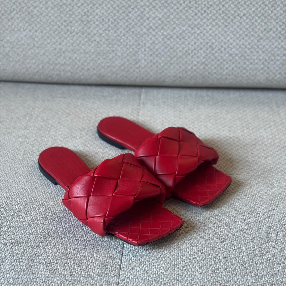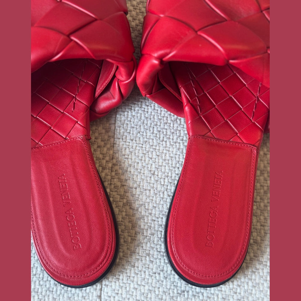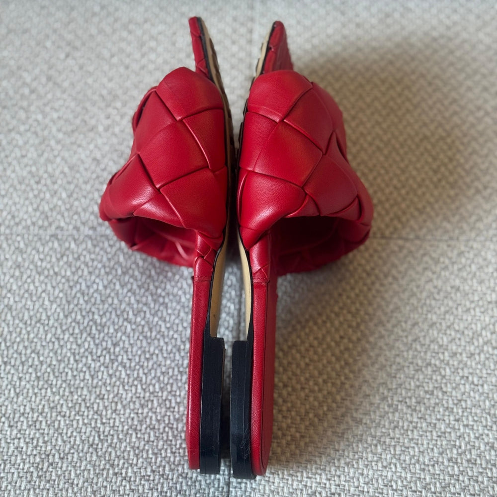Effortlessly refined and instantly recognizable, these Bottega Veneta Lido flat sandals showcase the House’s iconic Intrecciato craftsmanship in a striking red leather finish. Minimal yet bold, this design reflects Bottega Veneta’s modern approach to luxury—where craftsmanship speaks louder than logos. A timeless summer staple that elevates both casual and resort looks with understated confidence.