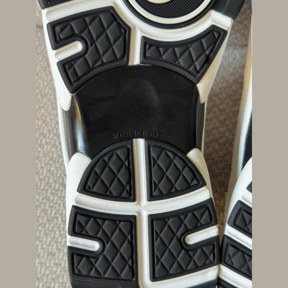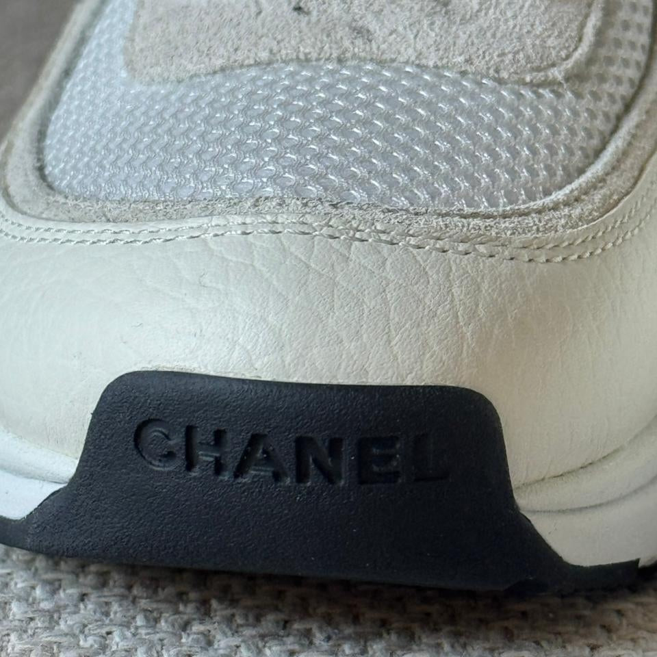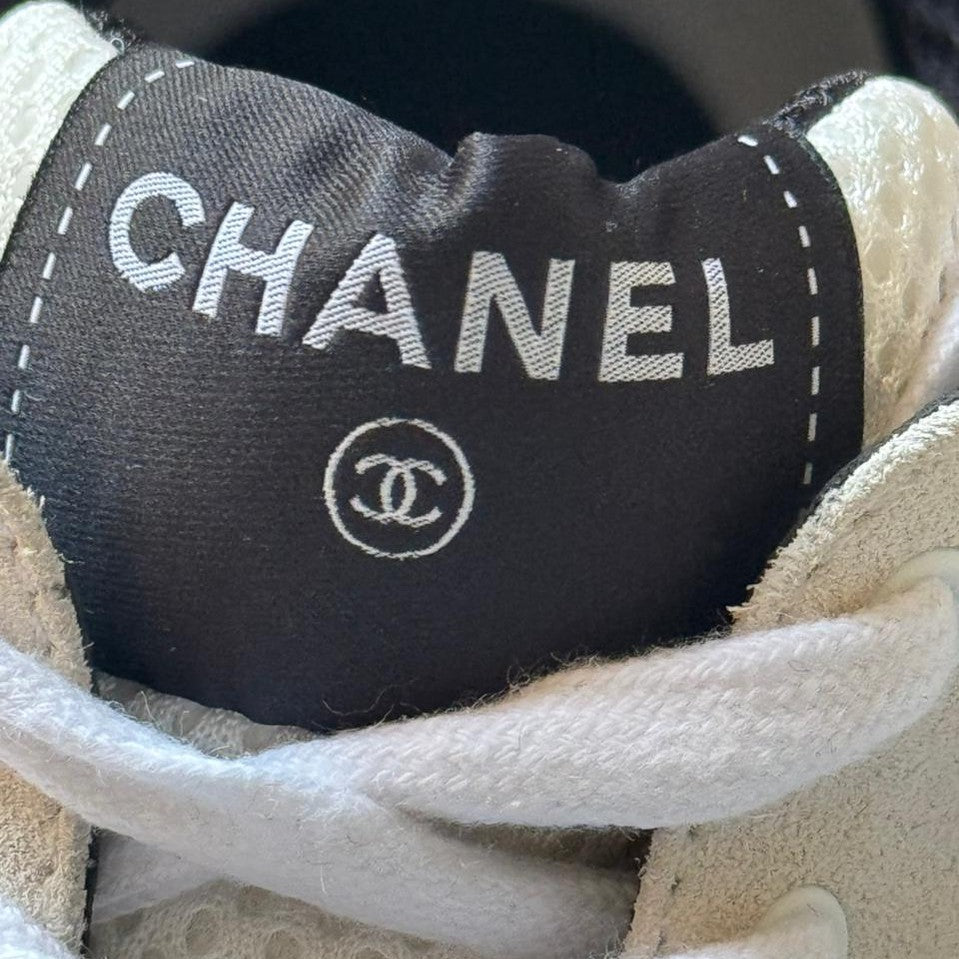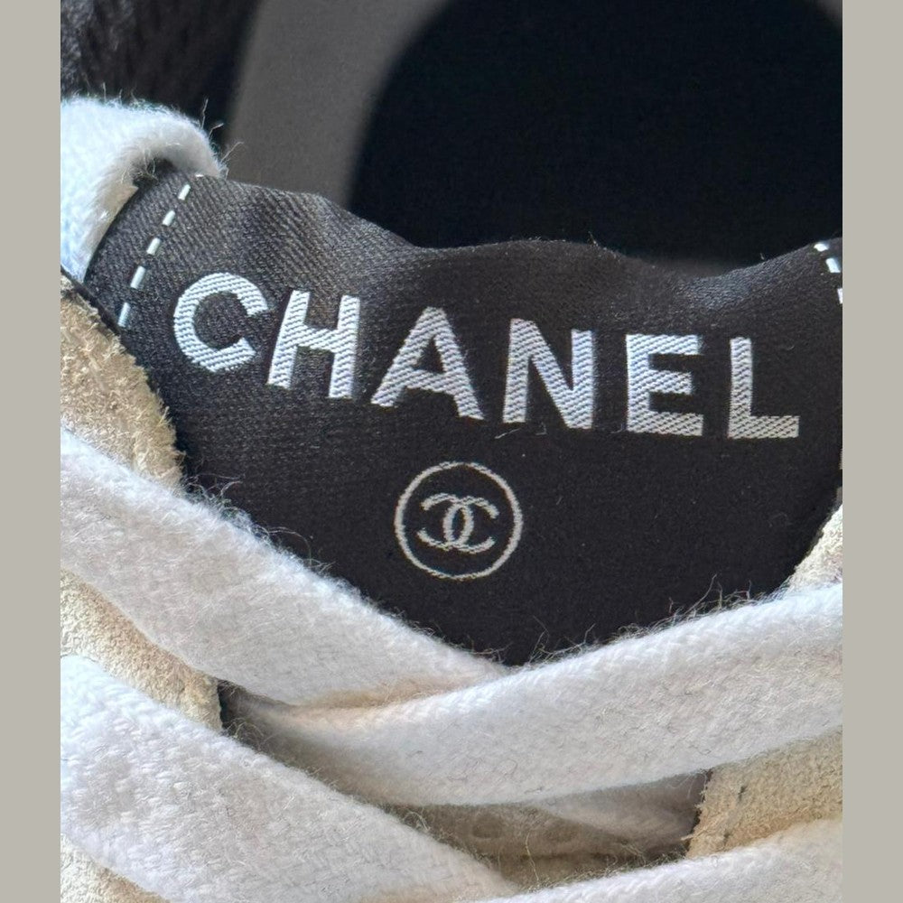 Elevate your everyday look with these chic Chanel sneakers crafted from a mix of supple calfskin leather and breathable mesh. The beige upper is beautifully contrasted with black accents and the iconic oversized CC logo on the side, adding a touch of luxury to a sporty silhouette.