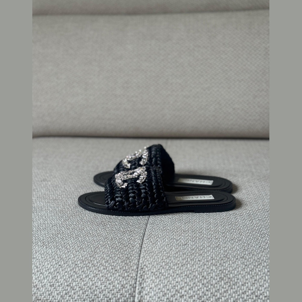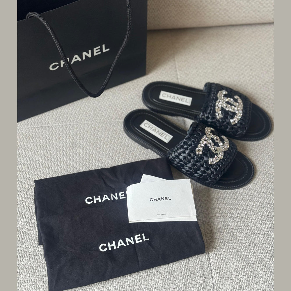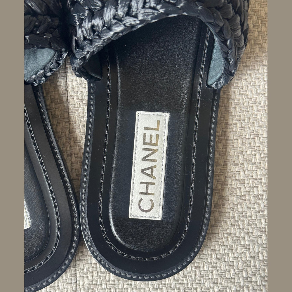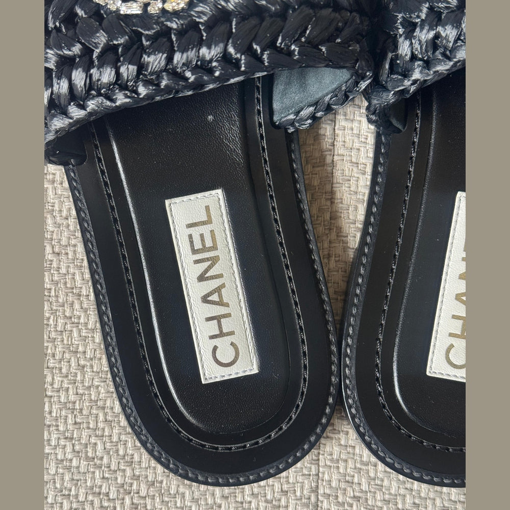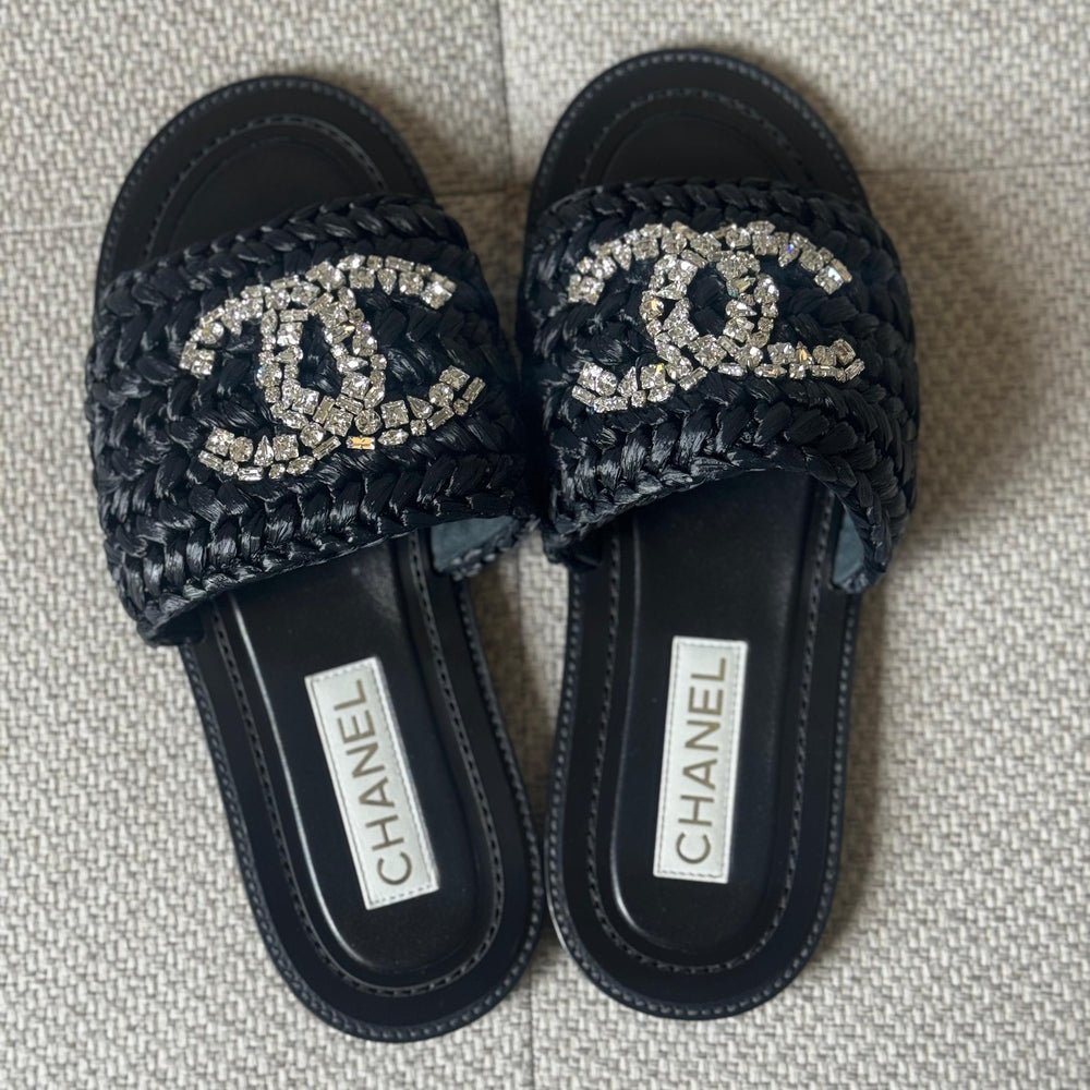 A refined summer essential from Chanel, these flat sandals feature a black raffia upper adorned with the iconic crystal-embellished CC logo. Effortlessly elegant yet comfortable, they are designed for warm-weather styling with a timeless luxury finish.