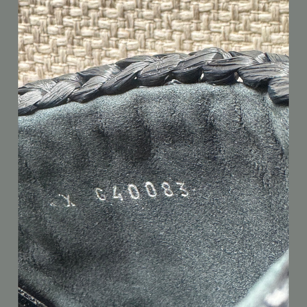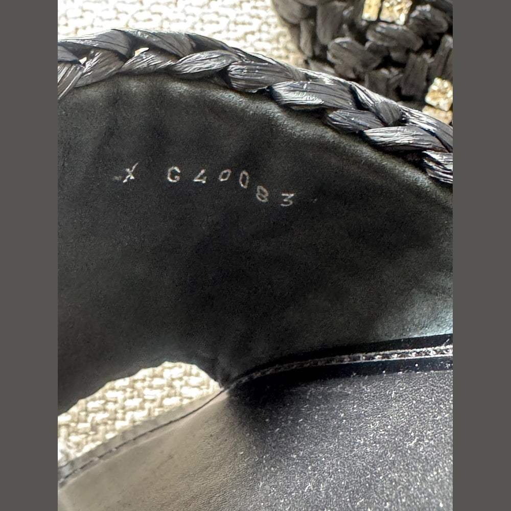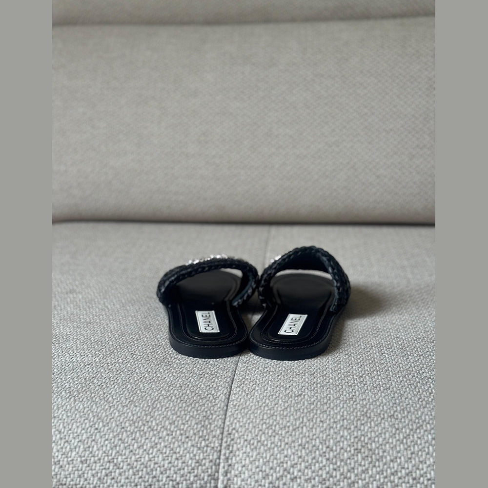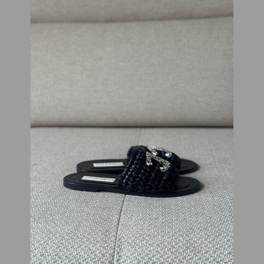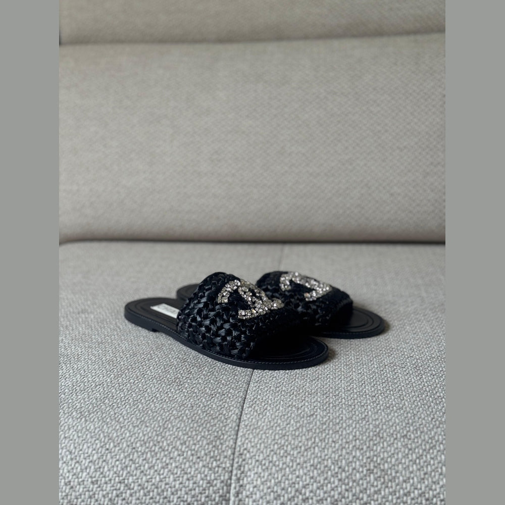 A refined summer essential from Chanel, these flat sandals feature a black raffia upper adorned with the iconic crystal-embellished CC logo. Effortlessly elegant yet comfortable, they are designed for warm-weather styling with a timeless luxury finish.