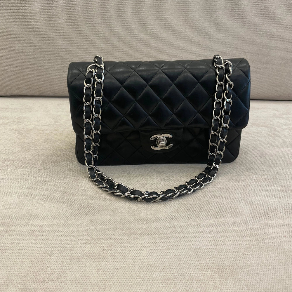 An icon of timeless elegance, the Chanel Medium Classic Double Flap Bag is crafted in luxurious black lambskin leather with the signature diamond quilting. This sophisticated piece features silver hardware, including the iconic interlocking CC turn-lock closure and leather-woven chain strap. The double flap design enhances structure and security while maintaining the bag’s elegant silhouette. Perfectly sized for day to night versatility, this coveted classic embodies the enduring allure of Chanel’s heritage and craftsmanship. Comes with dustbag and entrupy certificate.