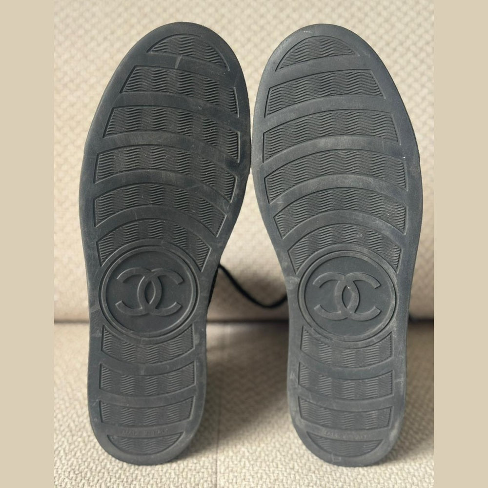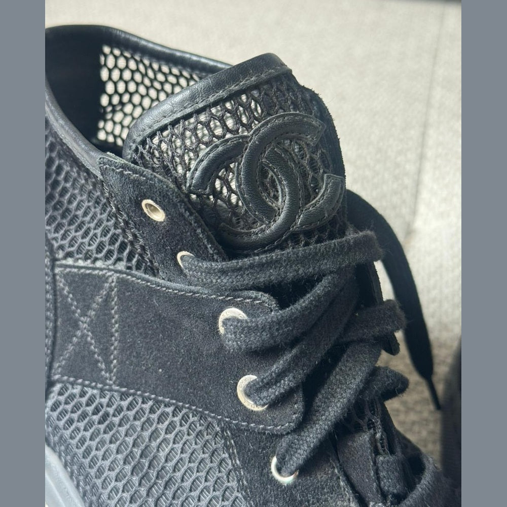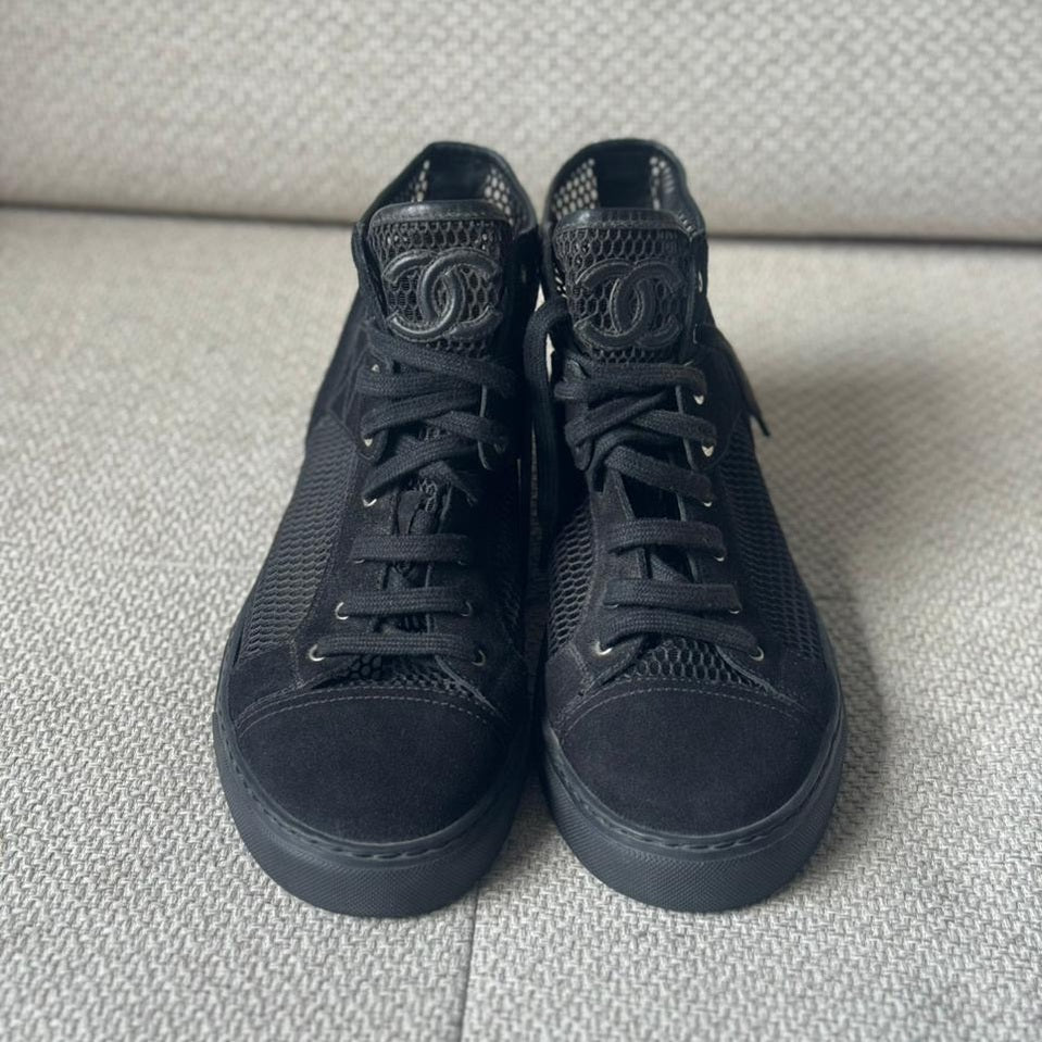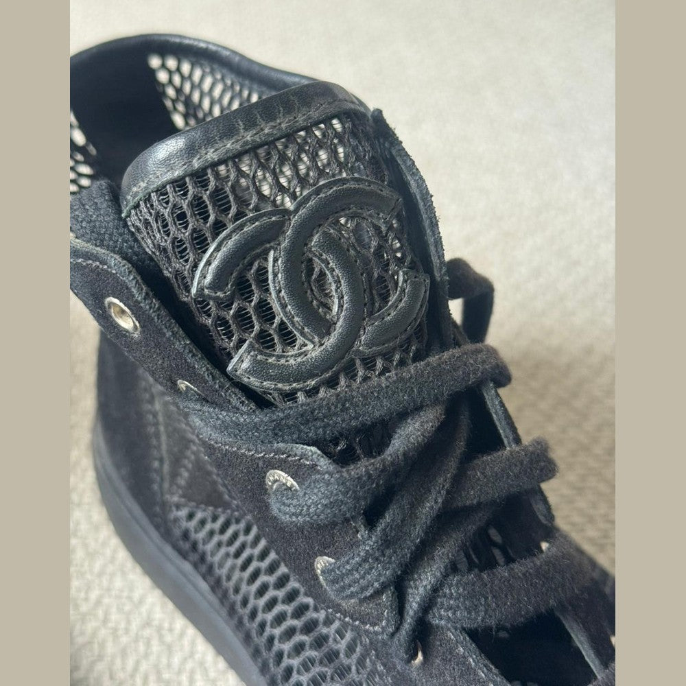 Step into Parisian elevated casual with these Chanel Black Mesh & Suede High Top Sneakers — where street style meets couture refinement. Designed with breathable mesh and luxurious suede accents, these sneakers offer all-day comfort with unmistakable Chanel DNA. The clean black palette and silver-tone CC detailing make them exceptionally versatile — perfect for styling with tailored trousers, denim, or athleisure looks.