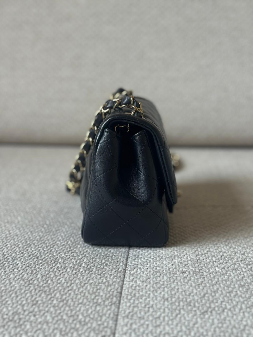 A timeless icon of the House of Chanel, the Mini Classic Flap embodies refined elegance in its purest form. Crafted in classic black quilted leather, this compact yet statement-making piece is defined by its structured silhouette, signature quilting, and enduring versatility.