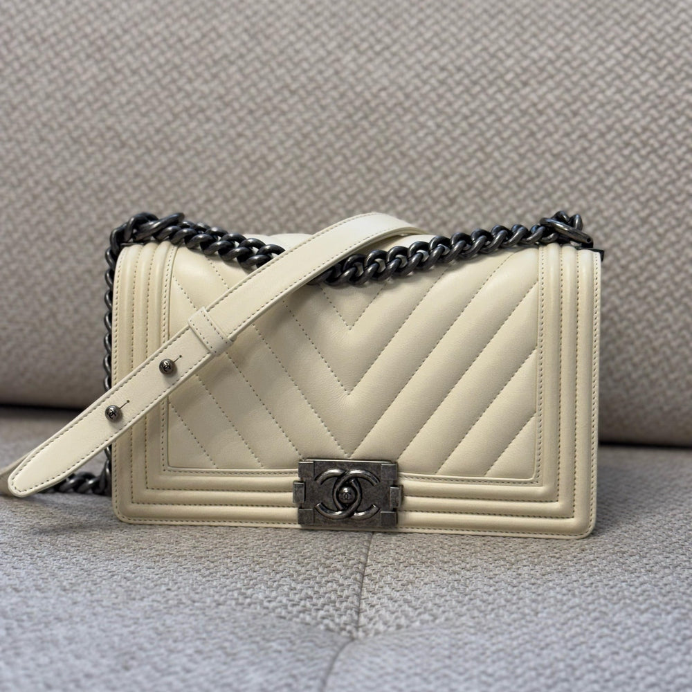 Experience luxury and sophistication with our Chanel Chevron Medium Boy. Its striking white design is complemented by brushed silver hardware, with CC Buckle, and light grey fabric lining exuding elegance and style. Crafted with precision and attention to detail, this bag is a statement piece that will elevate any outfit. Comes with dustbag and card.