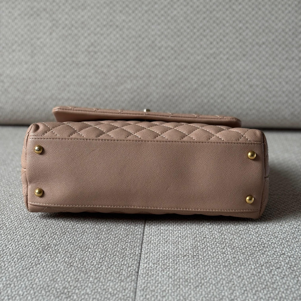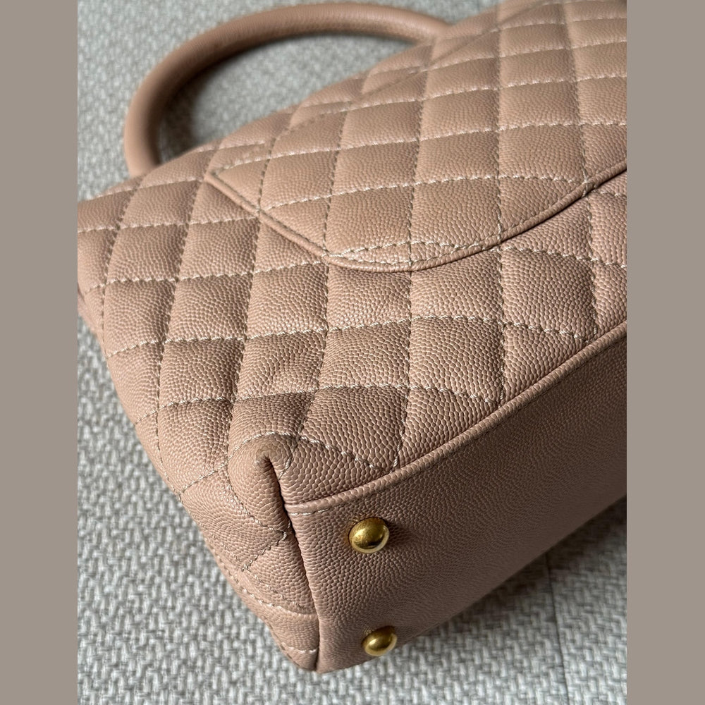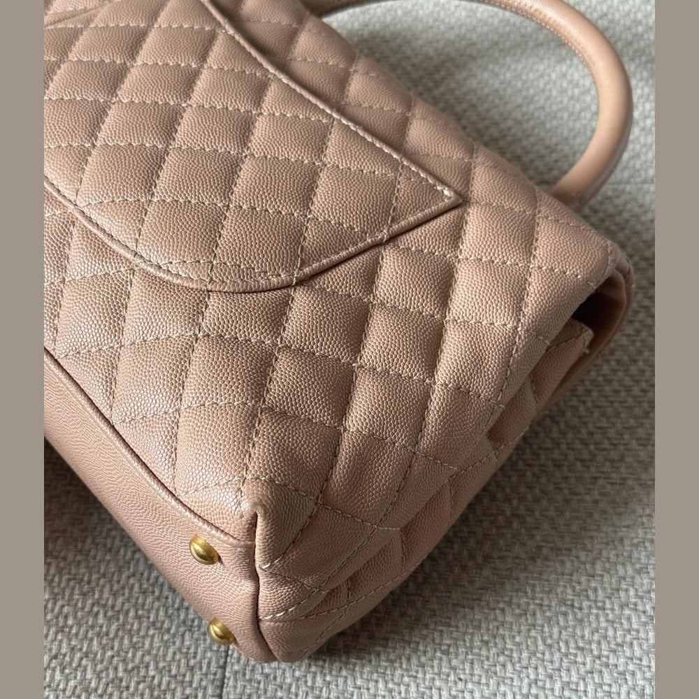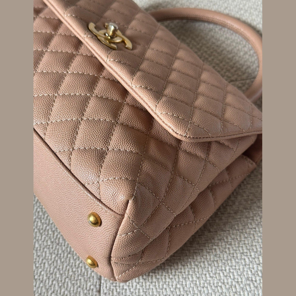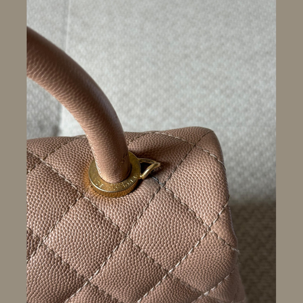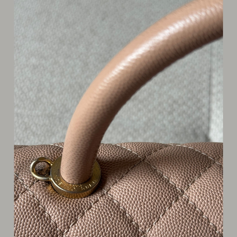 A timeless and feminine design, this Chanel Coco Handle bag is crafted from luxurious nude caviar leather and finished with light gold-tone hardware. It features the signature top handle silhouette, quilted texture, and the iconic interlocking CC turn-lock closure. The structured shape adds a refined touch, while the detachable leather-interwoven chain strap allows for versatile shoulder or crossbody wear. A perfect blend of classic Chanel elegance and everyday practicality.