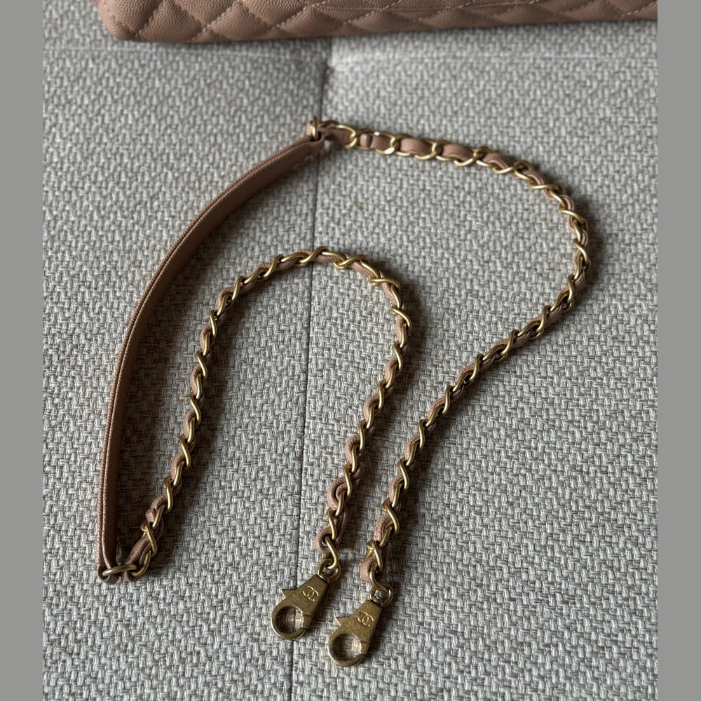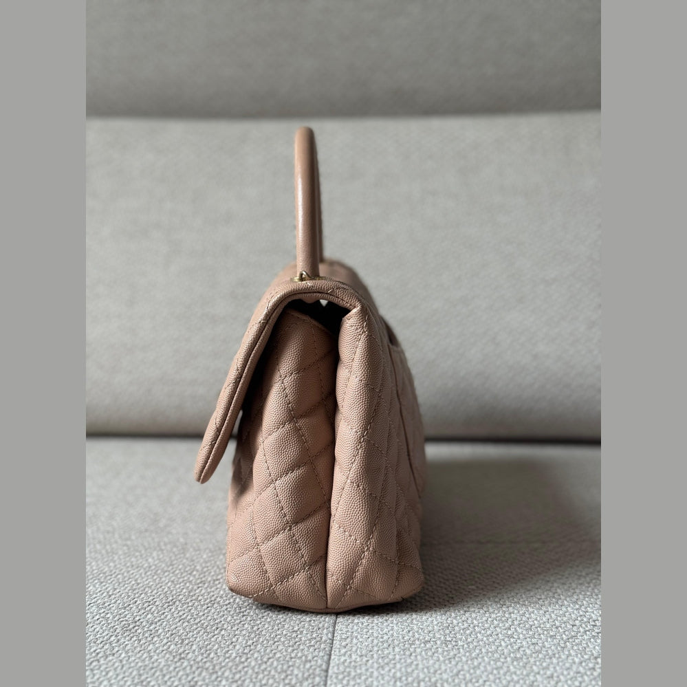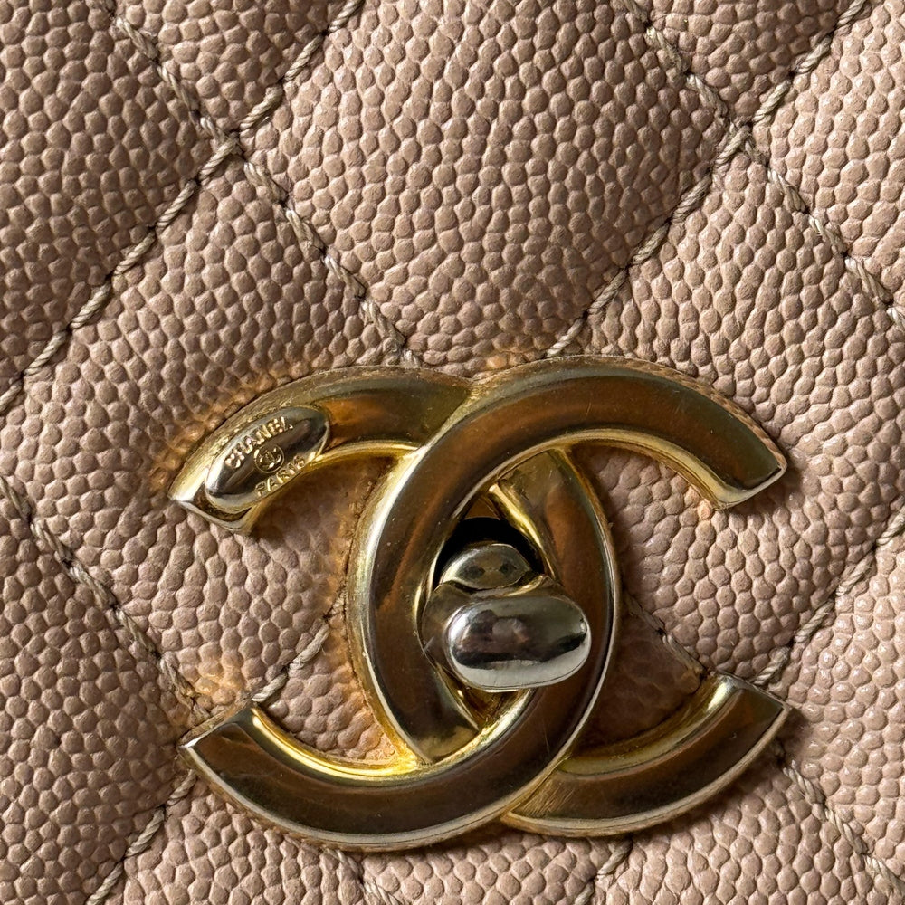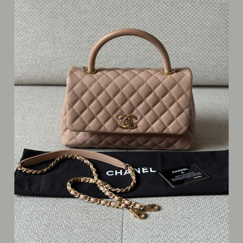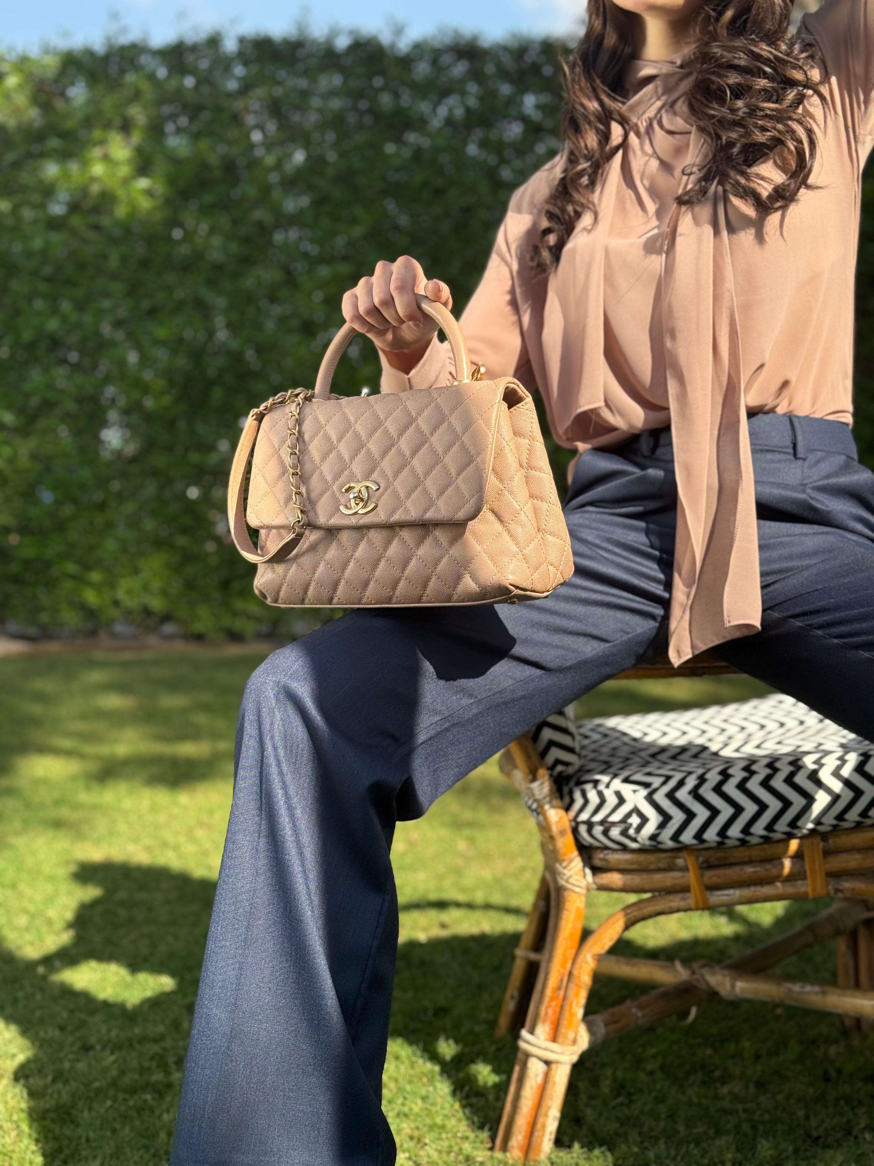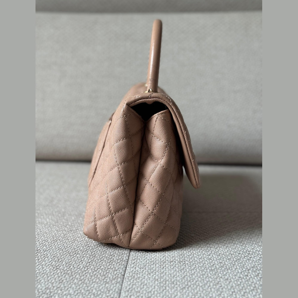 A timeless and feminine design, this Chanel Coco Handle bag is crafted from luxurious nude caviar leather and finished with light gold-tone hardware. It features the signature top handle silhouette, quilted texture, and the iconic interlocking CC turn-lock closure. The structured shape adds a refined touch, while the detachable leather-interwoven chain strap allows for versatile shoulder or crossbody wear. A perfect blend of classic Chanel elegance and everyday practicality.