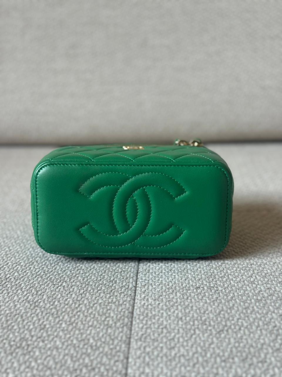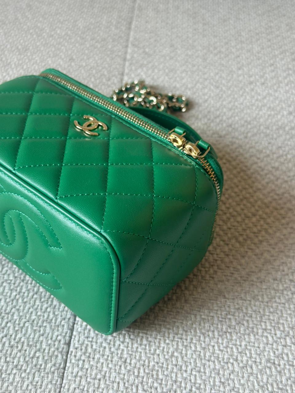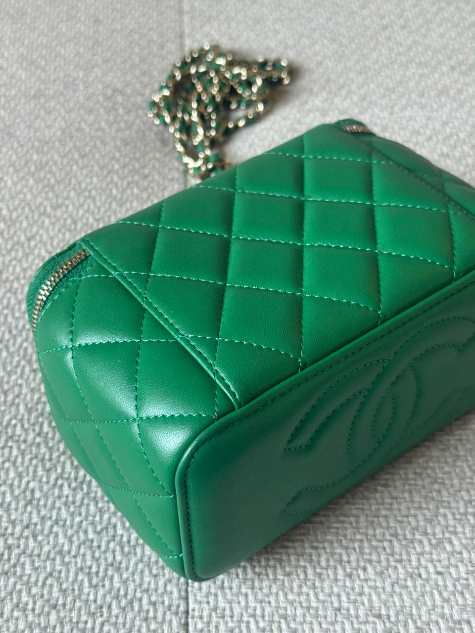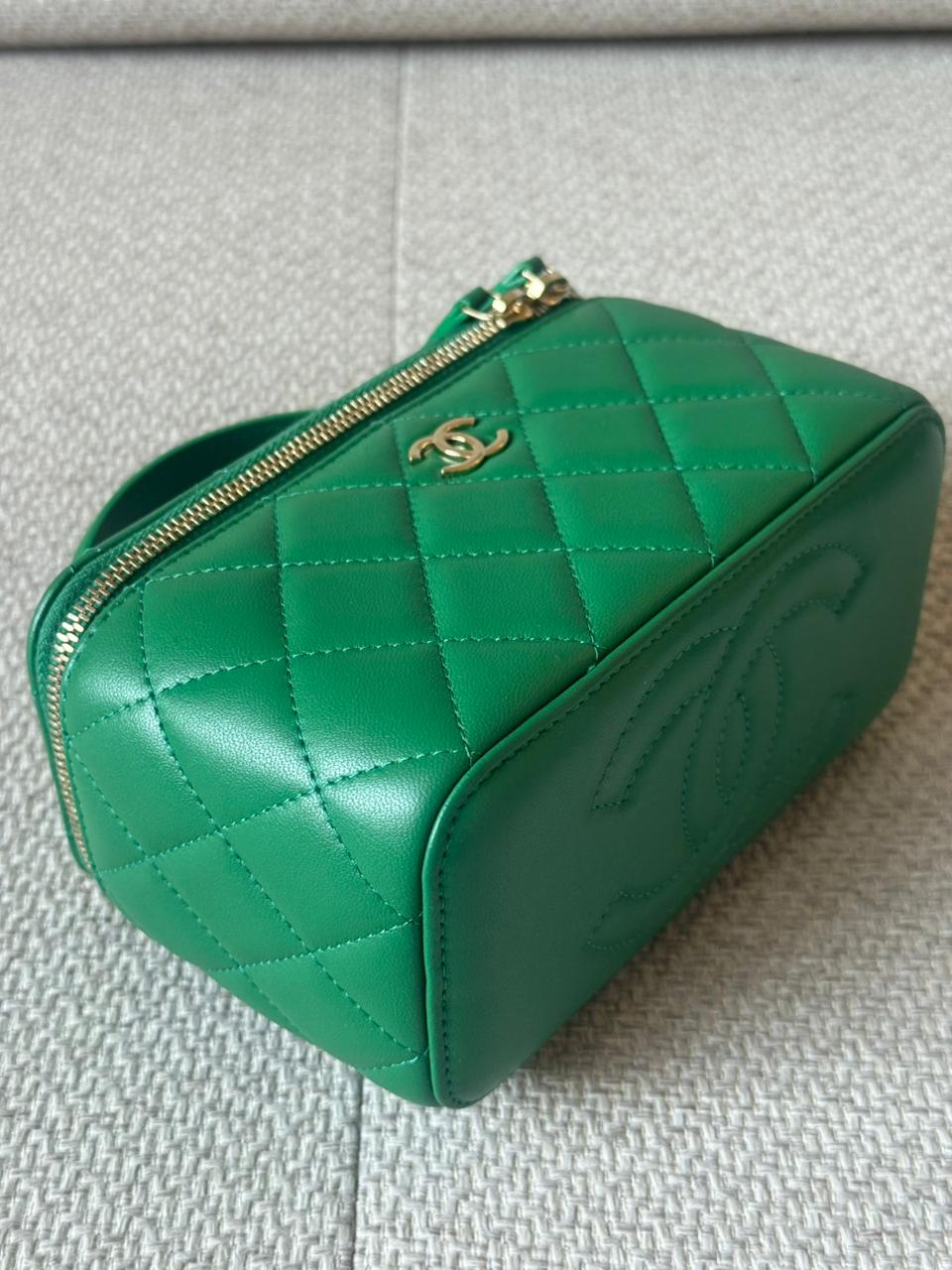 A refined and contemporary expression of Chanel’s iconic codes, this quilted Vanity Case combines structured elegance with practical design. Crafted in a rich green tone, the bag stands out subtly while remaining timeless — a sophisticated alternative to classic neutrals.