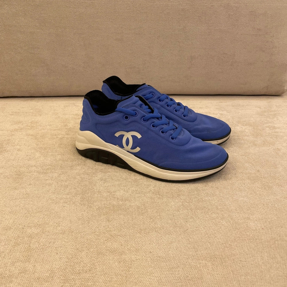 The Chanel Mesh Lycra Thermoplastic Blue Sneakers in size 38 are a stylish and contemporary footwear option from Chanel's 2019 Spring collection (19P). These sneakers are crafted from a combination of mesh, lycra, and thermoplastic materials, offering both comfort and durability. The design features a blue upper complemented by white soles and a prominent white CHANEL logo on the side, embodying the brand's signature aesthetic.