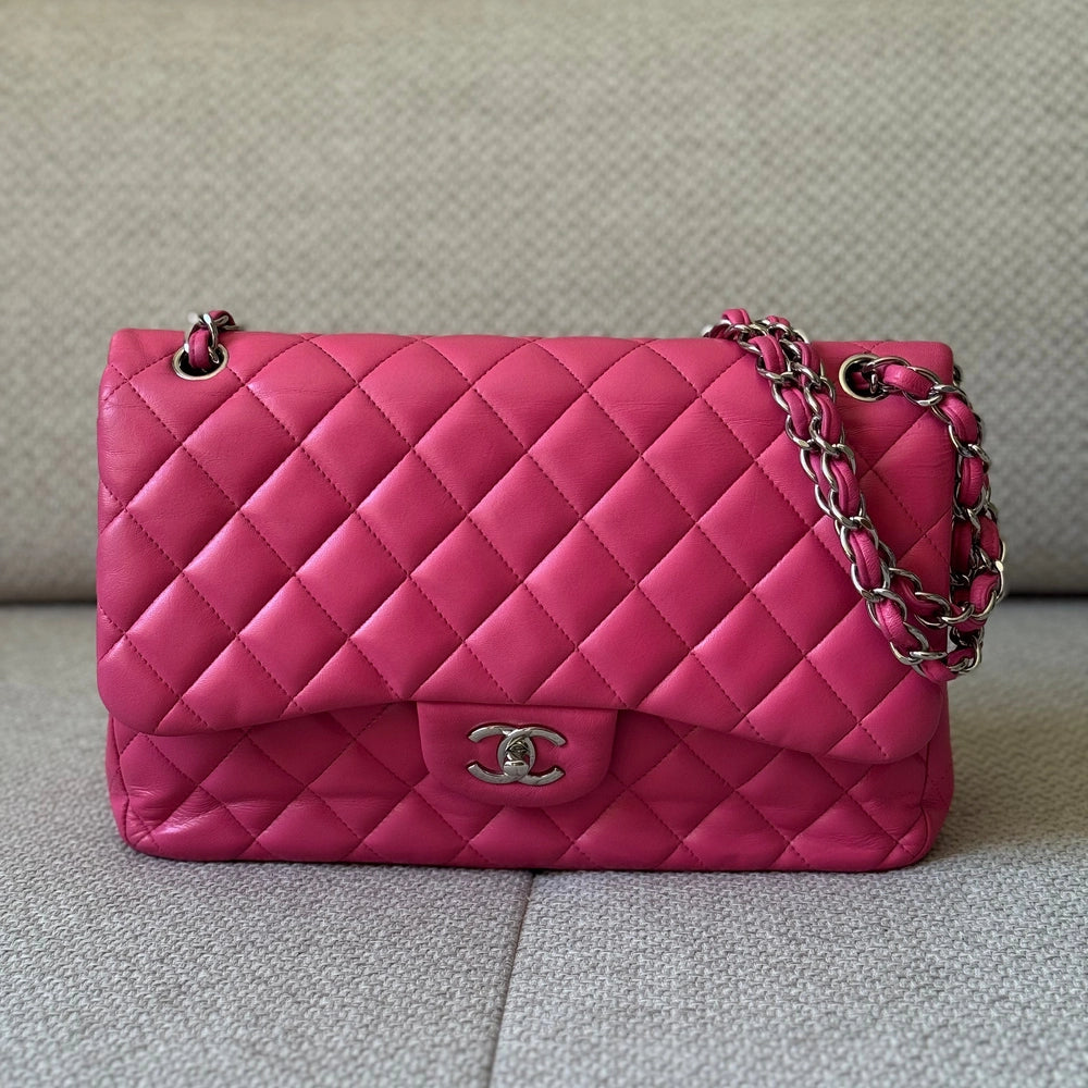 Elevate your collection with this iconic Chanel Classic Flap Bag in the coveted Jumbo size, crafted from luxurious quilted leather in a vibrant hot pink hue. This timeless piece features Chanel’s signature CC turn lock closure in silver tone hardware and a double flap design for added structure and security. The interwoven leather and chain shoulder strap allows for both shoulder and crossbody wear. This statement accessory combines elegance with functionality, offering a spacious interior perfect for day to night versatility.