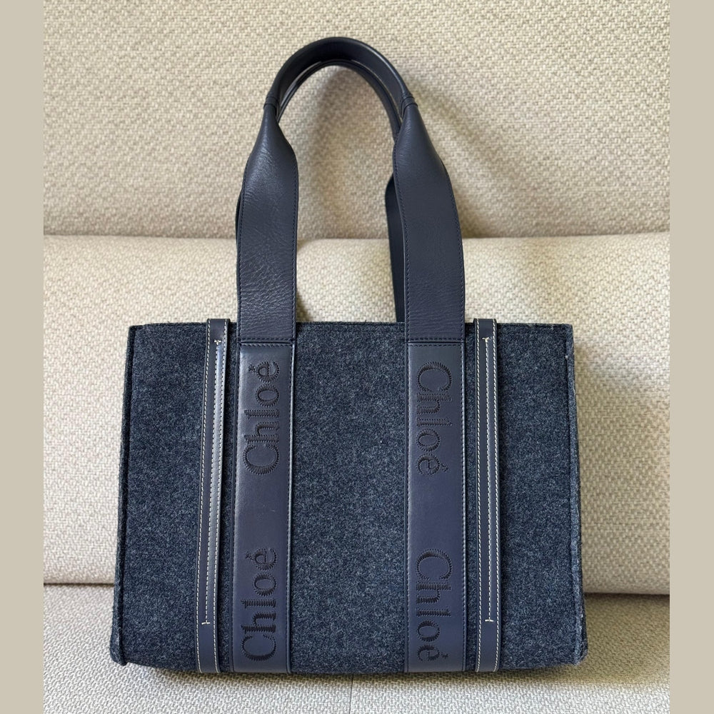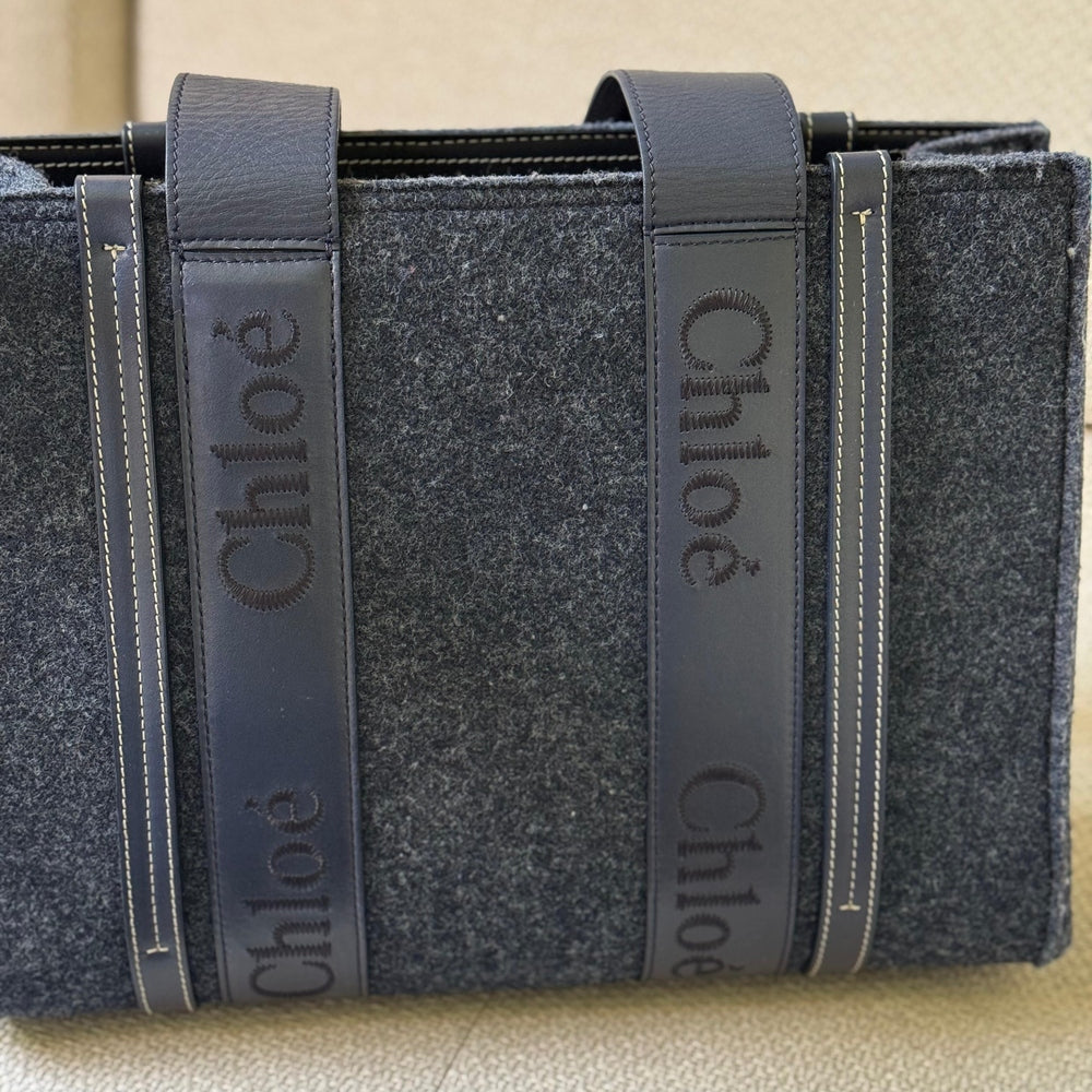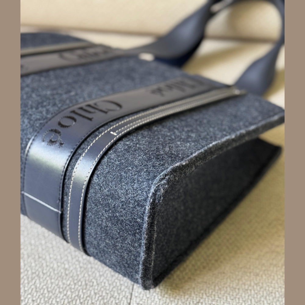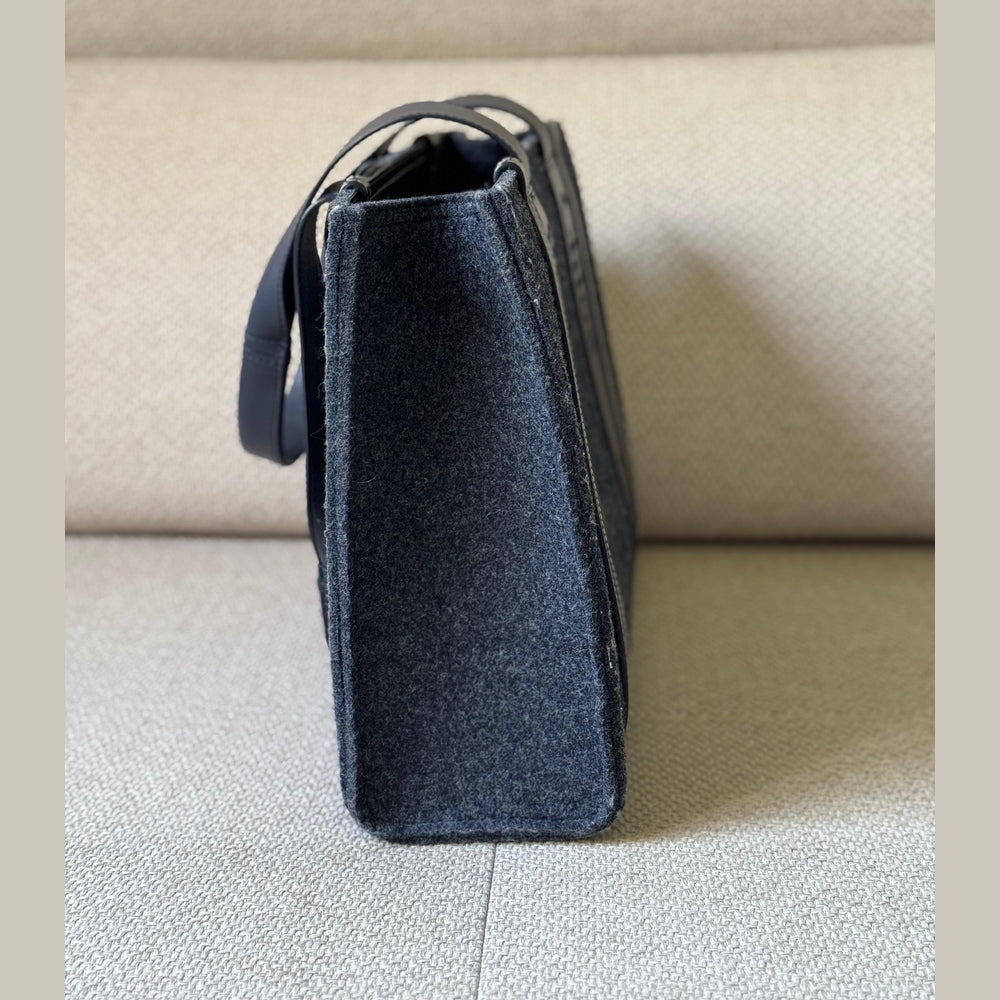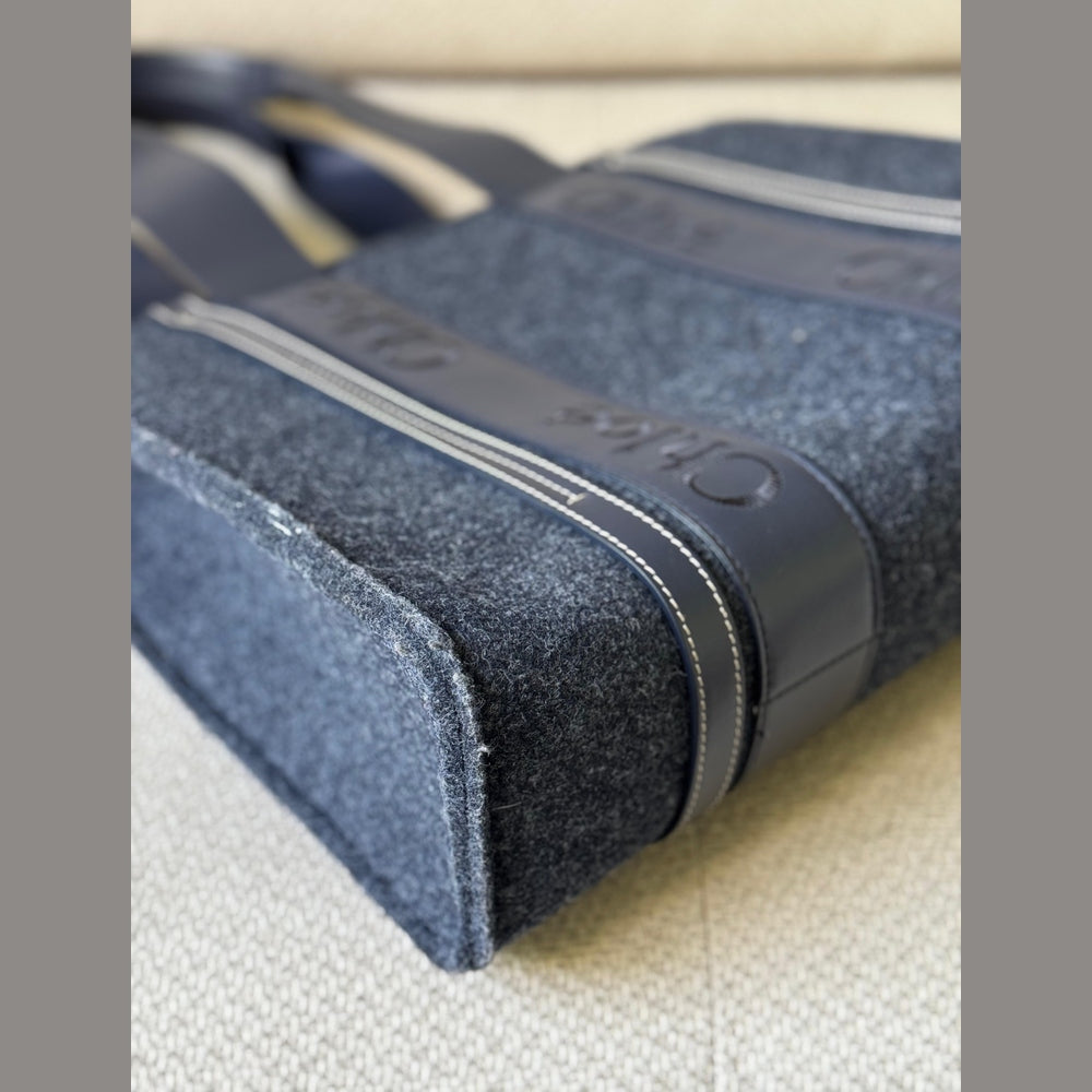A refined take on the signature Woody line, this Chloé tote embodies casual elegance with a winter-ready twist. Crafted from soft navy blue wool, it features the Maison’s iconic Chloé logo ribbons along the structured silhouette — a hallmark of effortless Parisian sophistication.