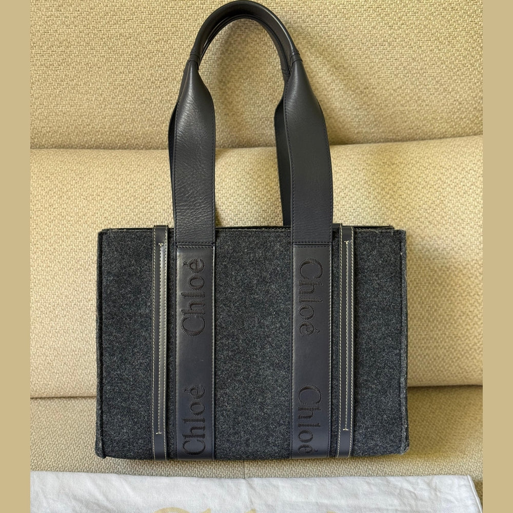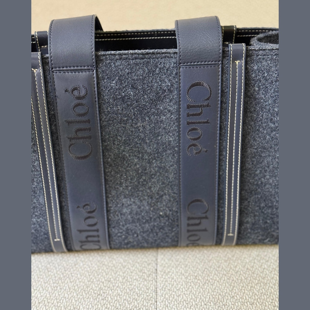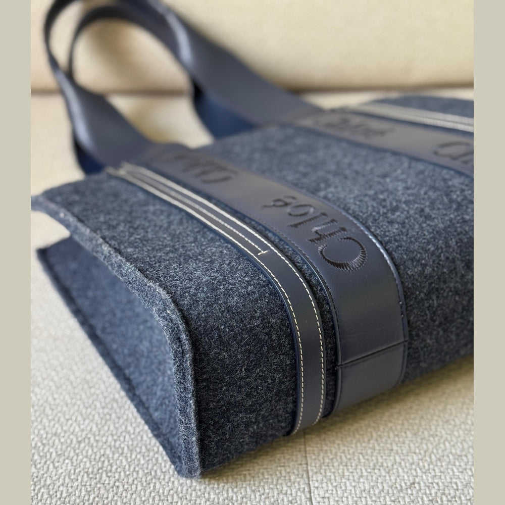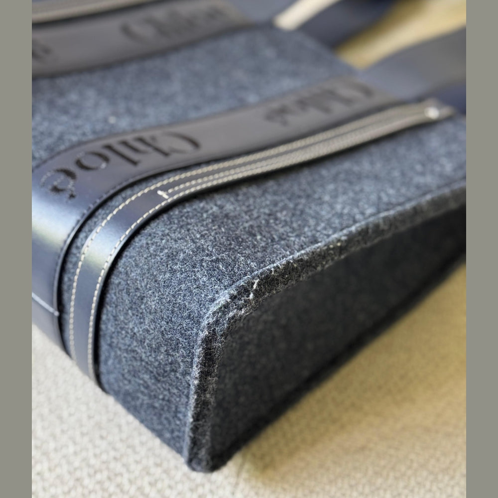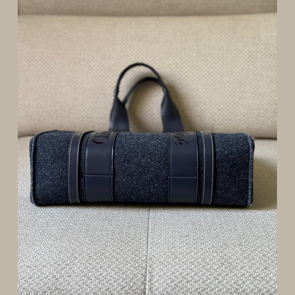 A refined take on the signature Woody line, this Chloé tote embodies casual elegance with a winter-ready twist. Crafted from soft navy blue wool, it features the Maison’s iconic Chloé logo ribbons along the structured silhouette — a hallmark of effortless Parisian sophistication.