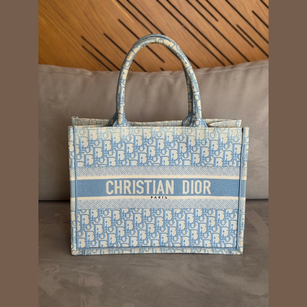 An emblem of the Dior aesthetic, the Medium Book Tote is a must-have for lovers of elevated everyday style. This version is crafted in baby blue Dior Oblique embroidered canvas, offering a soft, refined twist on the house’s signature motif. With its spacious interior and structured silhouette, it’s designed to carry all your daily essentials — from documents to a laptop — with effortless elegance. The front features the iconic “CHRISTIAN DIOR PARIS” signature, paying homage to the brand’s heritage.