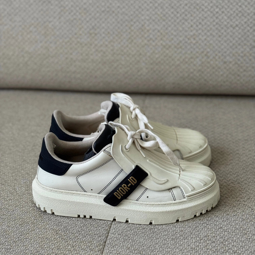 Elevate your casual wardrobe with these authentic Christian Dior Dior-ID Sneakers in a crisp white leather accented by navy-blue details and a signature Dior-ID strap. Crafted in Italy, the sneakers feature a textured rubber sole for all-day comfort and a stylish covered-lace design that keeps the look sleek and contemporary. Perfect for pairing with denim, dresses, or tailored separates, these Dior-ID sneakers offer effortless luxury and versatile street-chic appeal.