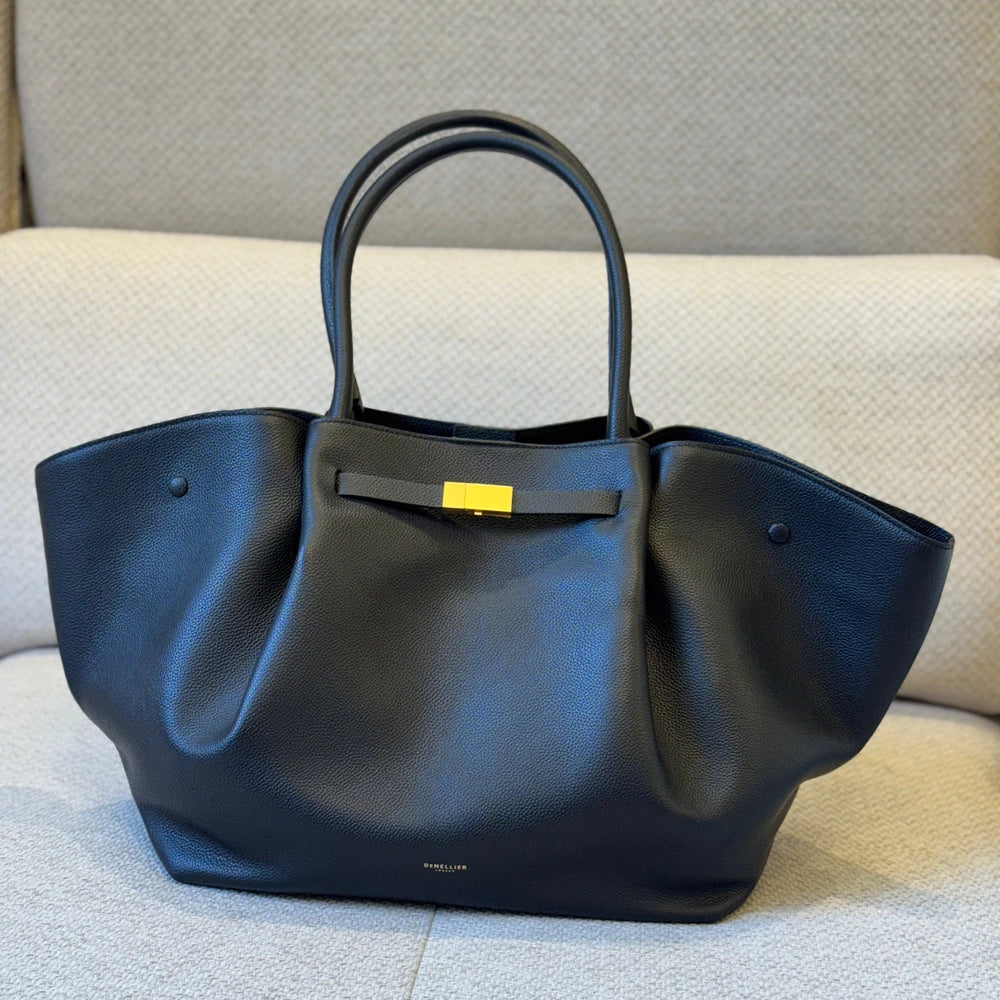 Chic, structured, and effortlessly refined, the DeMellier New York Tote in Large Black Leather is the ultimate everyday companion for the modern woman. Handcrafted in Spain from luxurious, sustainably sourced smooth cowhide leather, this tote blends functionality with timeless design. Its clean silhouette and sharp lines reflect a minimalist aesthetic, while the spacious interior easily accommodates a laptop, documents, and daily essentials—making it ideal for work, travel, or elevated day-to-day wear. The bag features reinforced top handles, protective metal feet, and an internal zip pocket for added convenience and organization. The classic black leather finish offers unmatched versatility, effortlessly pairing with both casual and formal outfits.