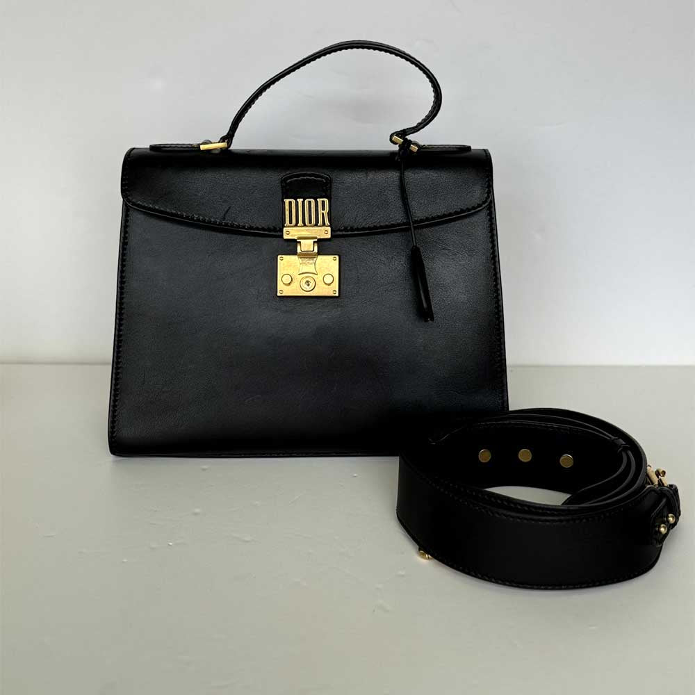 Black soft leather top handle with leather adjustable strap, front flap detailed with brand logo and lock closure, leather clochette, suede lining with 1 zipped pocket and 1 open pocket. Comes in Excellent condition with dust bag and cards included.