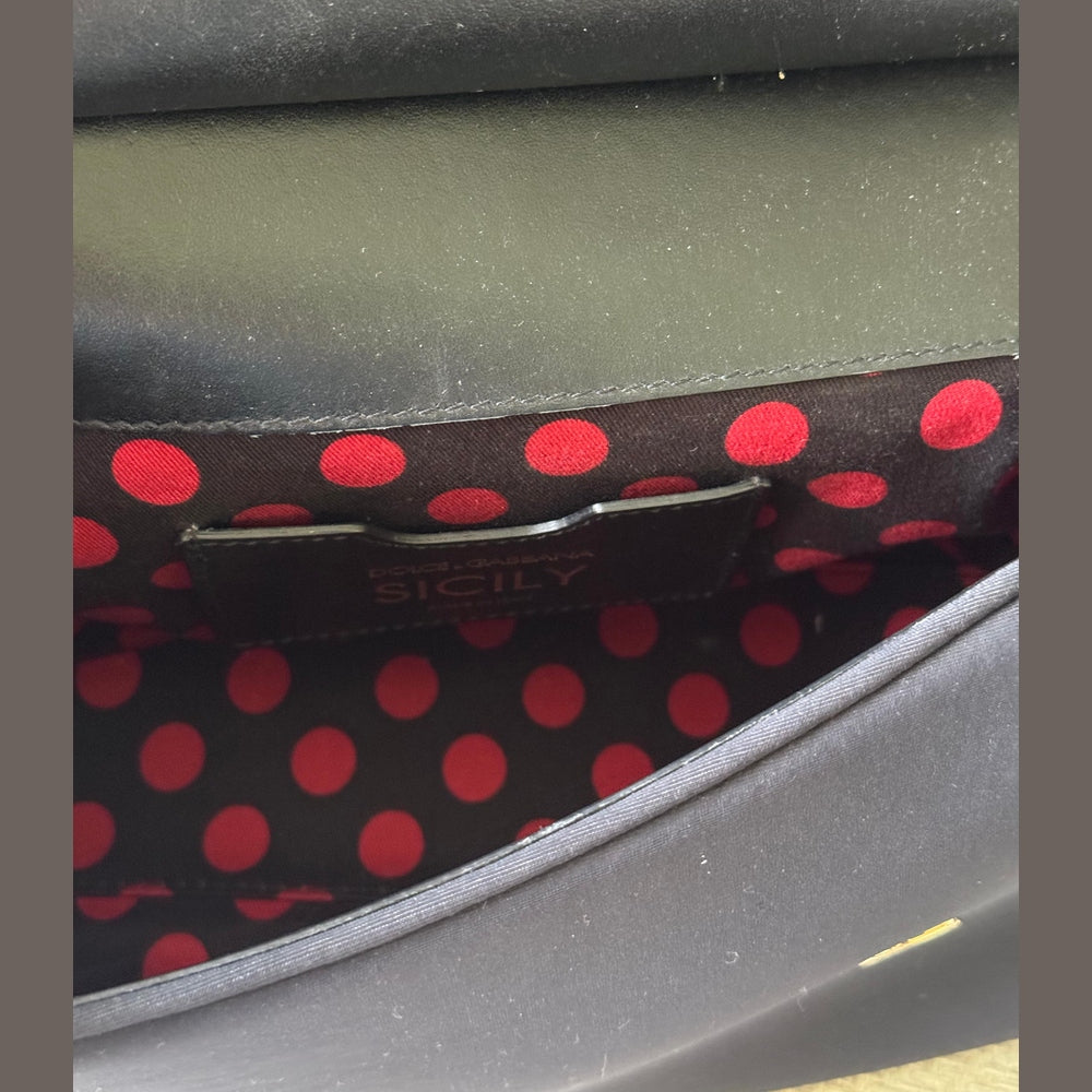 The bag features polished gold-tone hardware and a front flap closure with the engraved logo plaque — a subtle nod to the Maison’s Sicilian heritage. With both a top handle and a detachable shoulder strap, it offers versatile styling options for any occasion. Perfect for day-to-night wear, this Miss Sicily seamlessly blends sophistication, practicality, and Dolce & Gabbana’s distinct charm.