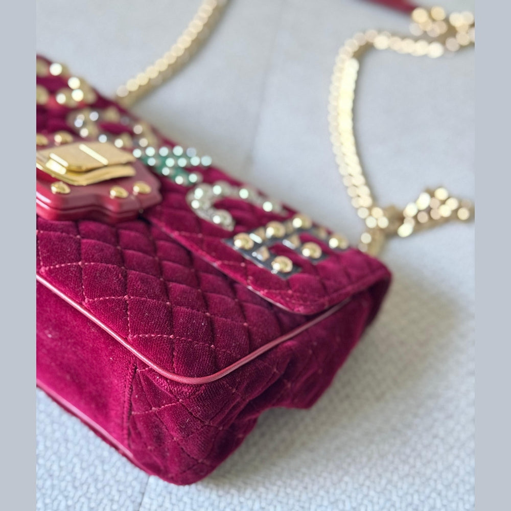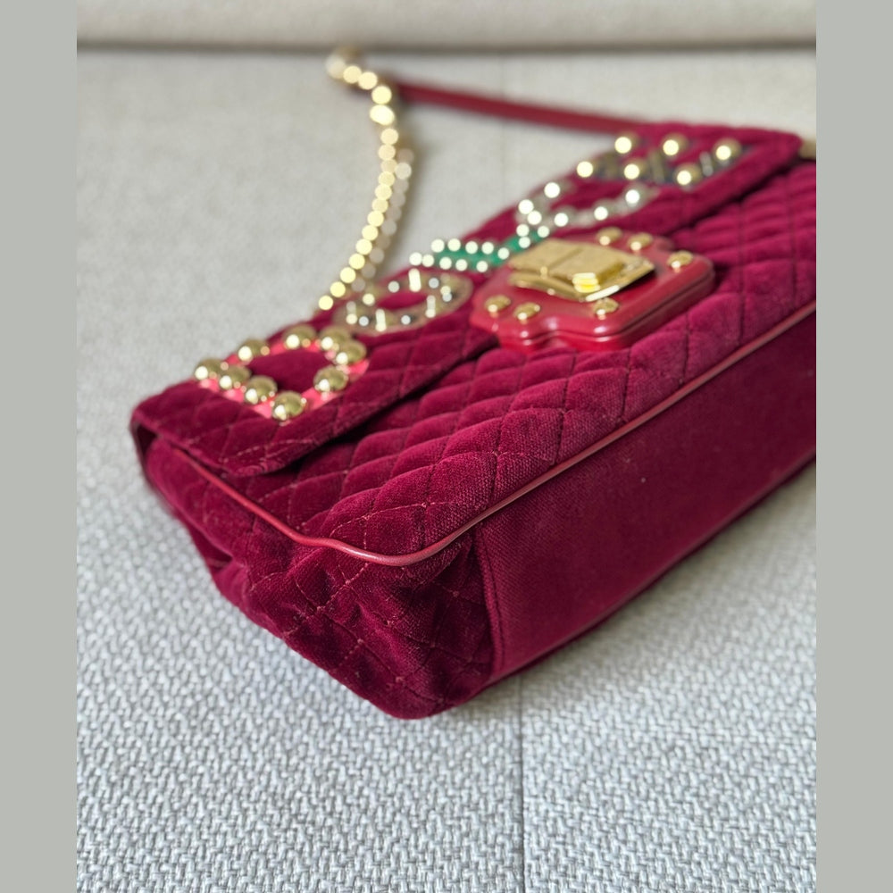 The Lucia bag by Dolce & Gabbana is a true symbol of refined Italian elegance. Crafted from luxurious quilted velvet, this statement piece embodies the brand’s romantic and glamorous DNA. Its structured silhouette is accentuated with gold-tone hardware and the signature Lucia lock closure — an emblem of timeless sophistication.