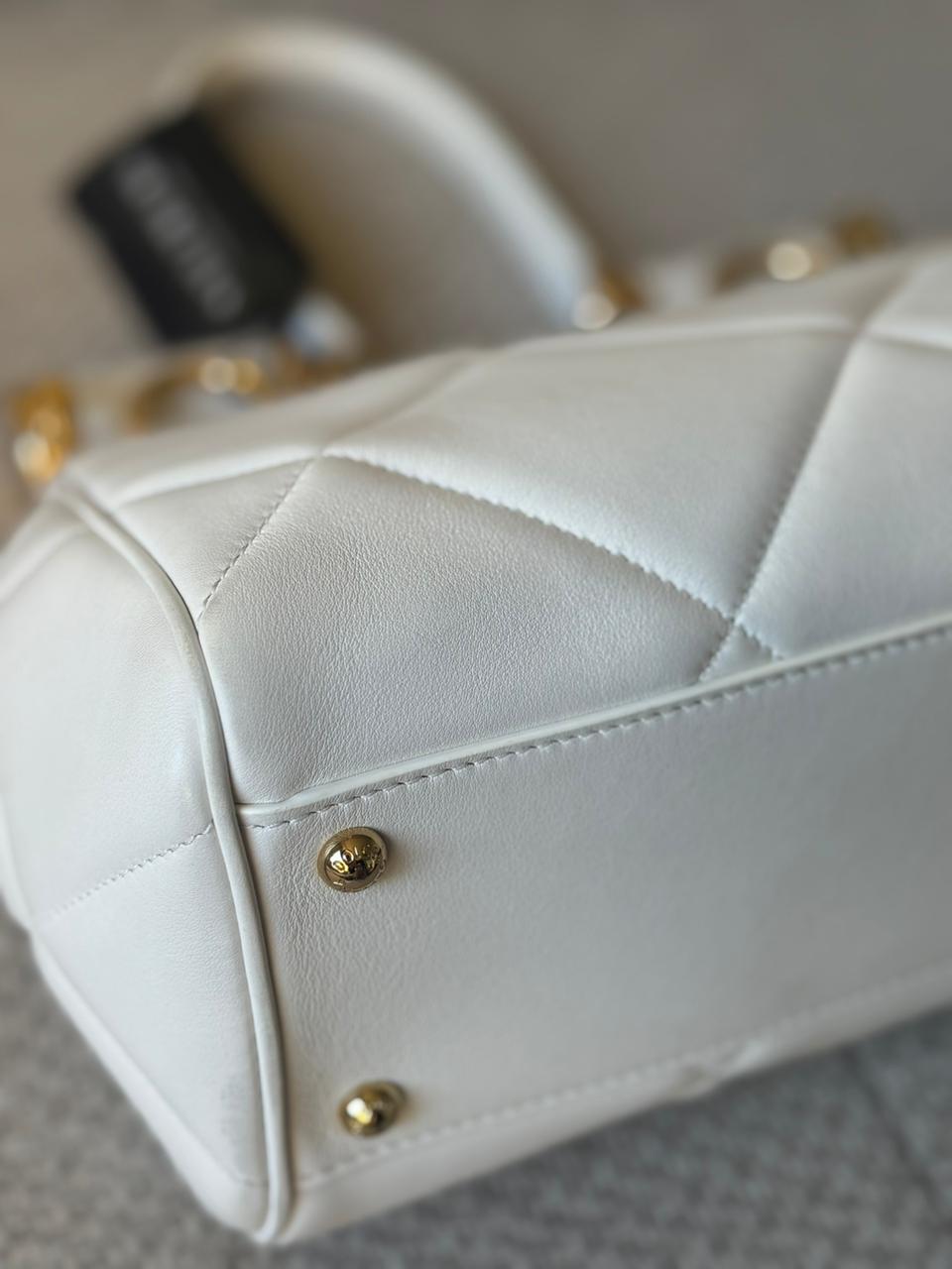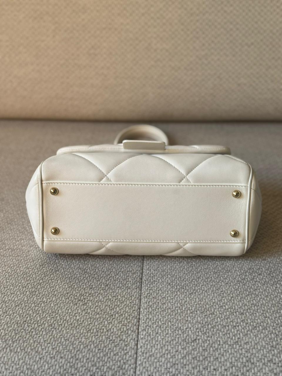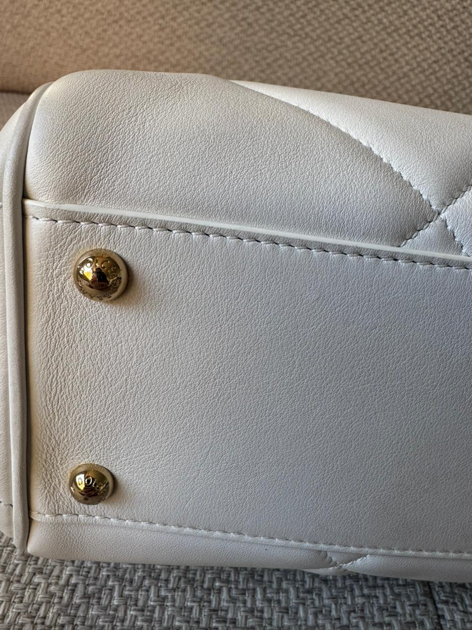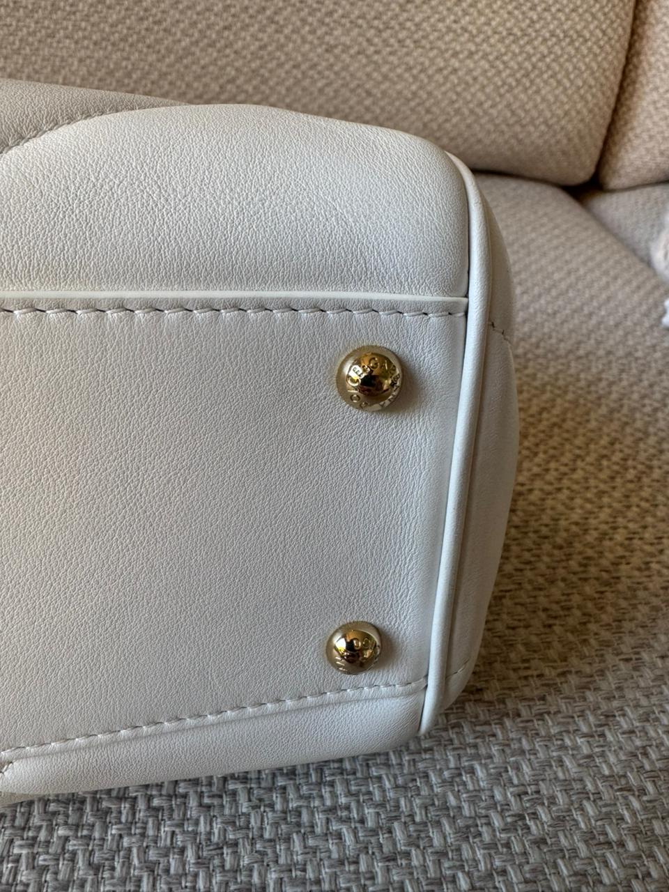 Crafted in smooth white leather and accented with refined gold-tone hardware, this piece delivers a clean, polished aesthetic. It offers a practical interior while maintaining a compact, structured profile.