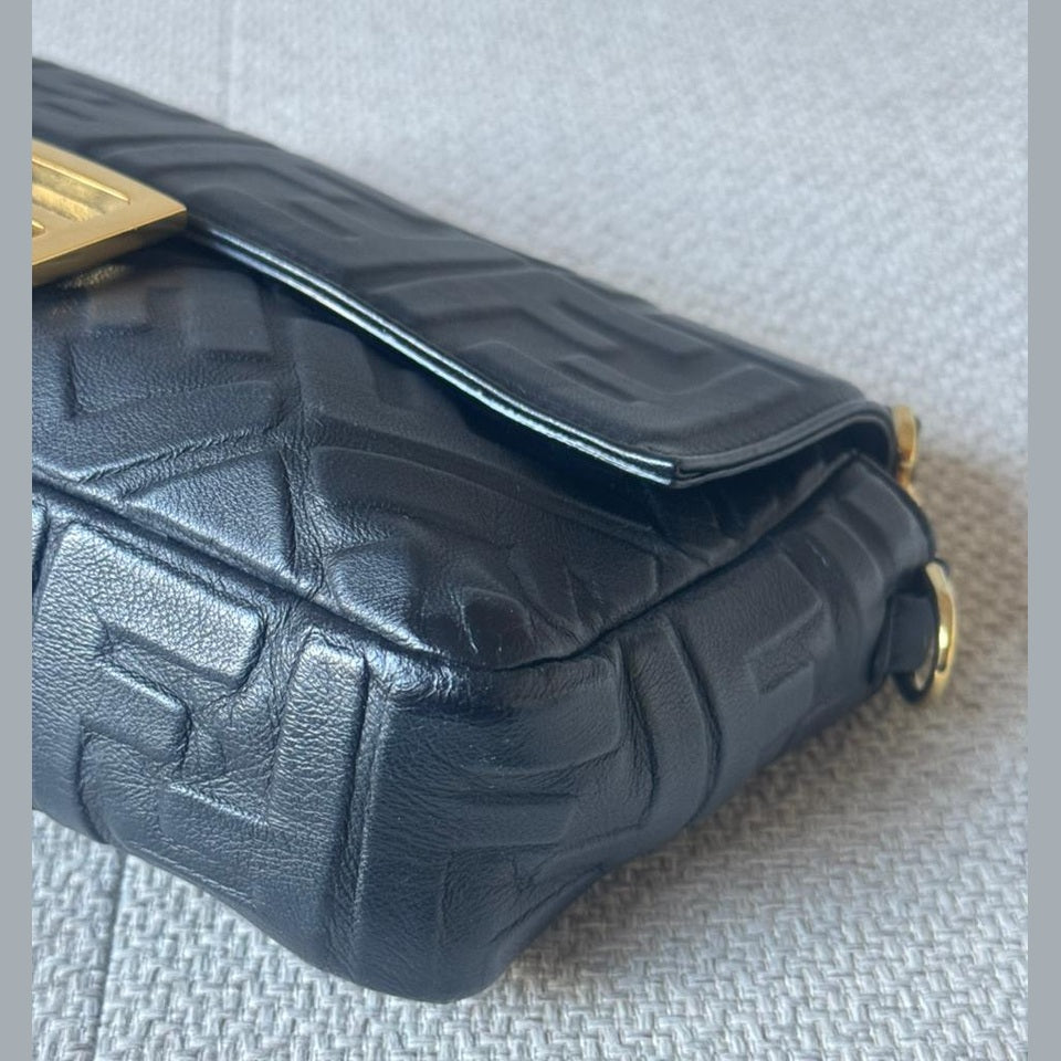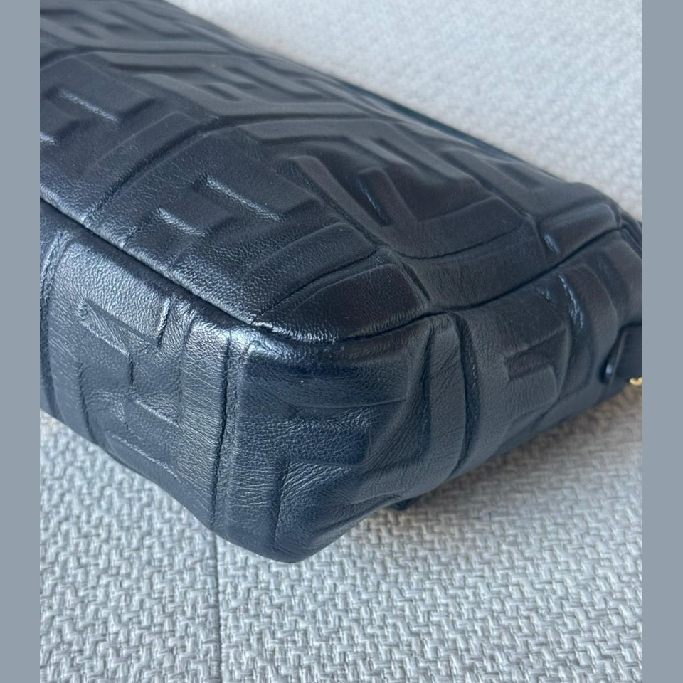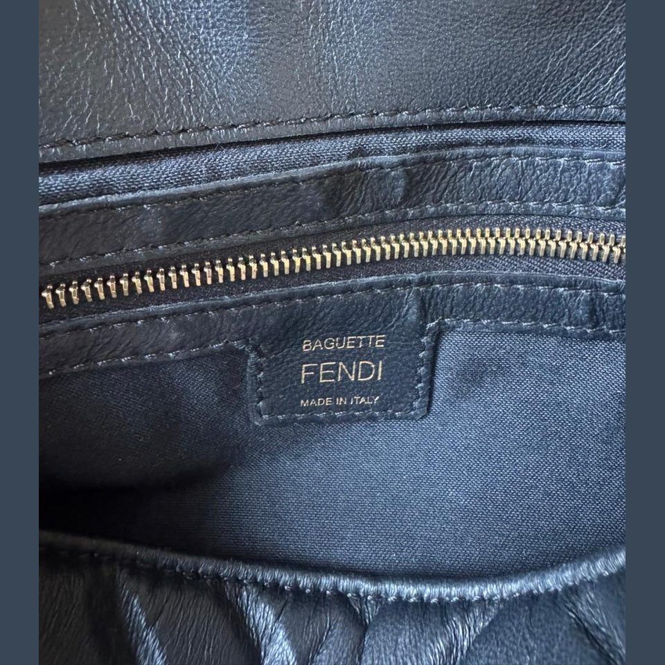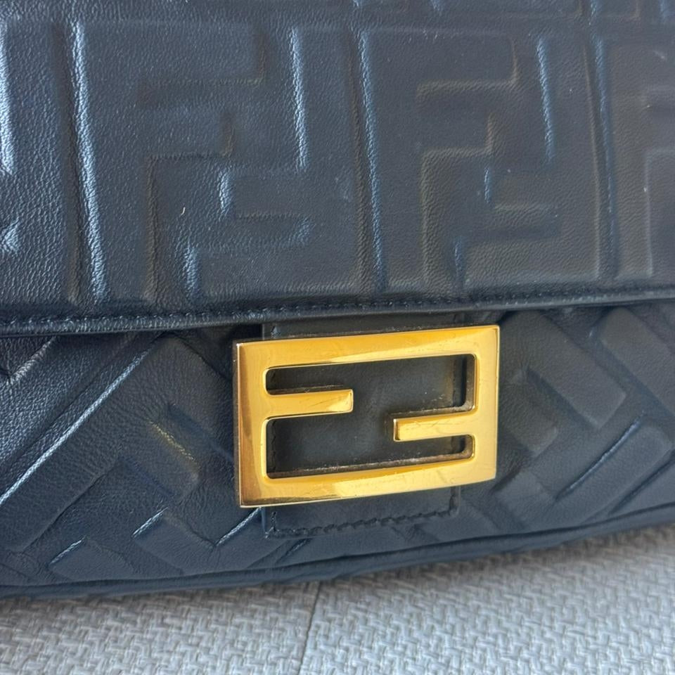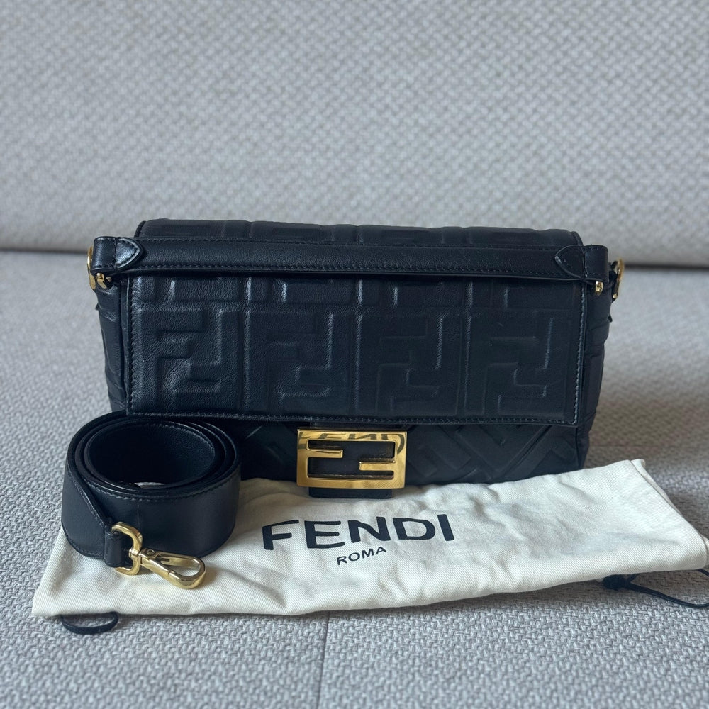 An iconic Fendi design, the Baguette Bag is crafted from supple black embossed nappa leather, offering a refined yet versatile silhouette. Finished with the signature FF clasp and accompanied by a strap, this timeless piece transitions effortlessly from day to evening.