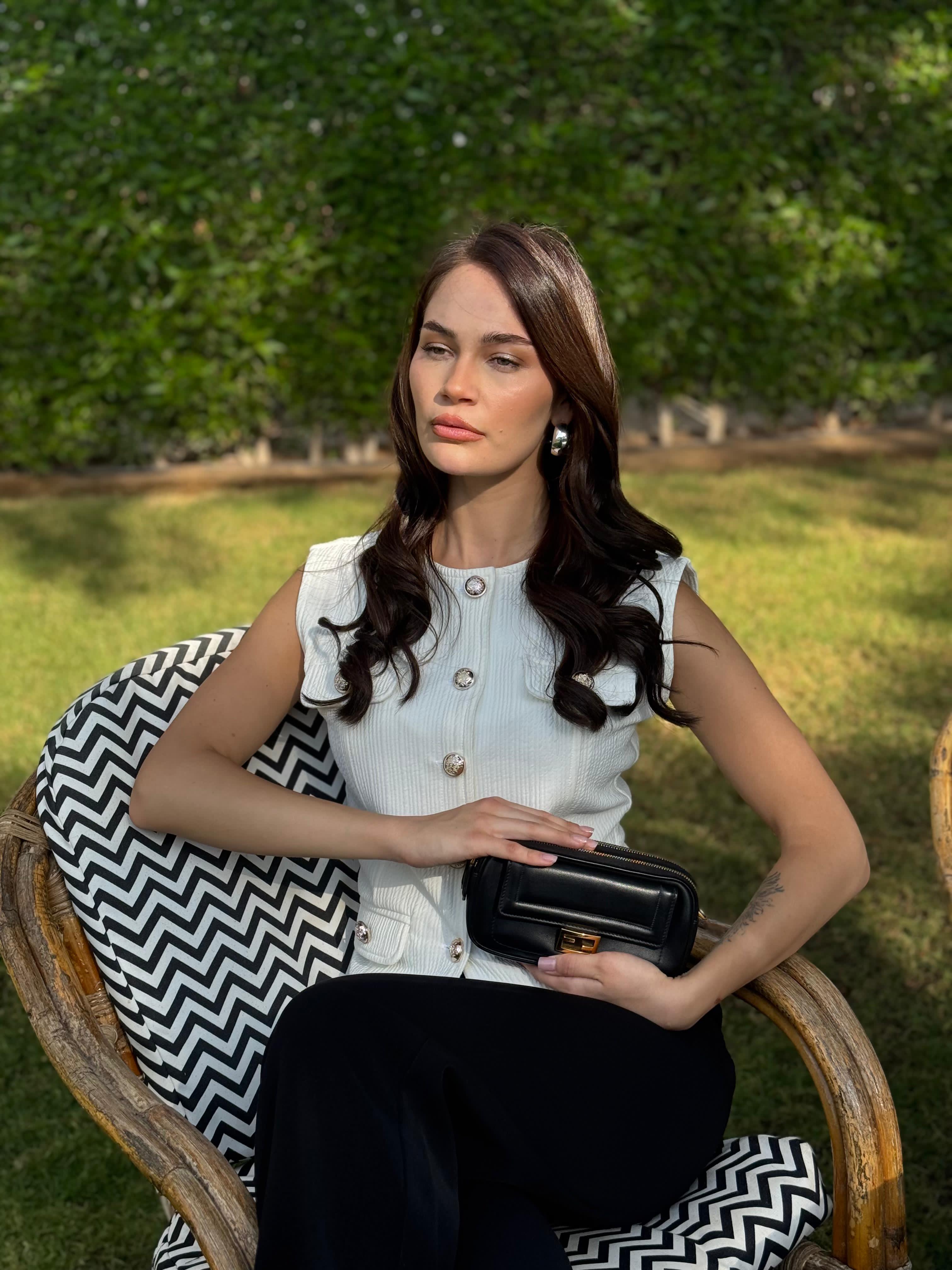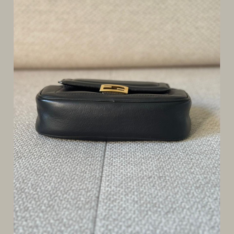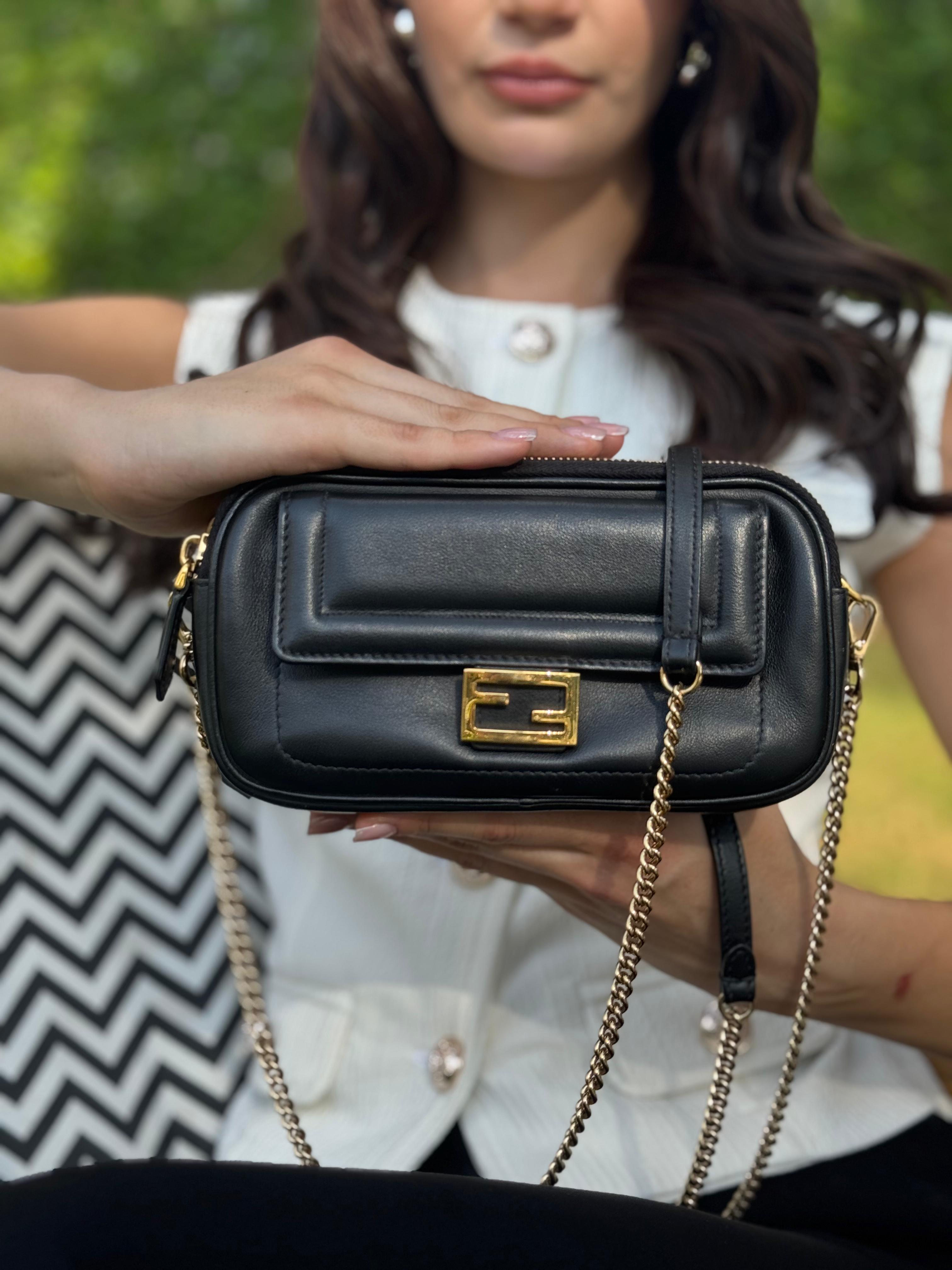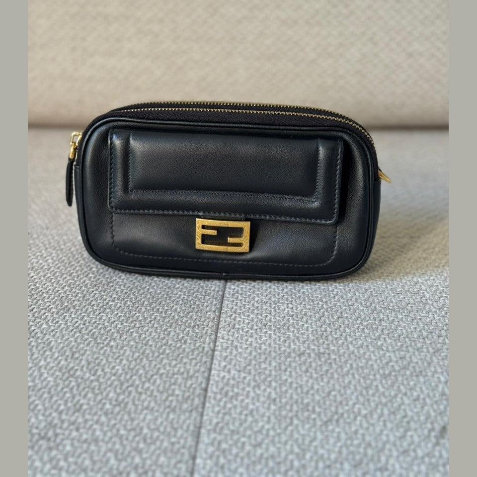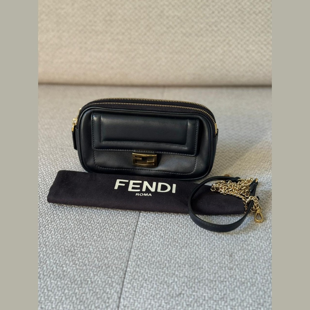 It comes with a removable leather and gold-tone chain strap, allowing it to be worn crossbody or carried as a clutch. Subtle yet sophisticated, this bag embodies Fendi’s signature craftsmanship and minimalist design.
