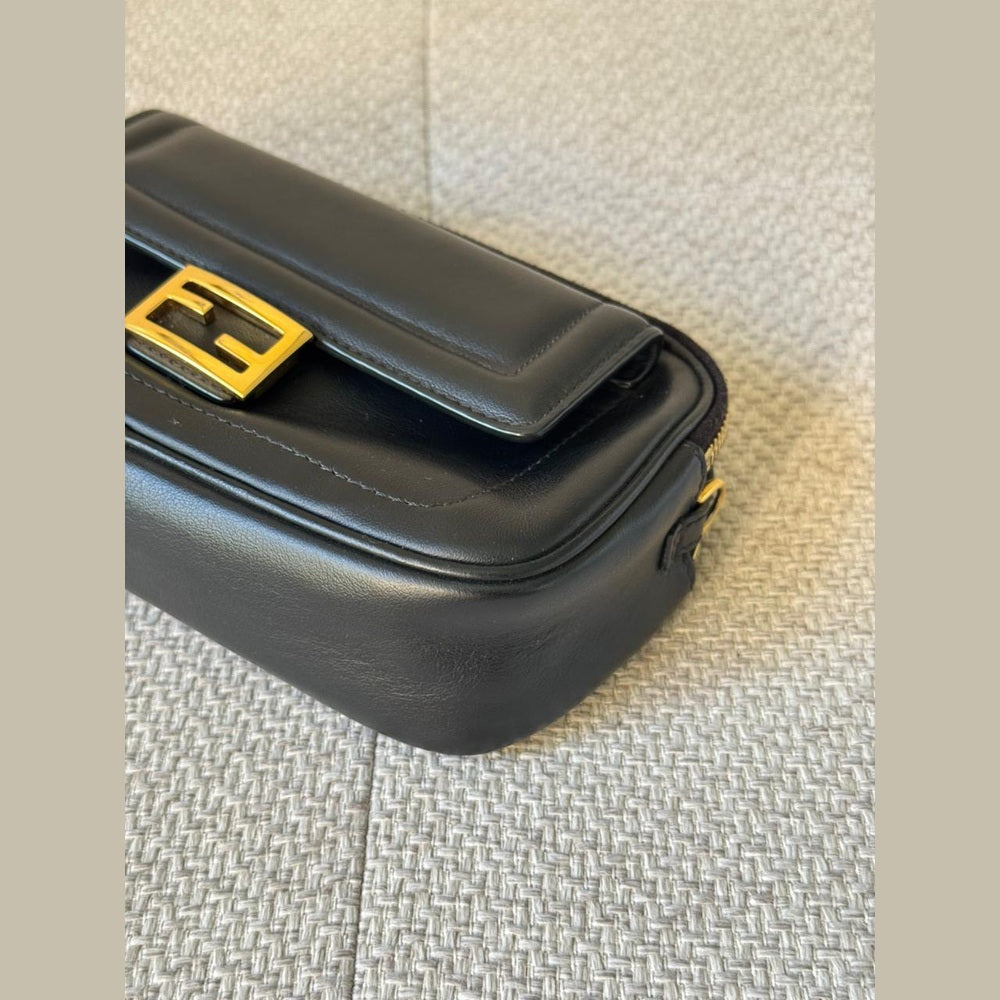 Crafted from smooth black leather, this Fendi Baguette Camera Bag combines modern functionality with timeless elegance. It features the iconic FF logo clasp in gold-tone metal and a compact rectangular silhouette that’s perfect for everyday use. The double-zip closure opens to a spacious fabric-lined interior with enough room for essentials.
