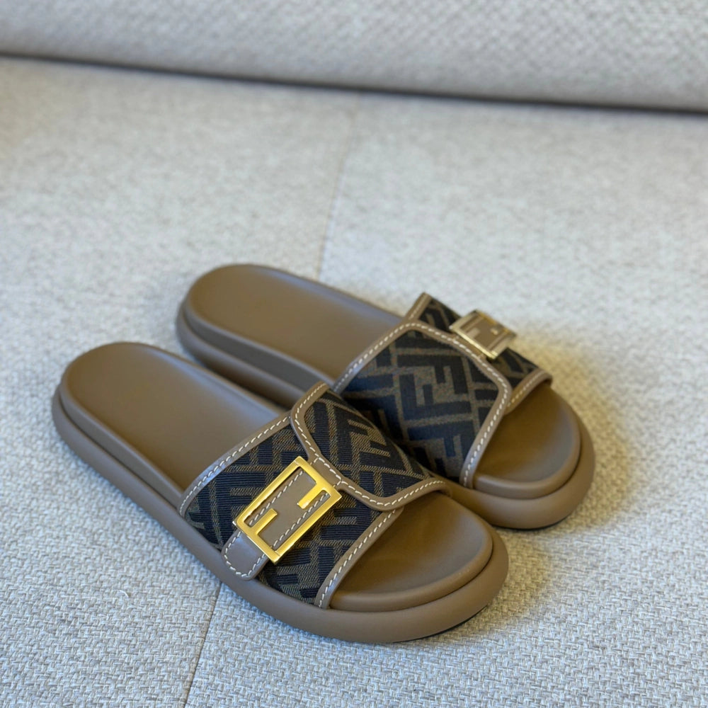 Elevate your casual style with these Fendi Feel Slides, featuring the signature FF logo canvas strap and gold tone buckle accent. Designed for both comfort and sophistication, they’re perfect for everyday luxury wear or your next getaway.