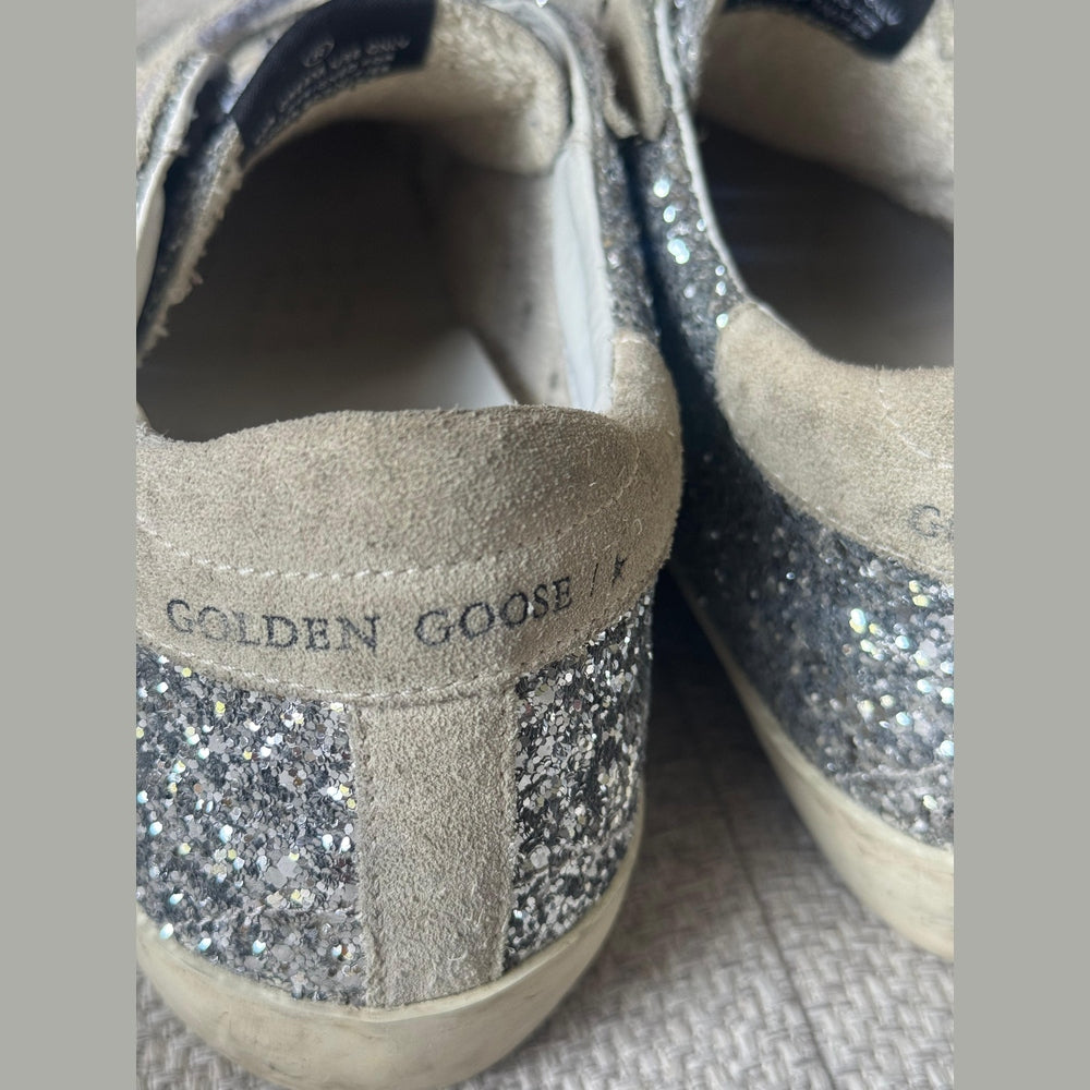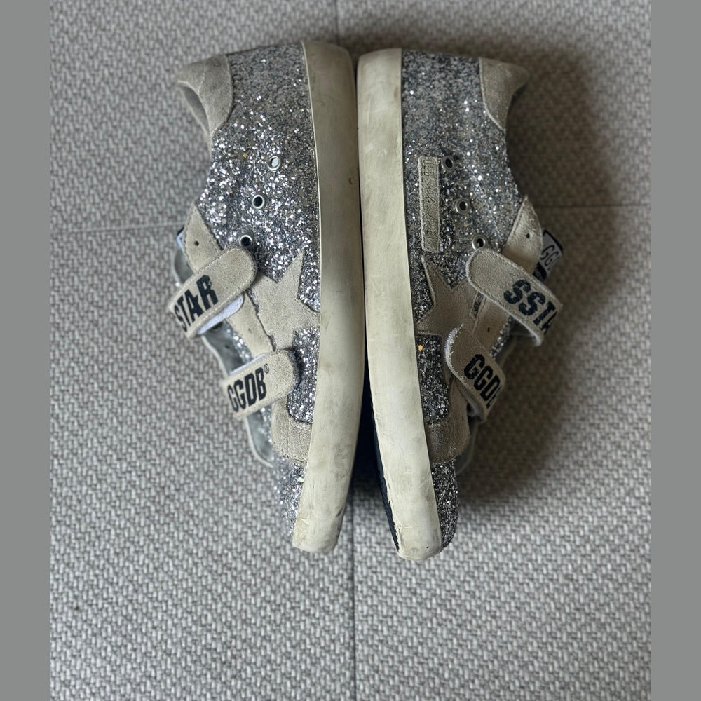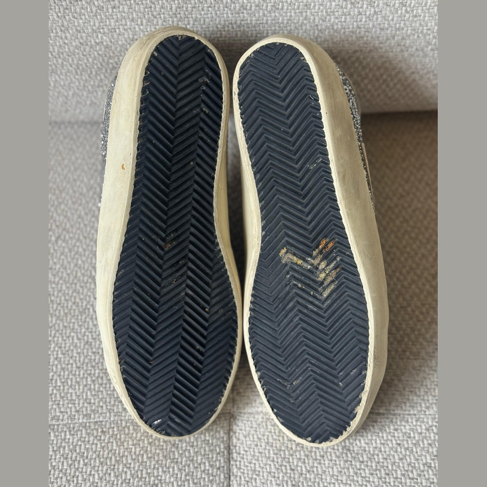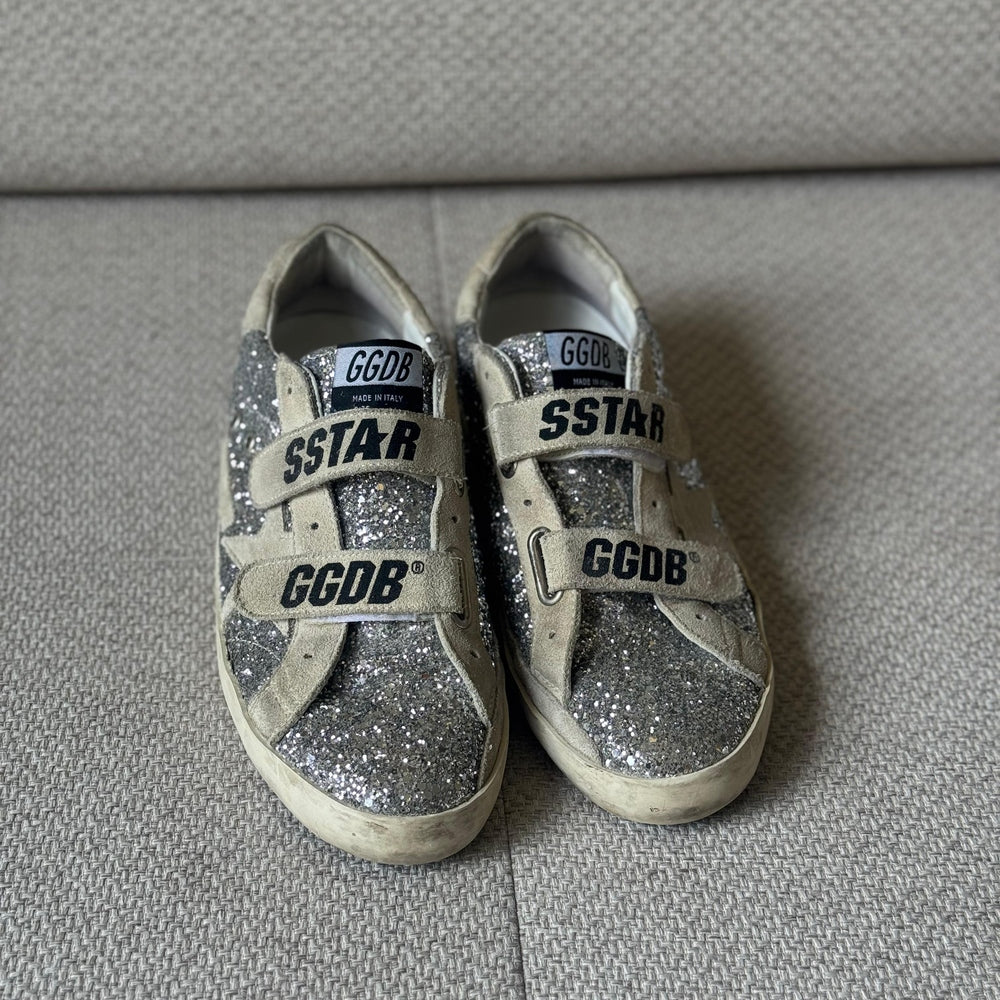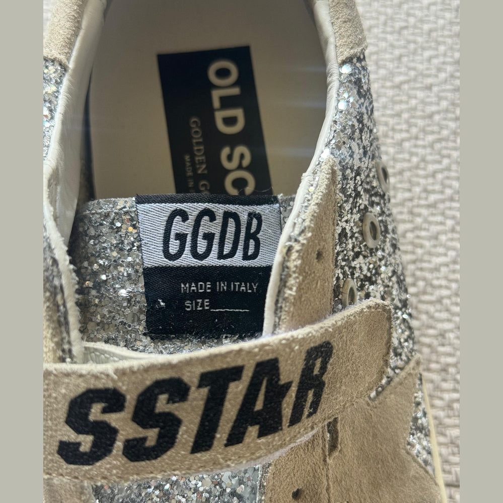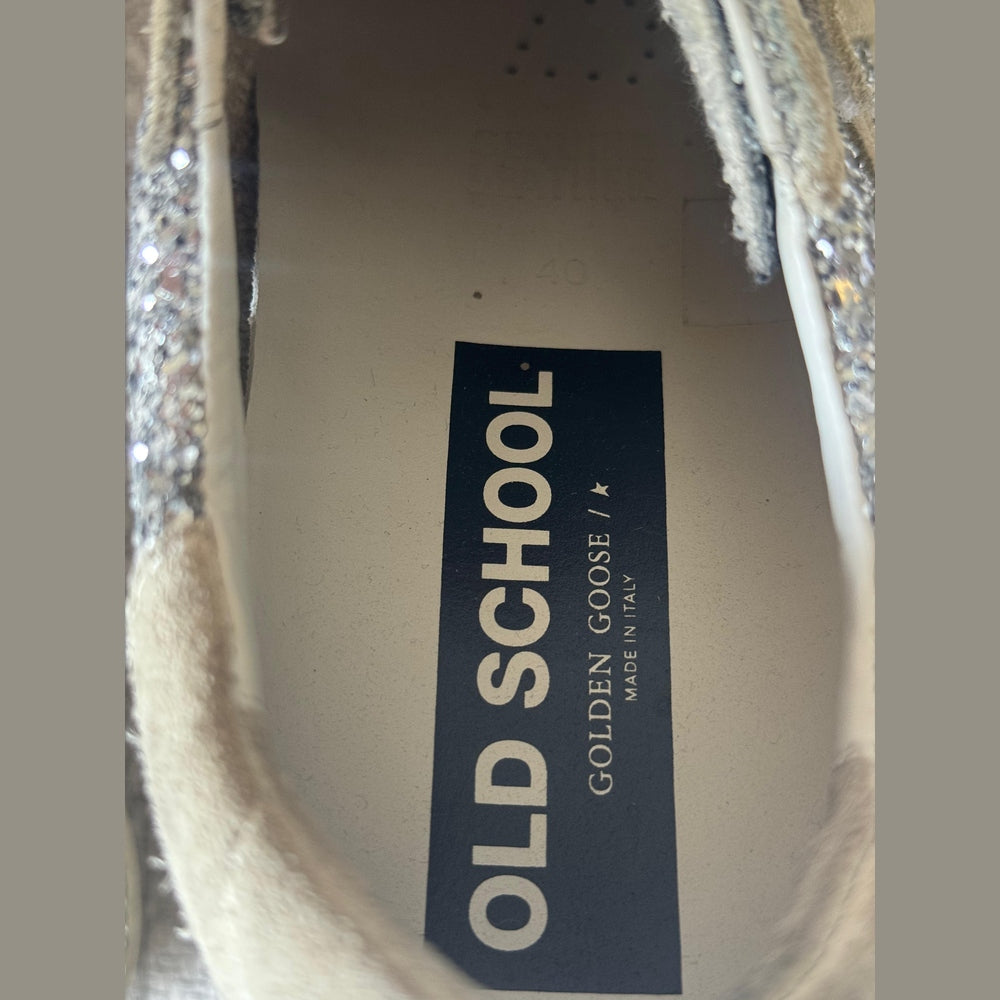Bold yet effortlessly wearable, the Golden Goose Old School Low Top sneakers combine a retro-inspired silhouette with the brand’s signature lived-in aesthetic. Finished in silver glitter, this pair adds a statement touch while remaining true to Golden Goose’s distinctive craftsmanship.