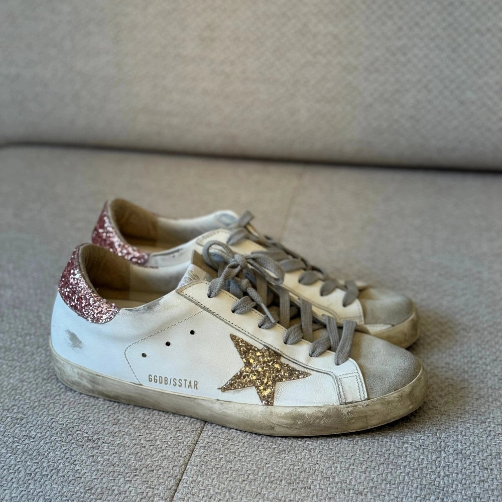 These Golden Goose Superstar sneakers feature the brand’s signature distressed look with a gold glitter star detail and pink glitter heel tab. Crafted in white leather with grey laces and suede accents on the toe, they bring a stylish, lived-in edge to any outfit. Scuffing and wear are intentional parts of the design.