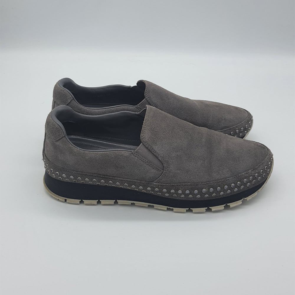 Grey Suede Leather Slip Ons, Stone Embellished All Around White Anti Slip Sole. Comes in Excellent condition with dust bag & box included.