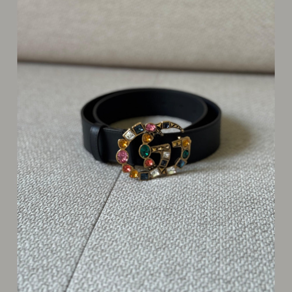 Add a statement of luxury to your wardrobe with this authentic Gucci GG Marmont Crystal Embellished Belt. Crafted in smooth black calfskin leather, this piece showcases the house’s iconic Double G buckle, elevated with multicolor crystal embellishments for a bold yet refined touch. Perfectly versatile, the belt can be styled with dresses, jeans, or tailored looks, instantly elevating any outfit with Gucci’s signature glamour.