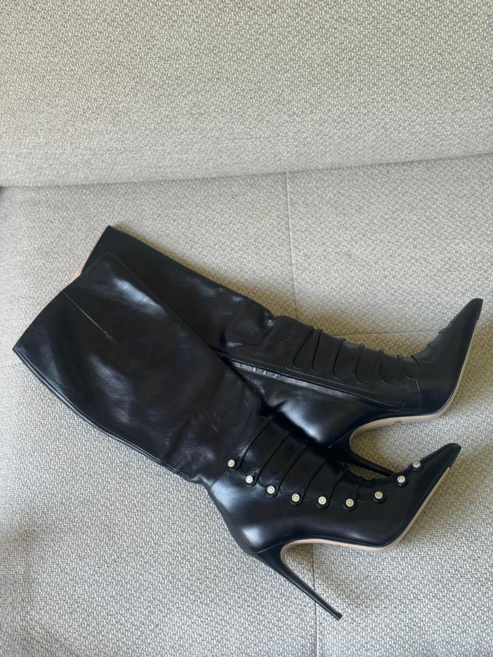 Designed with a sleek, structured silhouette, these boots offer a refined balance between classic tailoring and feminine embellishment. The pearl accents add a distinctive luxury touch while maintaining versatility, making them suitable for both elevated daywear and polished evening styling.