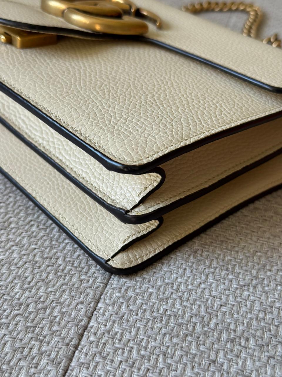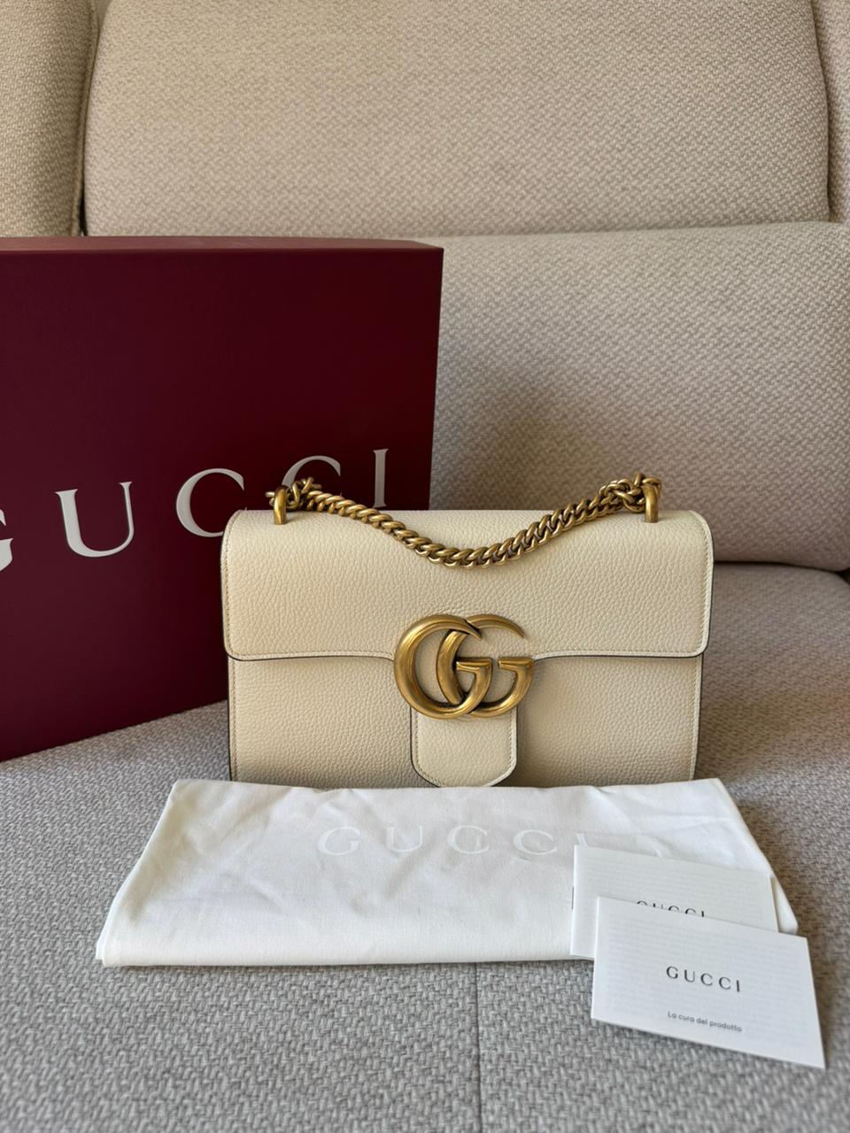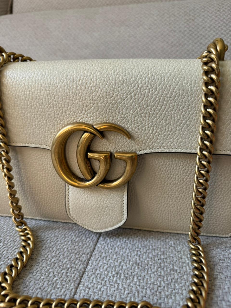 A sophisticated blend of modern elegance and signature design, the GG Marmont Medium Chain Handle bag is a timeless piece from Gucci. Crafted from smooth calfskin leather in a refined Mystic White shade, it is defined by the iconic Double G hardware and softly structured silhouette. With its top handle and chain strap combination, this piece transitions effortlessly from day to evening, offering both elegance and versatility.