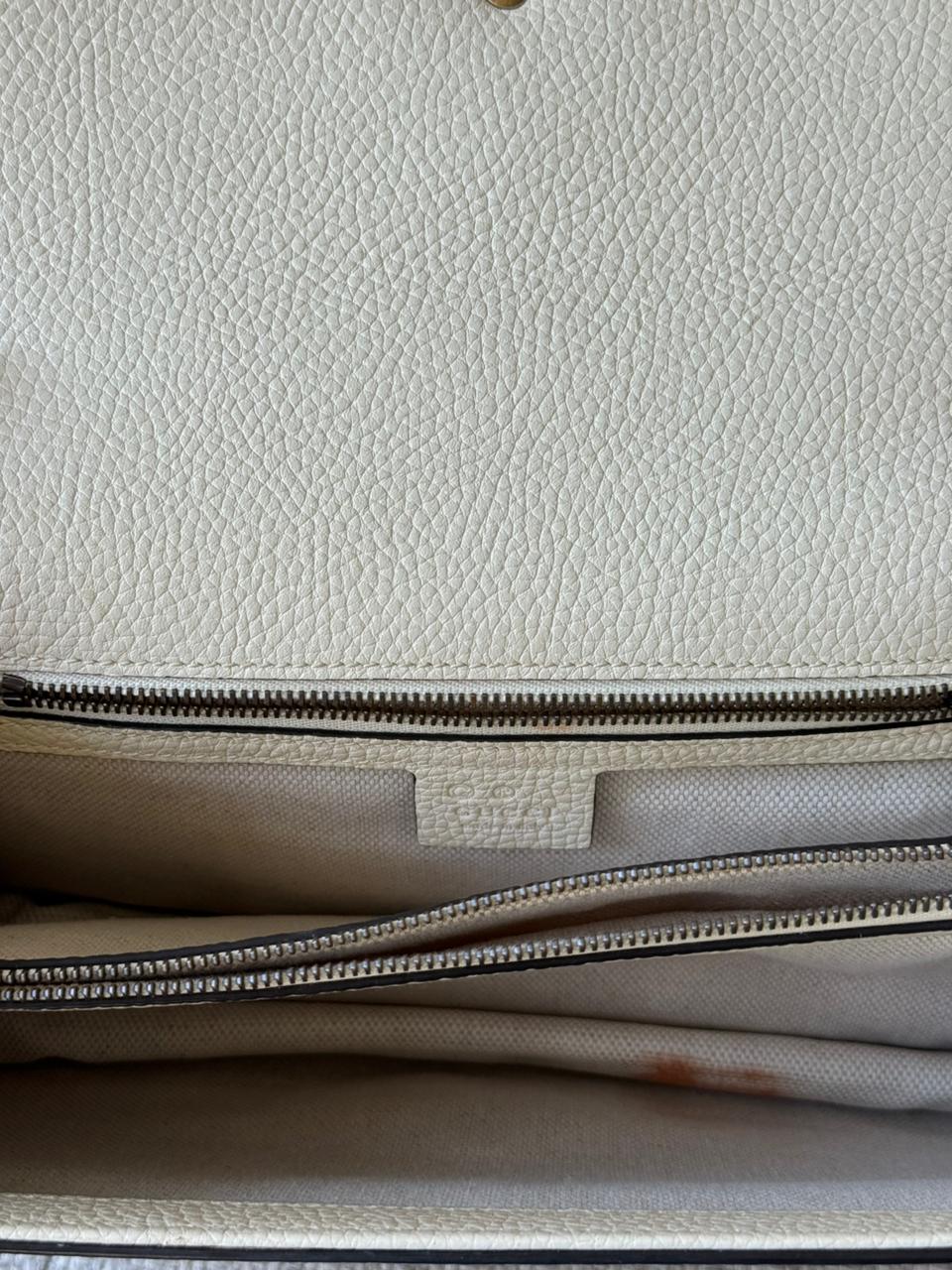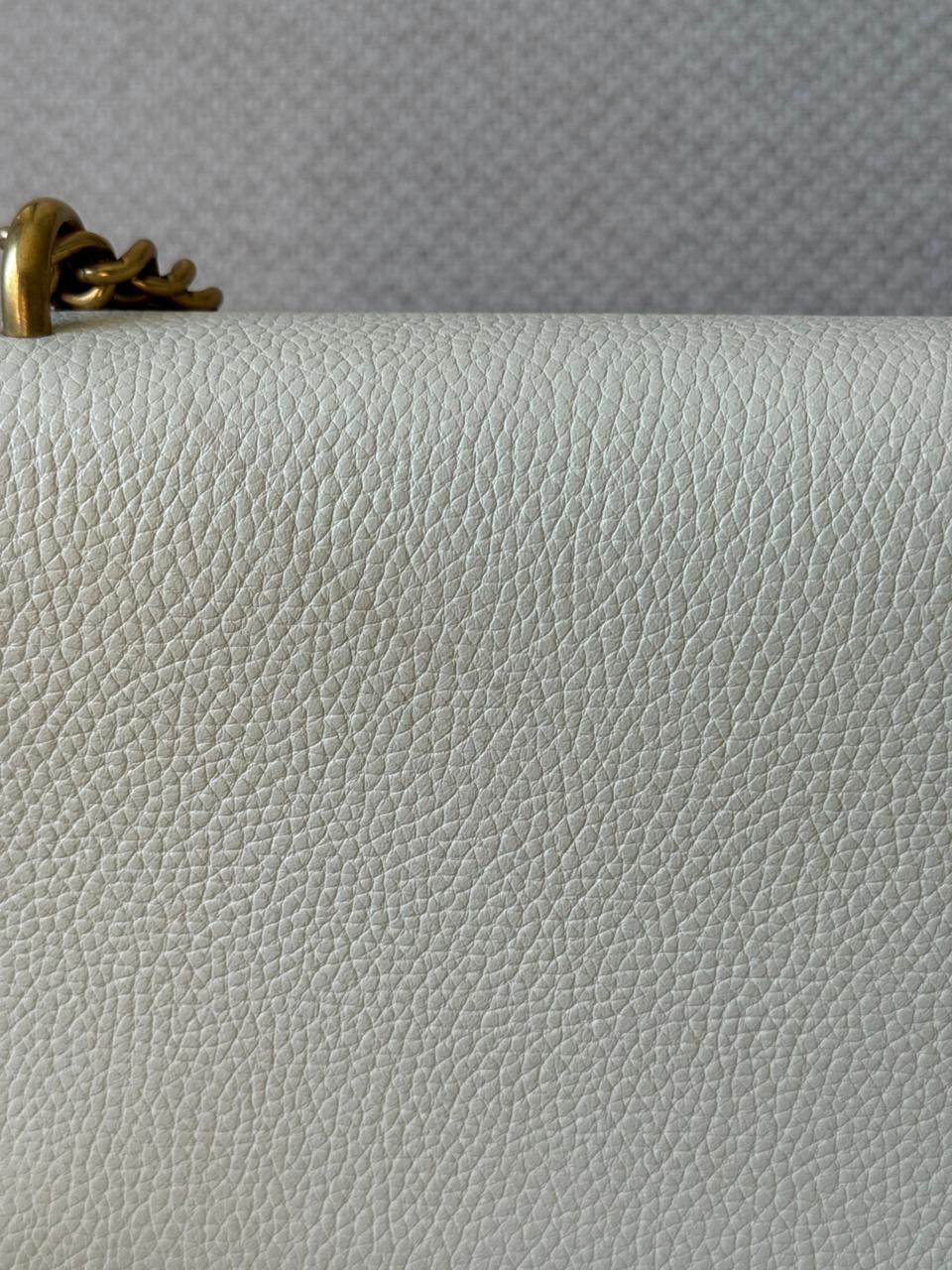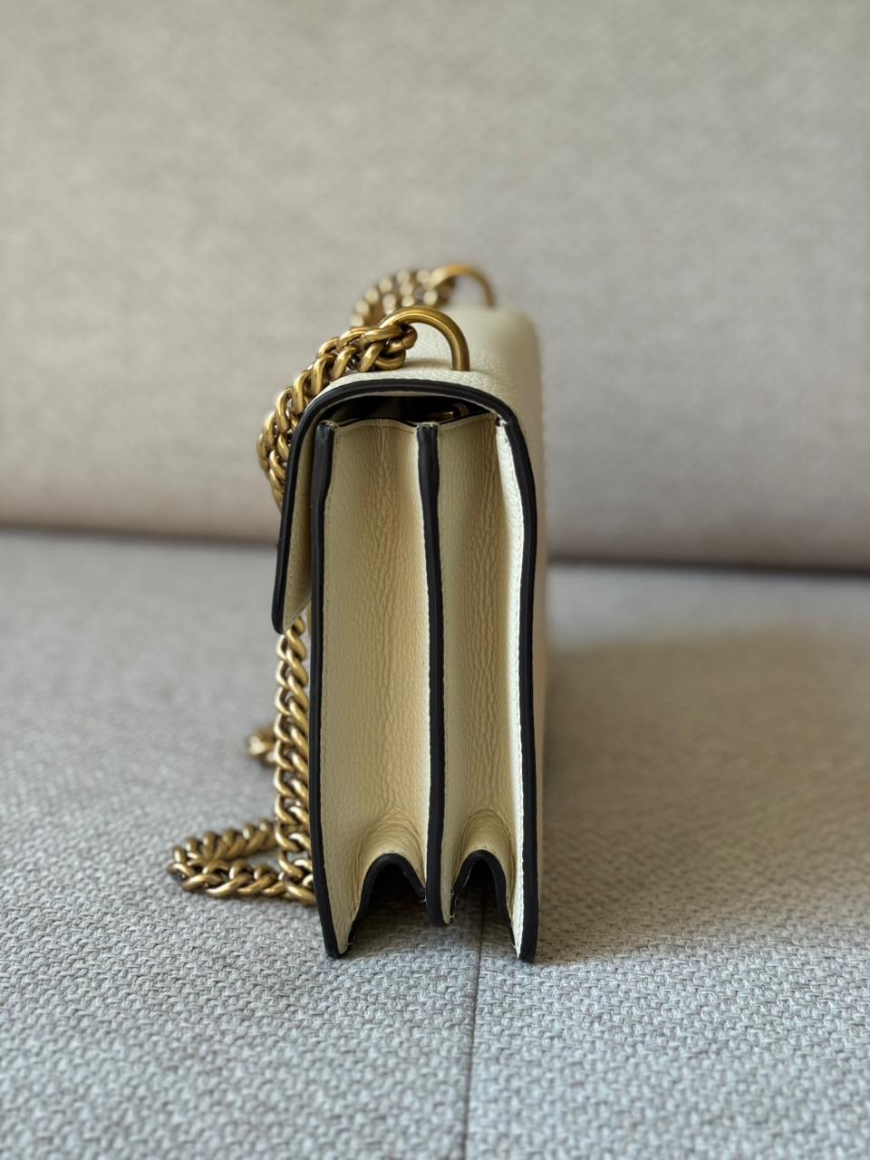 A sophisticated blend of modern elegance and signature design, the GG Marmont Medium Chain Handle bag is a timeless piece from Gucci. Crafted from smooth calfskin leather in a refined Mystic White shade, it is defined by the iconic Double G hardware and softly structured silhouette. With its top handle and chain strap combination, this piece transitions effortlessly from day to evening, offering both elegance and versatility.
