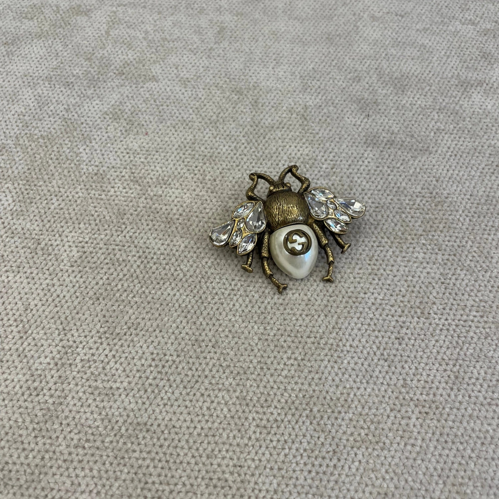 This elegant Gucci GG Bee Brooch features the iconic GG logo and a delicate bee motif. Handcrafted with precision and attention to detail, this brooch adds a touch of luxury to any outfit.