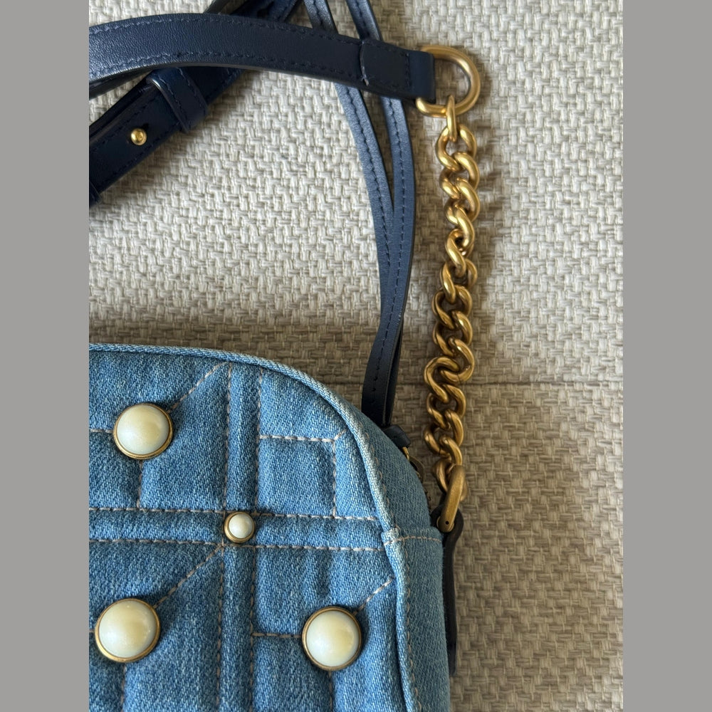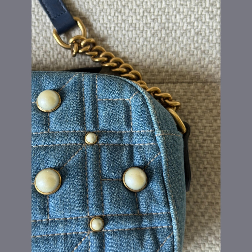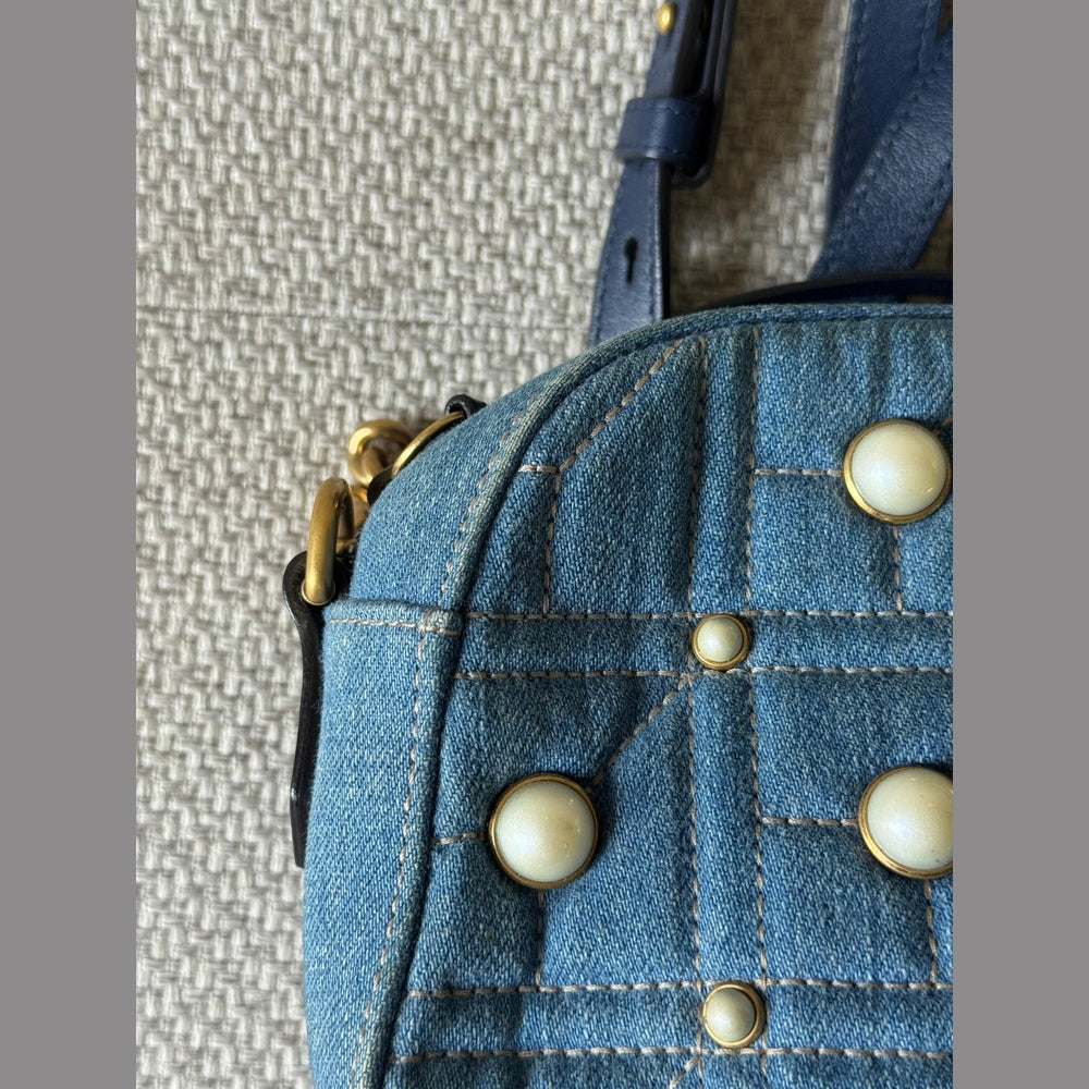 A standout piece from the iconic Marmont line, this Gucci GG Marmont Camera Bag combines the brand’s signature matelassé design with a modern denim twist. The deep blue quilted denim is beautifully contrasted with cream pearl embellishments arranged around the classic double-G emblem, giving the bag a feminine yet edgy character.
