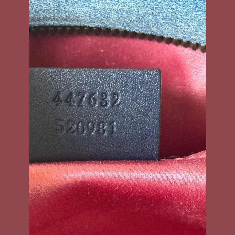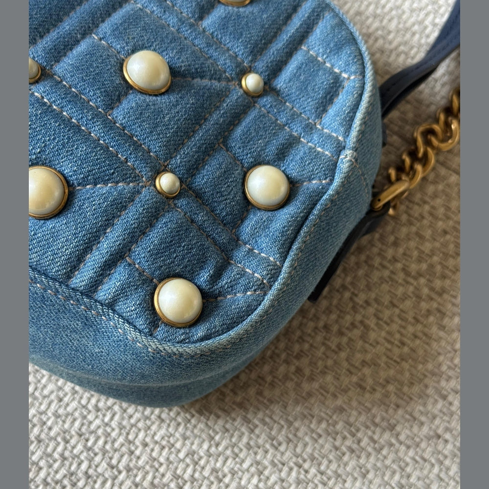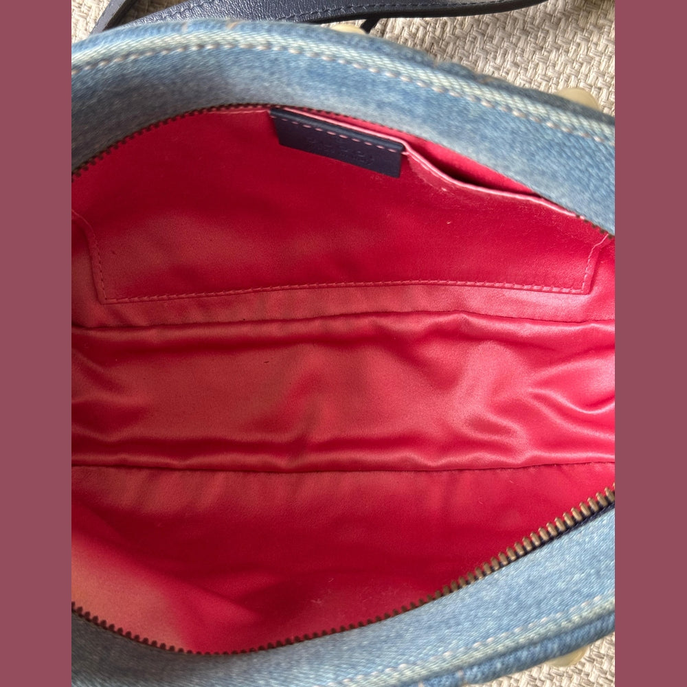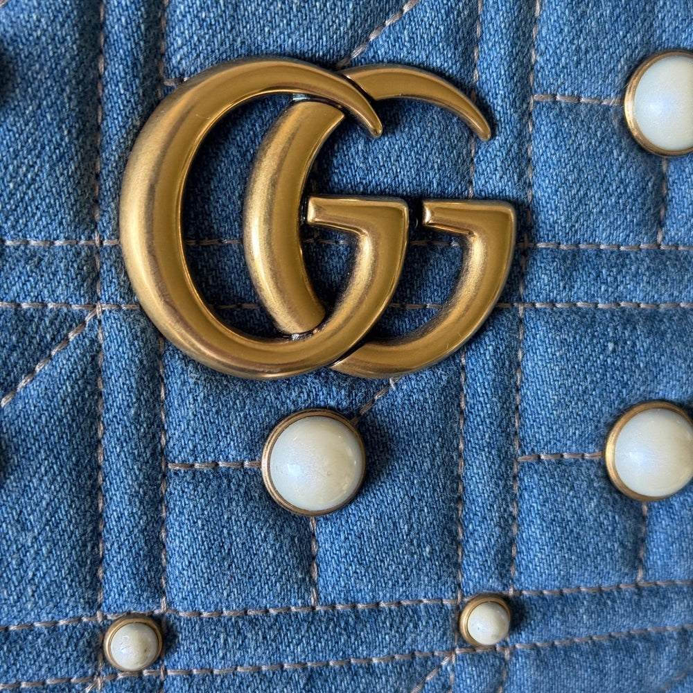 A standout piece from the iconic Marmont line, this Gucci GG Marmont Camera Bag combines the brand’s signature matelassé design with a modern denim twist. The deep blue quilted denim is beautifully contrasted with cream pearl embellishments arranged around the classic double-G emblem, giving the bag a feminine yet edgy character.