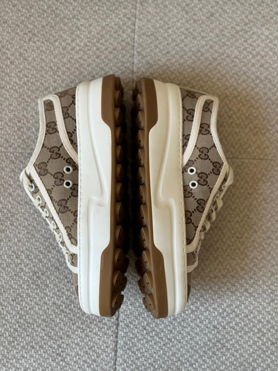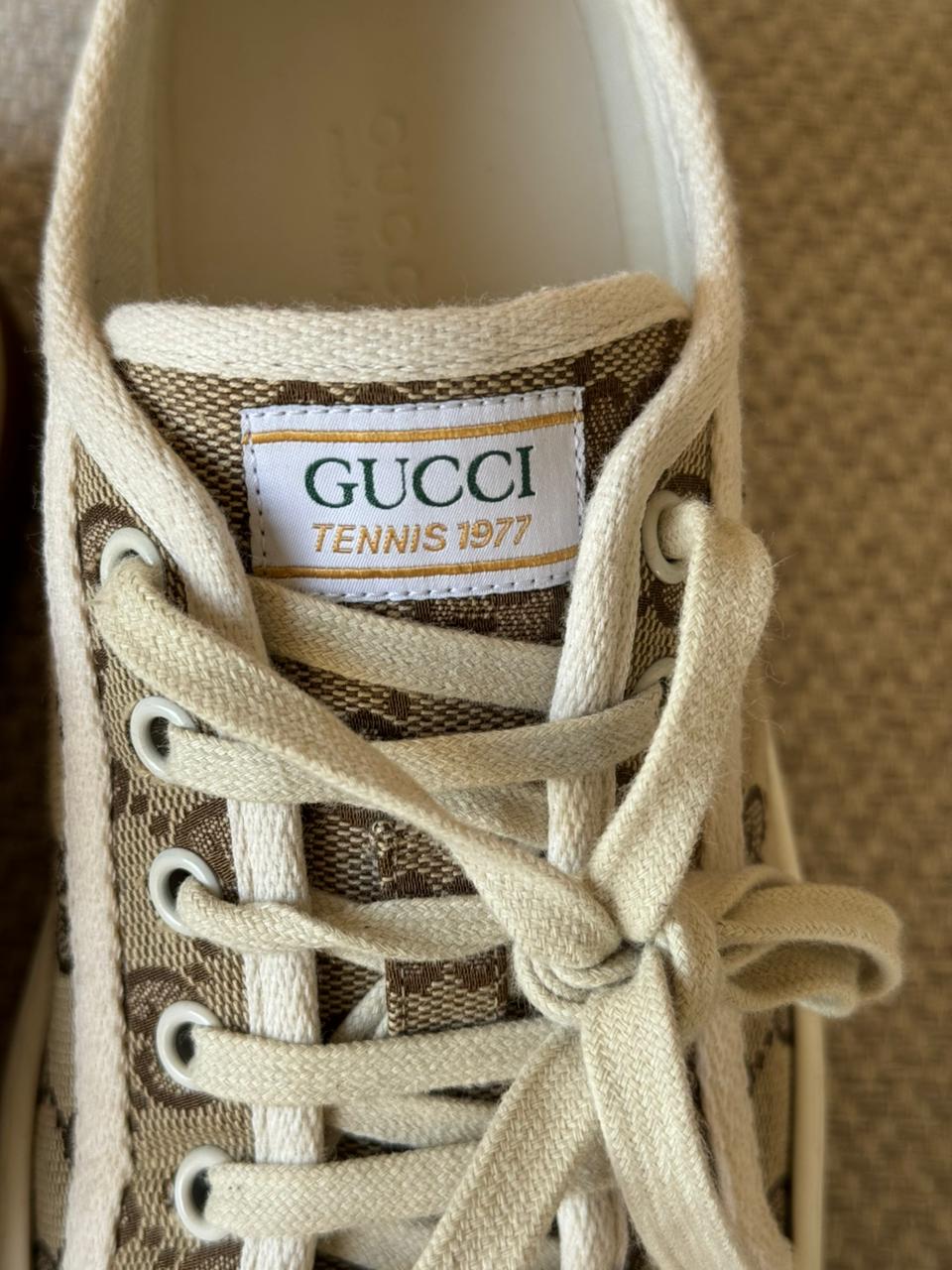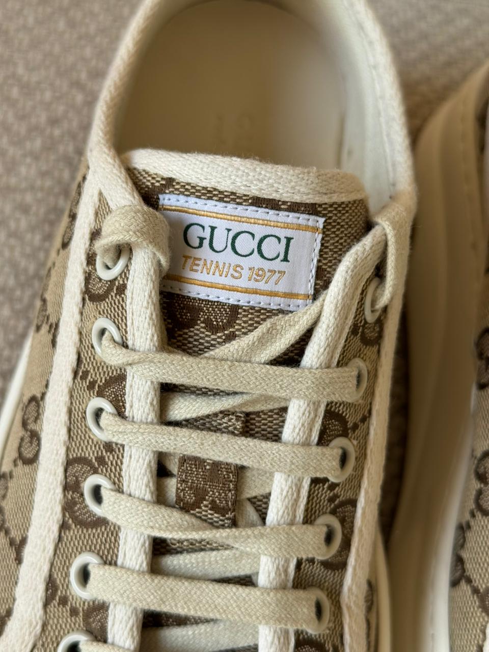 A timeless fusion of heritage and casual elegance, the Gucci GG Tennis 1977 sneakers showcase the House’s iconic monogram in a refined, everyday silhouette. Crafted from GG Supreme canvas with contrasting white trim, this pair blends vintage inspiration with modern comfort. Effortlessly versatile, they add a polished touch to both relaxed and elevated looks.