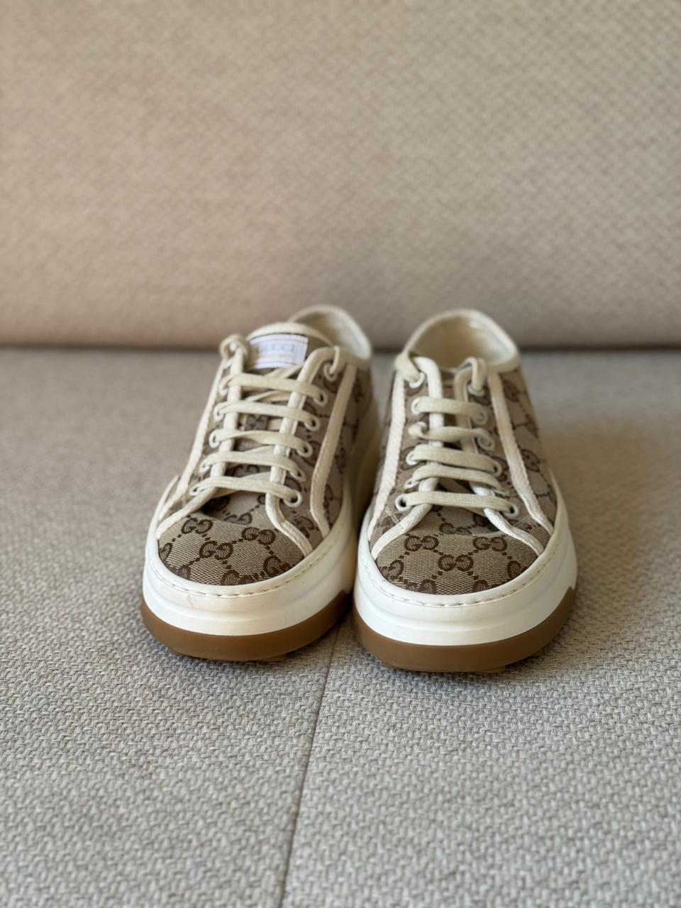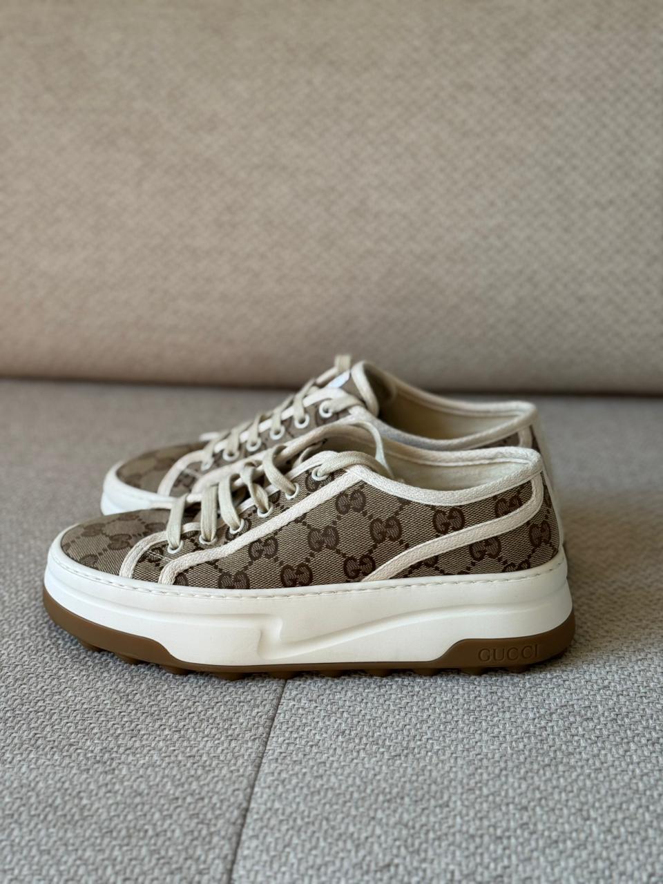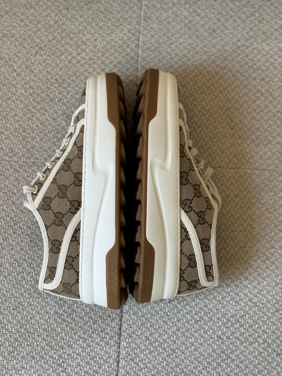 A timeless fusion of heritage and casual elegance, the Gucci GG Tennis 1977 sneakers showcase the House’s iconic monogram in a refined, everyday silhouette. Crafted from GG Supreme canvas with contrasting white trim, this pair blends vintage inspiration with modern comfort. Effortlessly versatile, they add a polished touch to both relaxed and elevated looks.