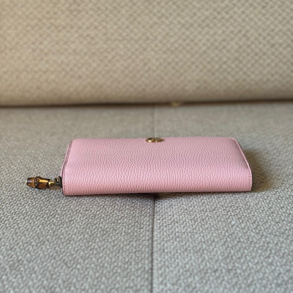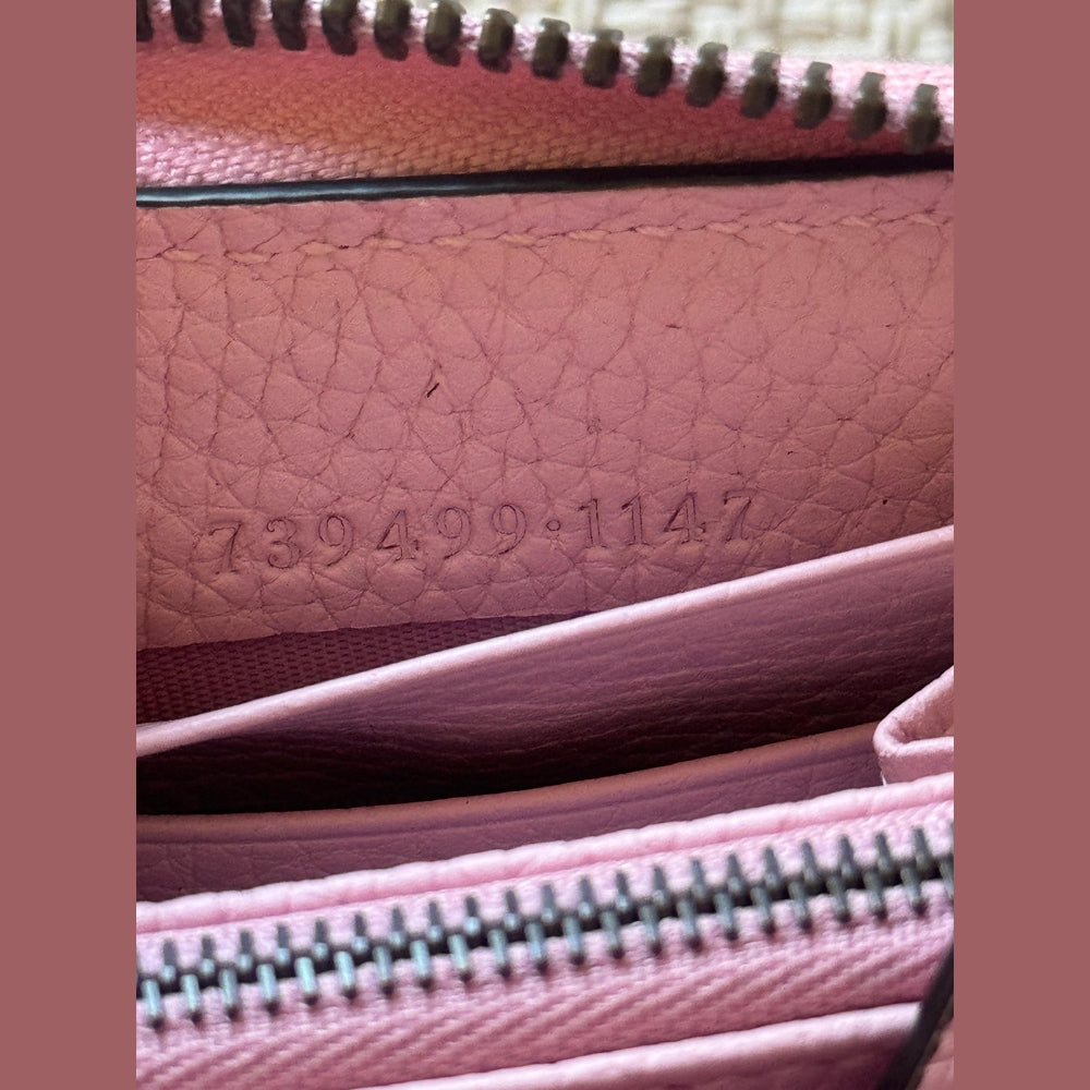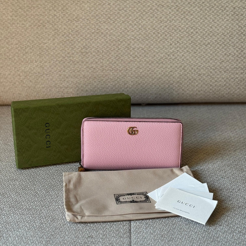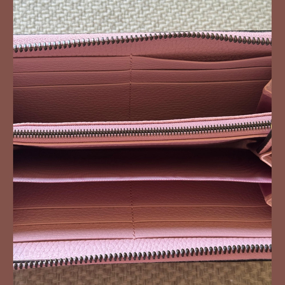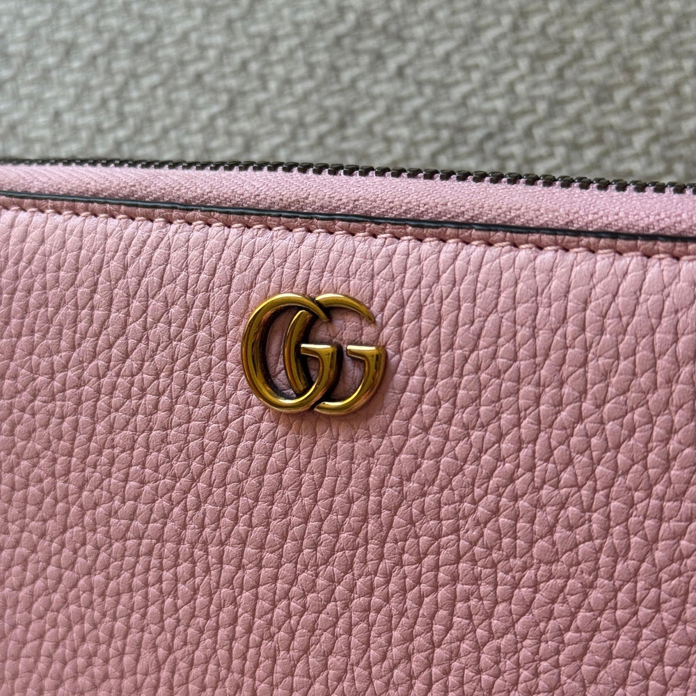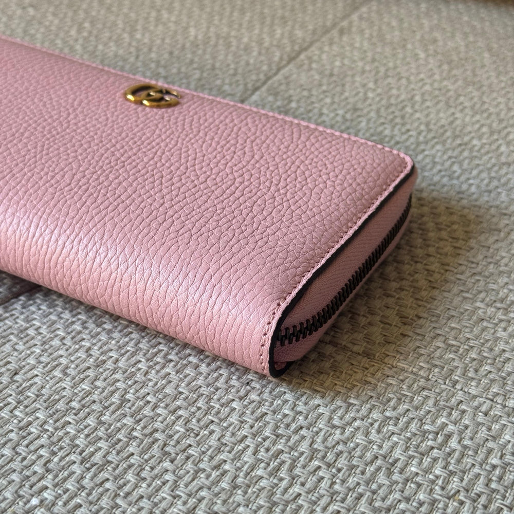 This Gucci GG Marmont zip-around wallet is crafted from soft, light pink pebbled leather and finished with the signature gold GG hardware for a refined, feminine touch. Designed for everyday practicality, it opens to a spacious, well-organized interior with card slots, compartments, and a secure zip section for coins.
