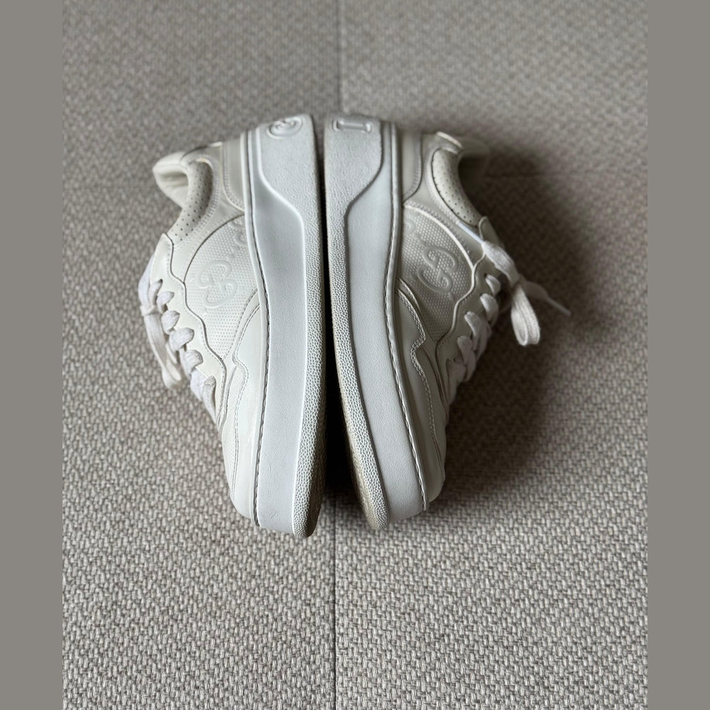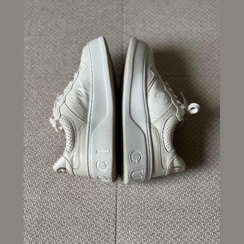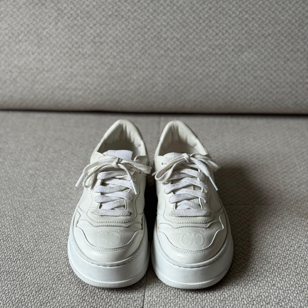 These Gucci sneakers combine sporty comfort with the brand’s unmistakable luxury aesthetic. Crafted in Italy from smooth white leather, they feature the signature GG embossed motif throughout, adding a subtle touch of texture and sophistication. The low-top silhouette is complemented by tonal laces, a rounded toe, and a rubber sole for everyday comfort and style. Perfect for elevating casual looks with a refined designer finish.