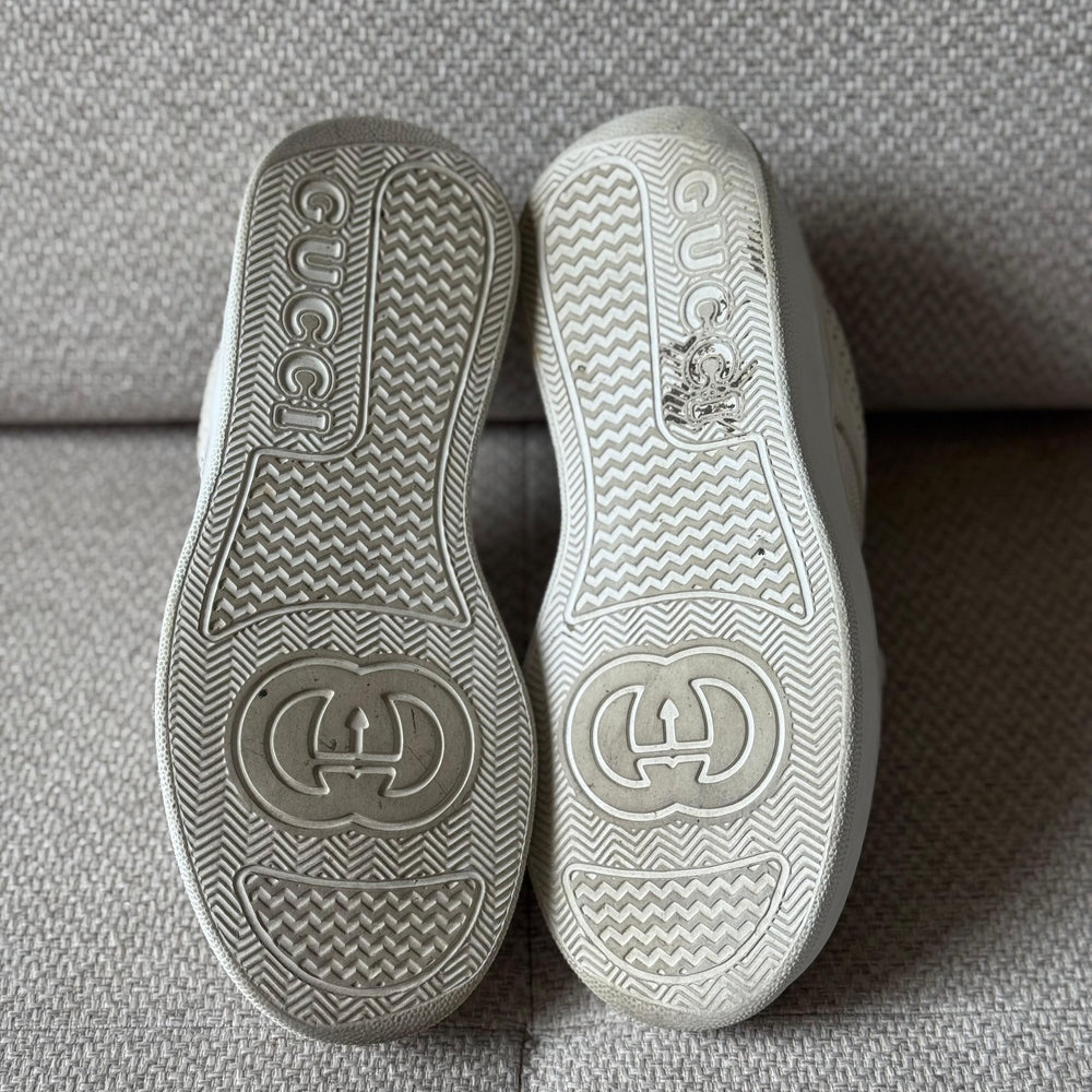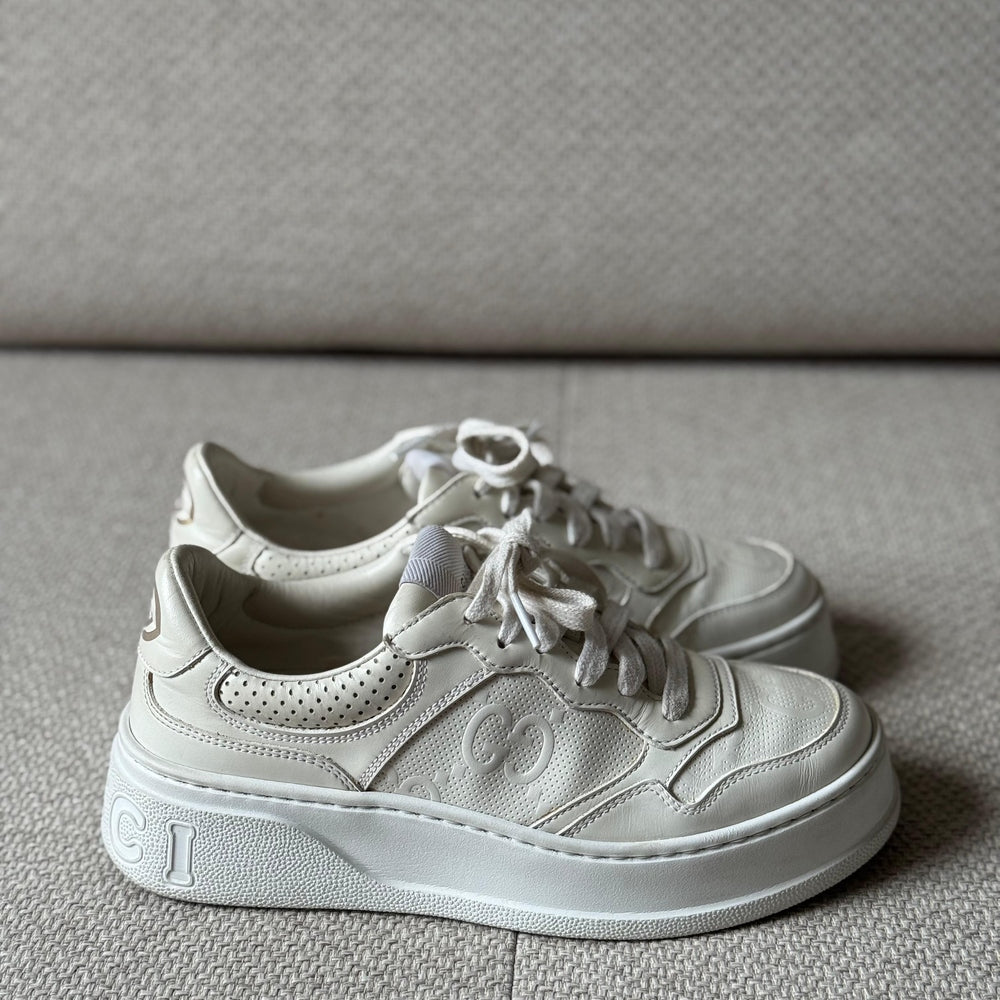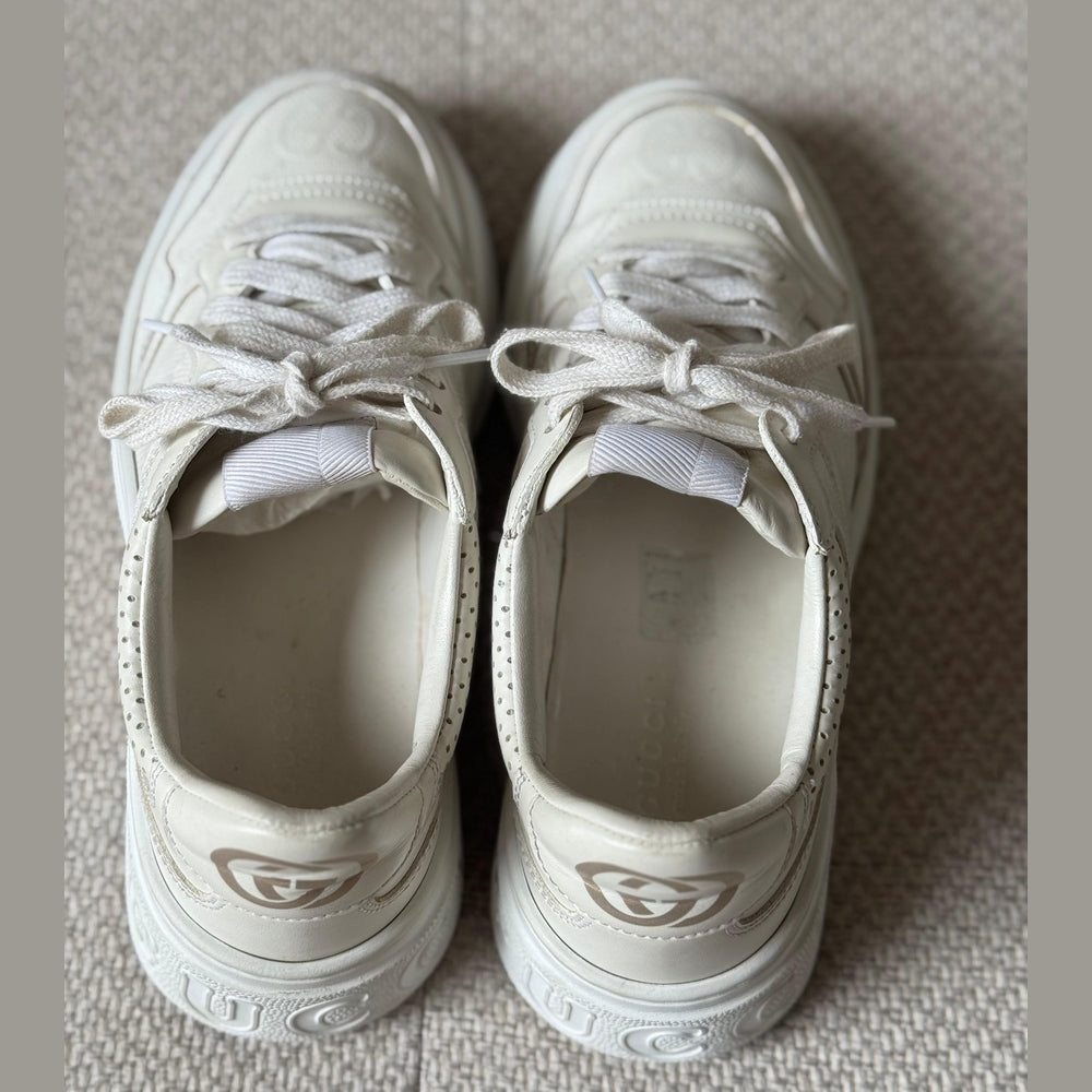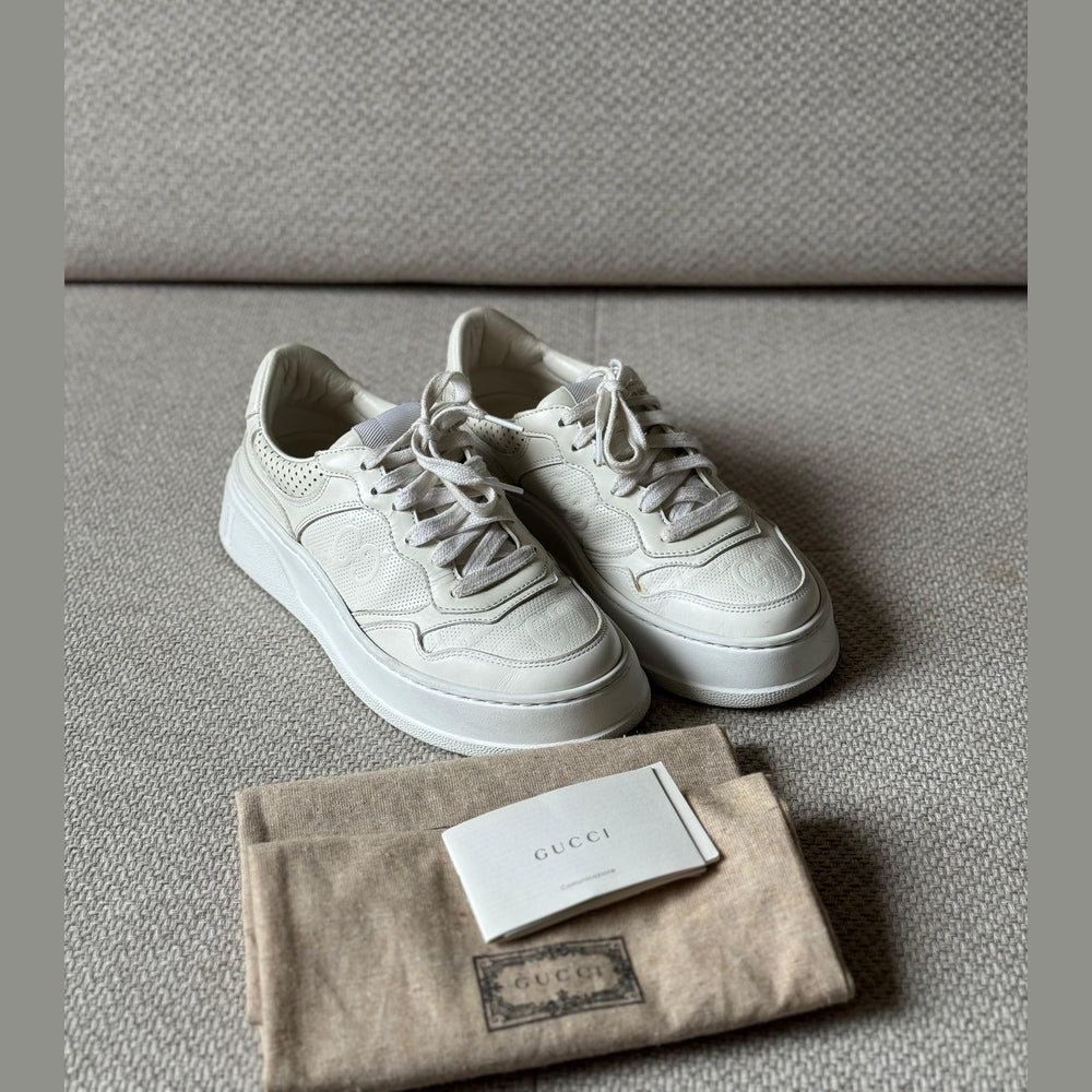 These Gucci sneakers combine sporty comfort with the brand’s unmistakable luxury aesthetic. Crafted in Italy from smooth white leather, they feature the signature GG embossed motif throughout, adding a subtle touch of texture and sophistication. The low-top silhouette is complemented by tonal laces, a rounded toe, and a rubber sole for everyday comfort and style. Perfect for elevating casual looks with a refined designer finish.
