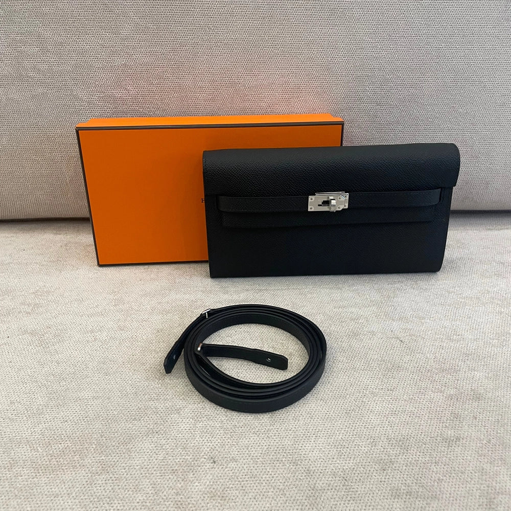 A modern interpretation of one of Hermès' most iconic designs, the Kelly To Go Wallet seamlessly blends elegance, functionality, and versatility. Inspired by the legendary Kelly bag, this chic piece features the signature Kelly turn-lock closure and classic structured silhouette reimagined as a compact, wearable wallet. The Kelly To Go is designed for both day and evening wear. Its detachable leather strap transforms it from a wallet into a sleek crossbody or clutch, making it the ultimate go-anywhere companion.
