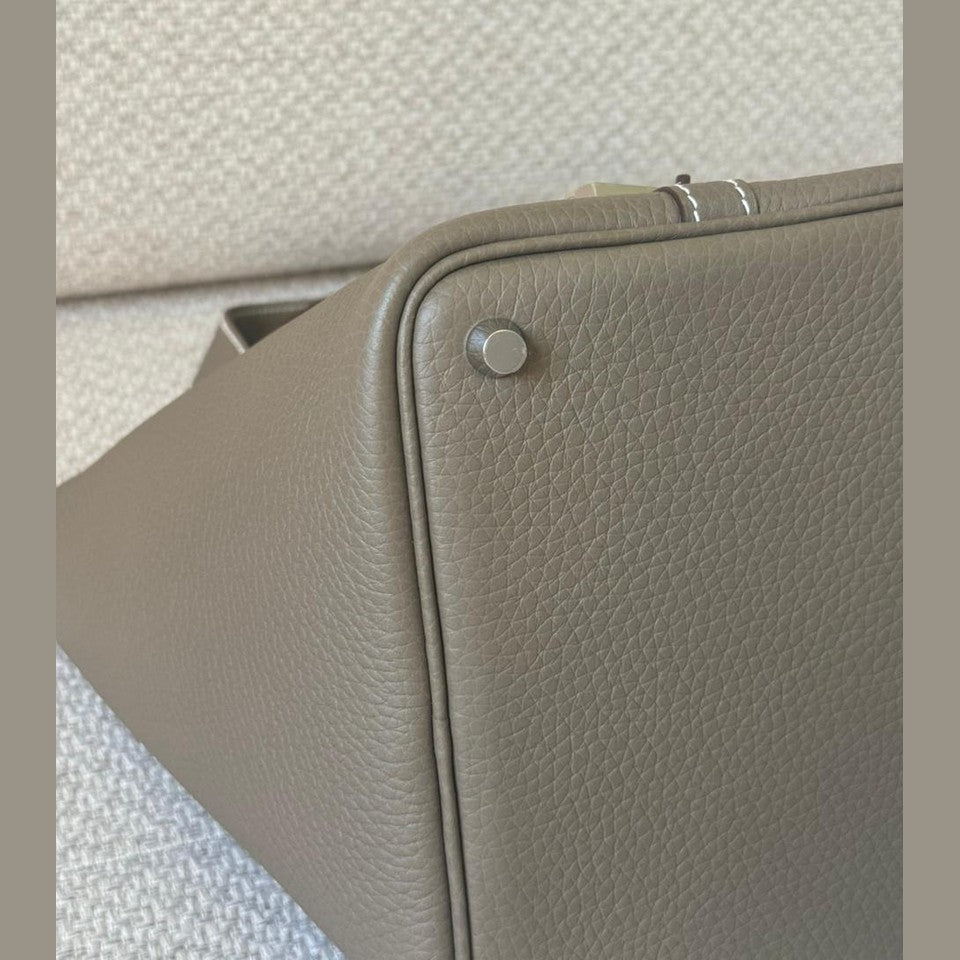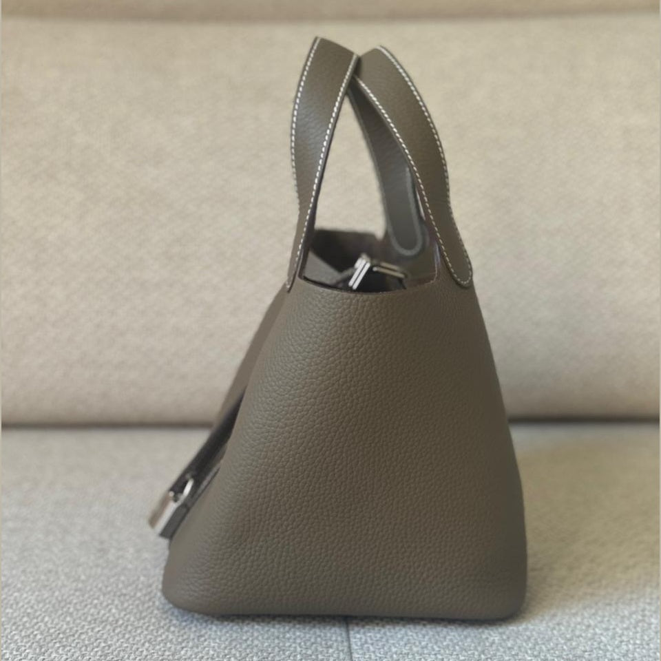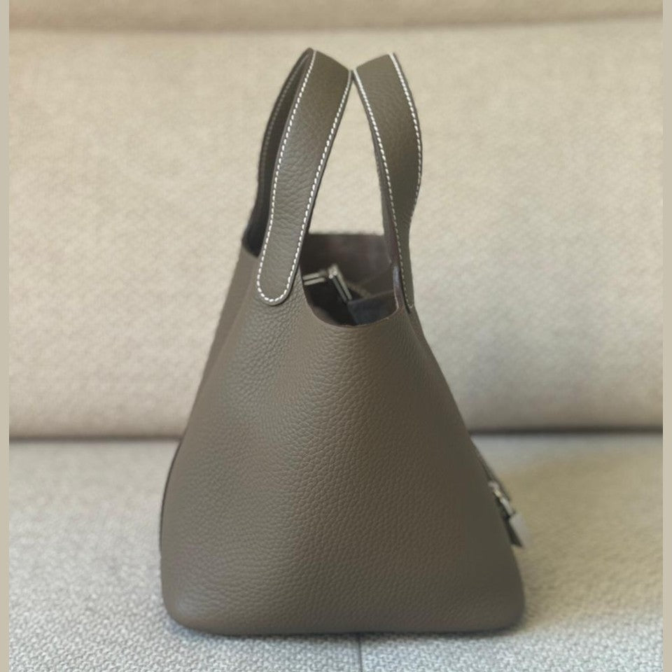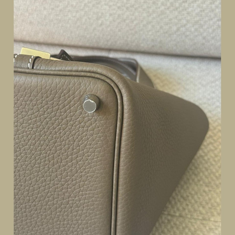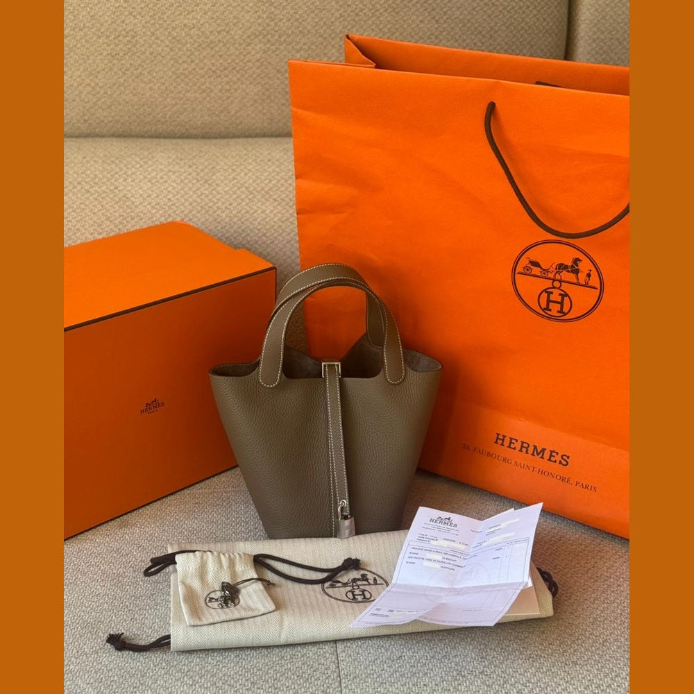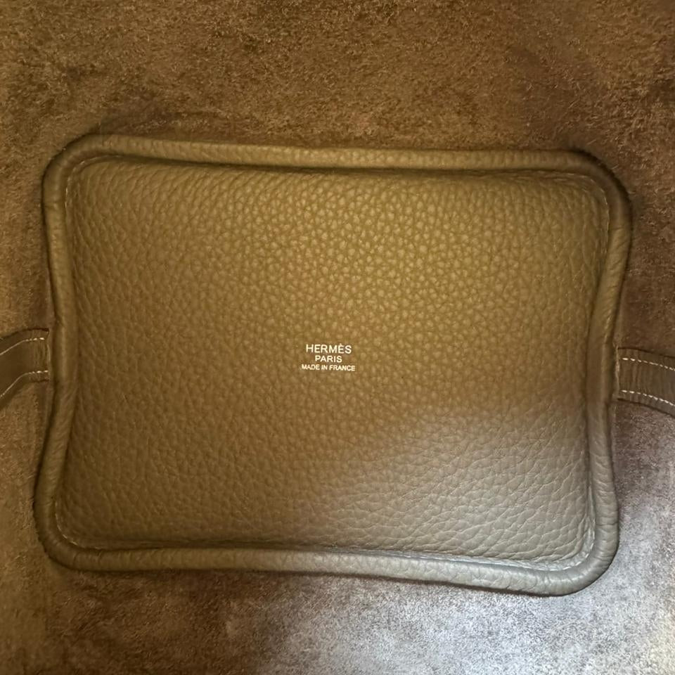 A timeless expression of understated luxury, the Hermès Picotin 18 embodies effortless elegance through its clean lines and relaxed bucket silhouette. Crafted in the iconic Étoupe shade — a perfectly balanced neutral loved for its versatility — and complemented by refined palladium hardware, this piece offers both practicality and quiet sophistication. An everyday essential with enduring appeal, it remains one of Hermès’ most sought-after non-quota bags.