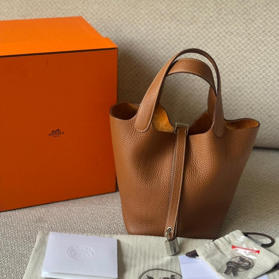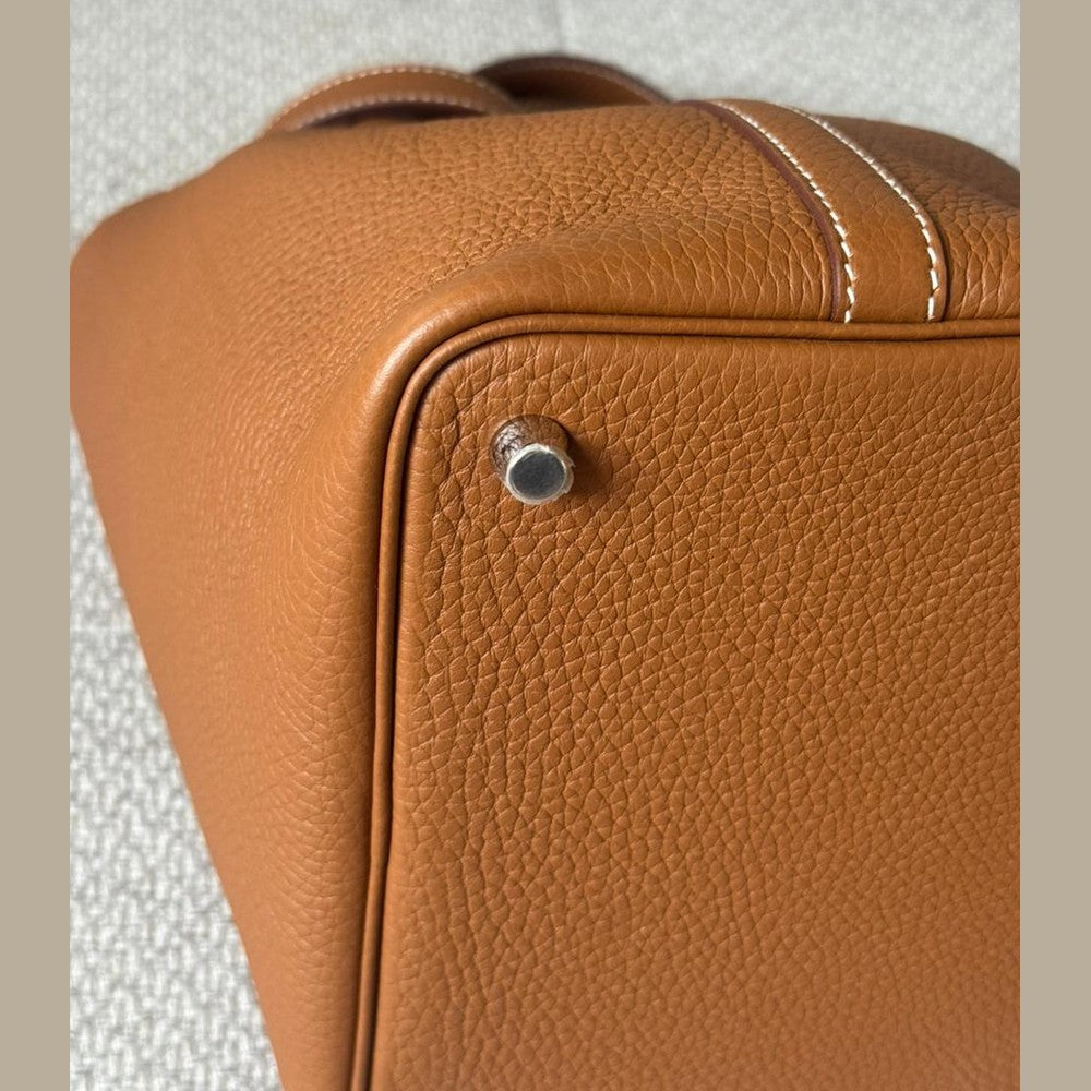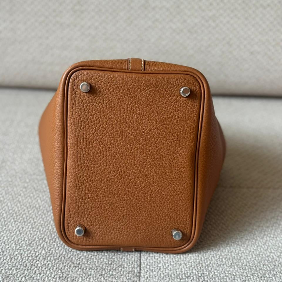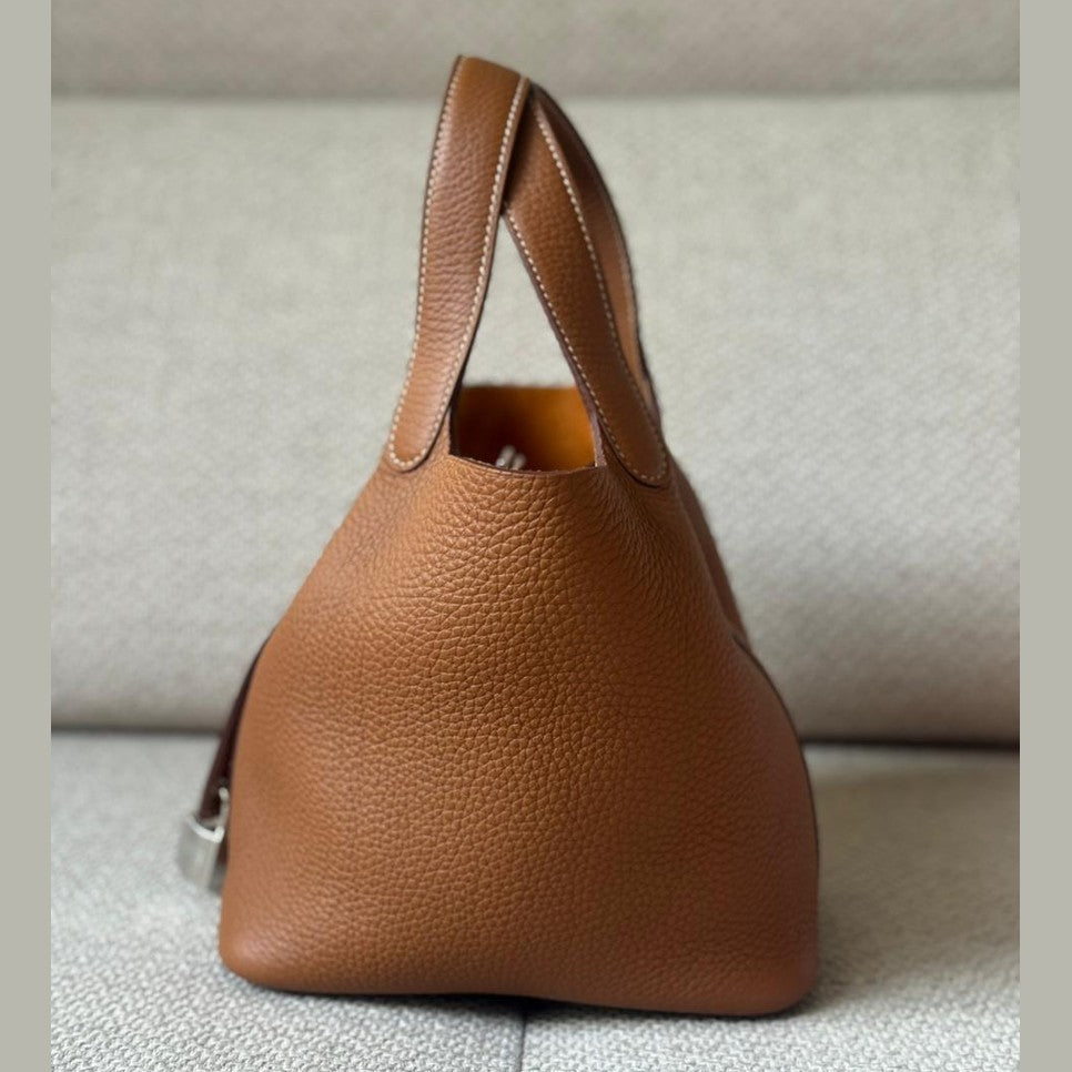 An understated icon of everyday luxury, the Picotin 18 embodies Hermès craftsmanship in its purest form. Designed with a relaxed bucket silhouette and secured with the signature lock detail, this piece in the timeless Gold shade offers effortless elegance with modern practicality.