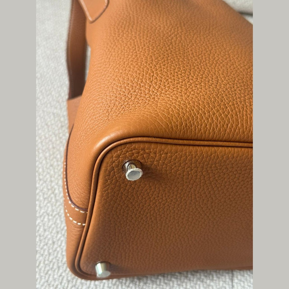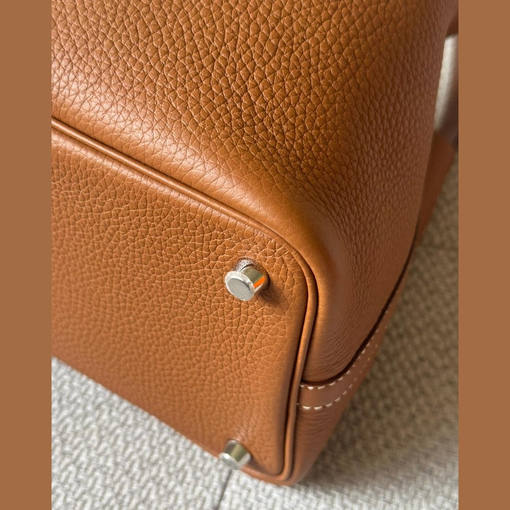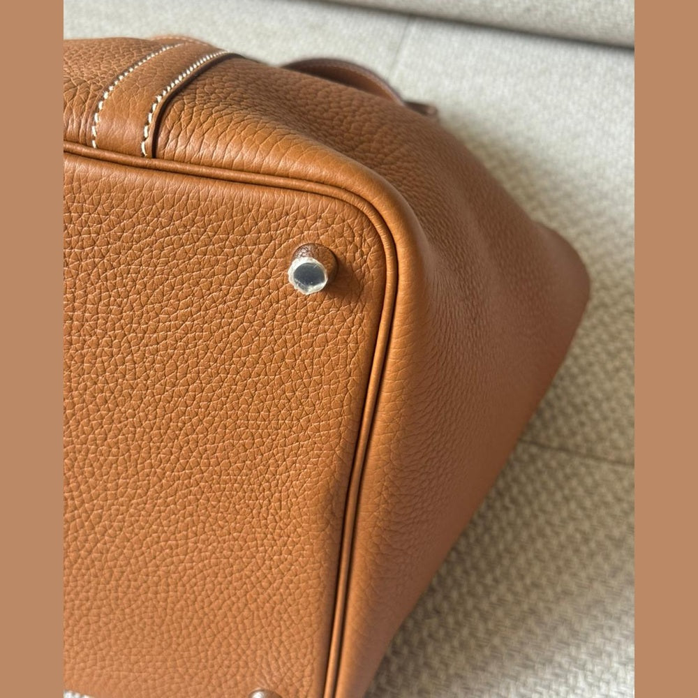 An understated icon of everyday luxury, the Picotin 18 embodies Hermès craftsmanship in its purest form. Designed with a relaxed bucket silhouette and secured with the signature lock detail, this piece in the timeless Gold shade offers effortless elegance with modern practicality.