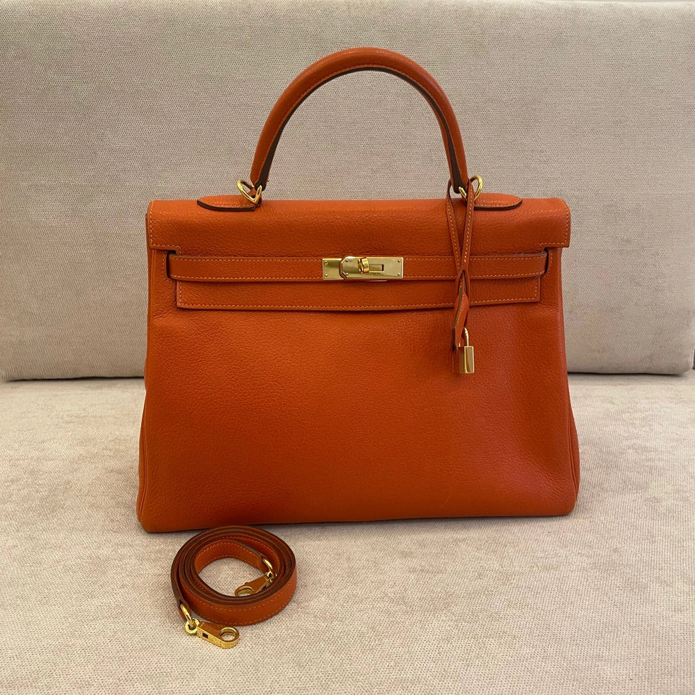 Timeless elegance meets refined craftsmanship in this exquisite Hermès Kelly 35, crafted from rare Chèvre Mysore leather. Known for its fine grain, lightweight feel, and exceptional durability, Chèvre leather offers a subtle sheen that enhances the bag's sophisticated structure. This classic 35 cm silhouette features the iconic Kelly top handle, signature sangles, and a turn-lock closure accented in rich gold hardware. Elegant and versatile, this piece transitions seamlessly from day to evening and remains a coveted symbol of luxury and heritage. Includes a detachable shoulder strap for added styling options, lock and key, Entrupy Certificate, and dustbag.